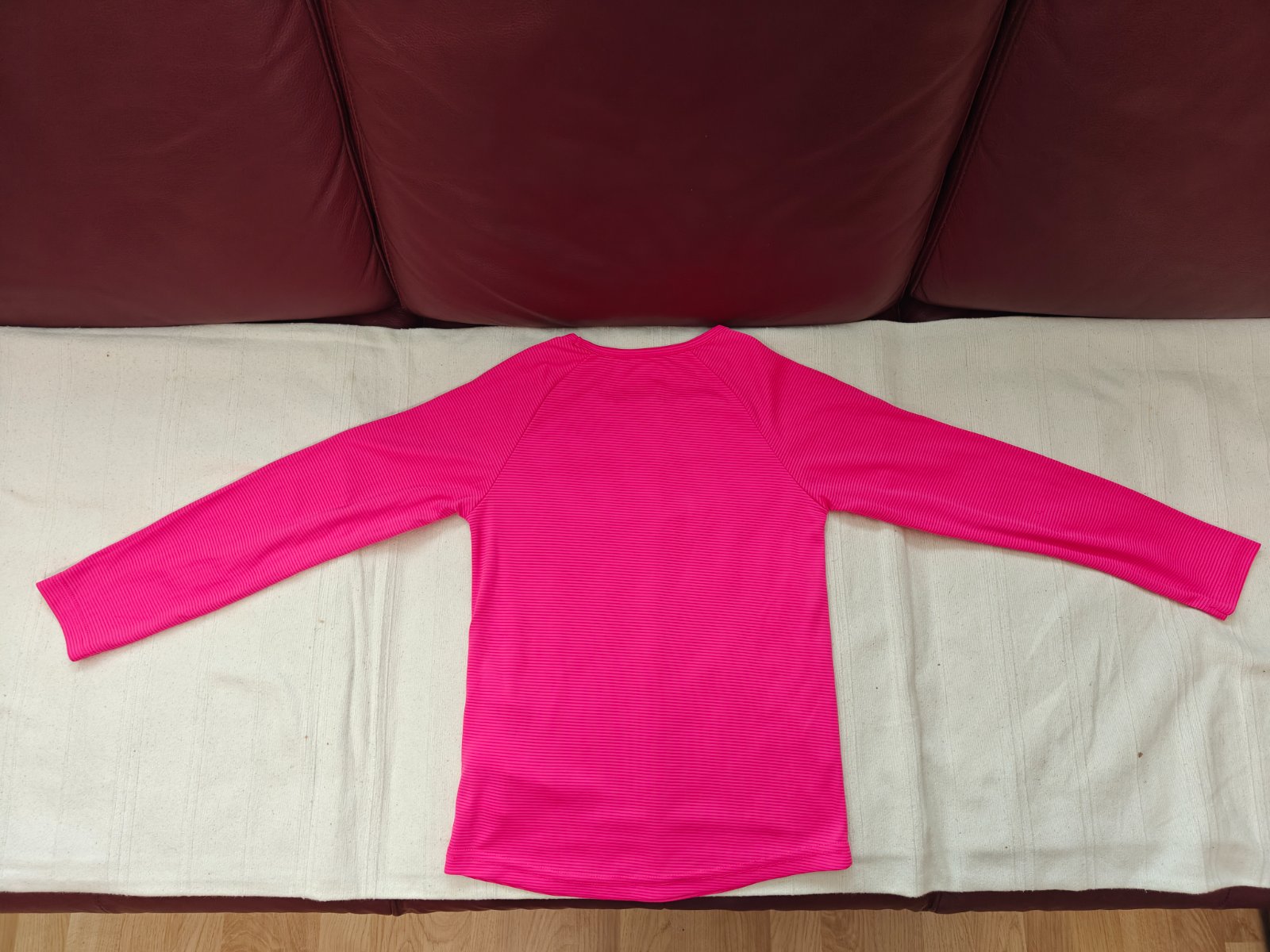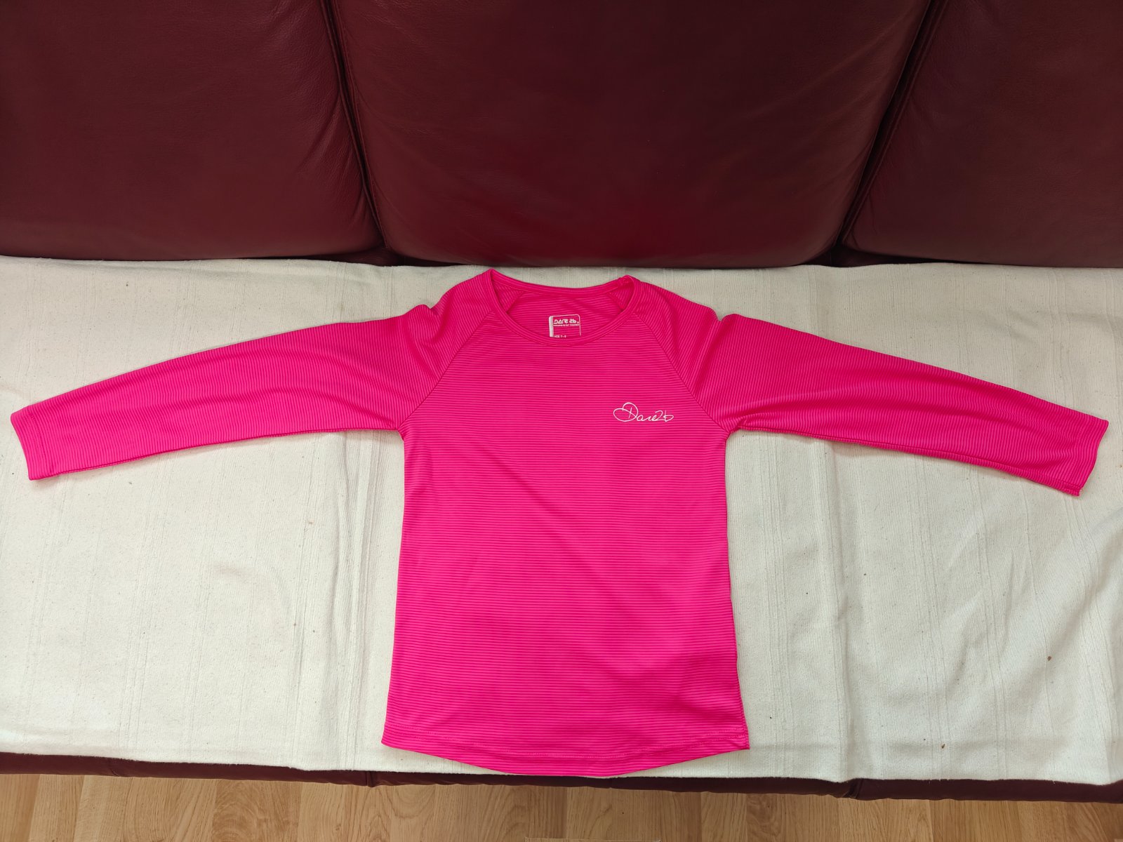 Funkčná súprava termo prádla vo vynikajúcom stave. Veľmi obľúbená. Príjemný tenký materiál. Vhodné do školy, na lyžovanie a iné zimné športy. Značka Dare2b. Šírka nohavíc v páse 26-27 cm. Dĺžka nohavíc vonkajšia 75 cm, vnútorná 51 cm. Šírka trička pod pazuchami 34 cm. Dĺžka rukáva od krku 54 cm. Dcéra nosila vo veľkosti 128-134. Súprava pre vhodná pre štíhle dievča.