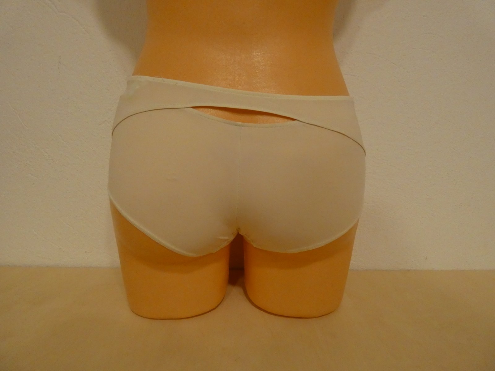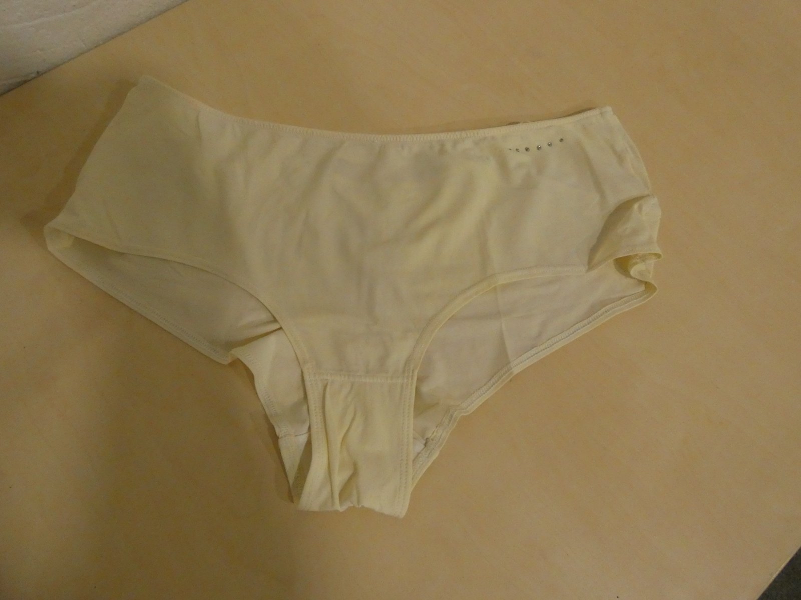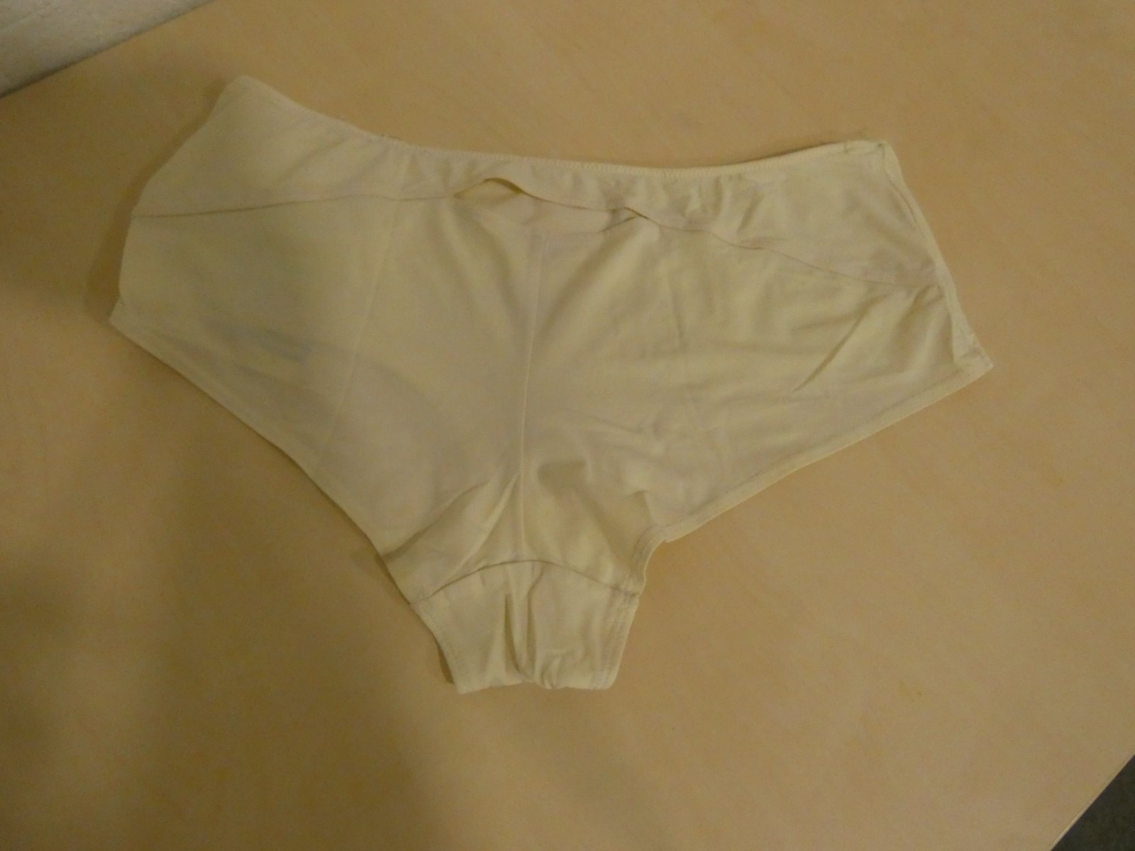 Nosené bez poškodenia. Materiál je 73% polyamid a 27% elastan. Rozmery sú šírka v páse v nenatiahnutom stave 32 cm x 2 a v natiahnutom stave 45 cm x 2, sed je 22 cm.