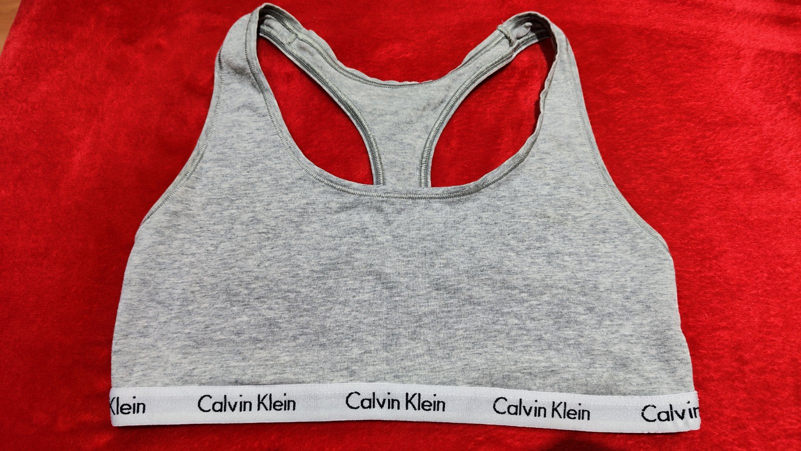Calvin Klein športová podprsenka v šedej farbe, na druhej fotke je vyznačená malinká dierka, je to samozrejme zohľadnené v cene.