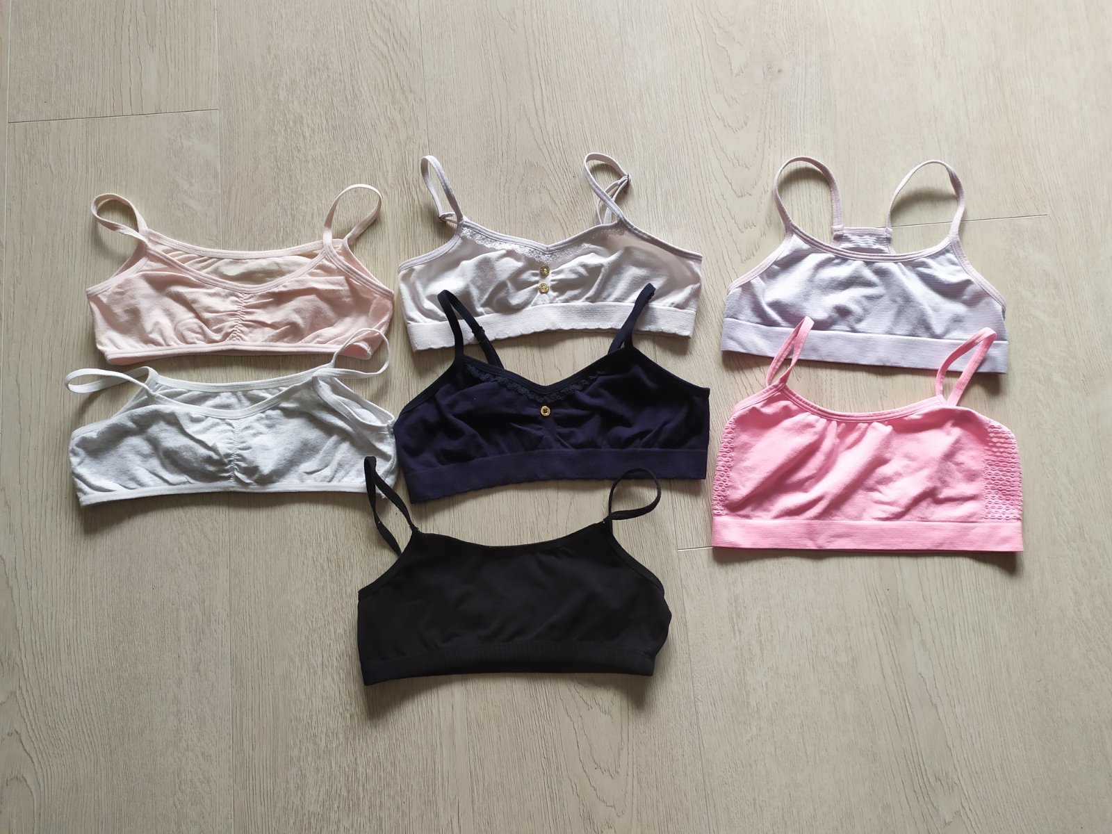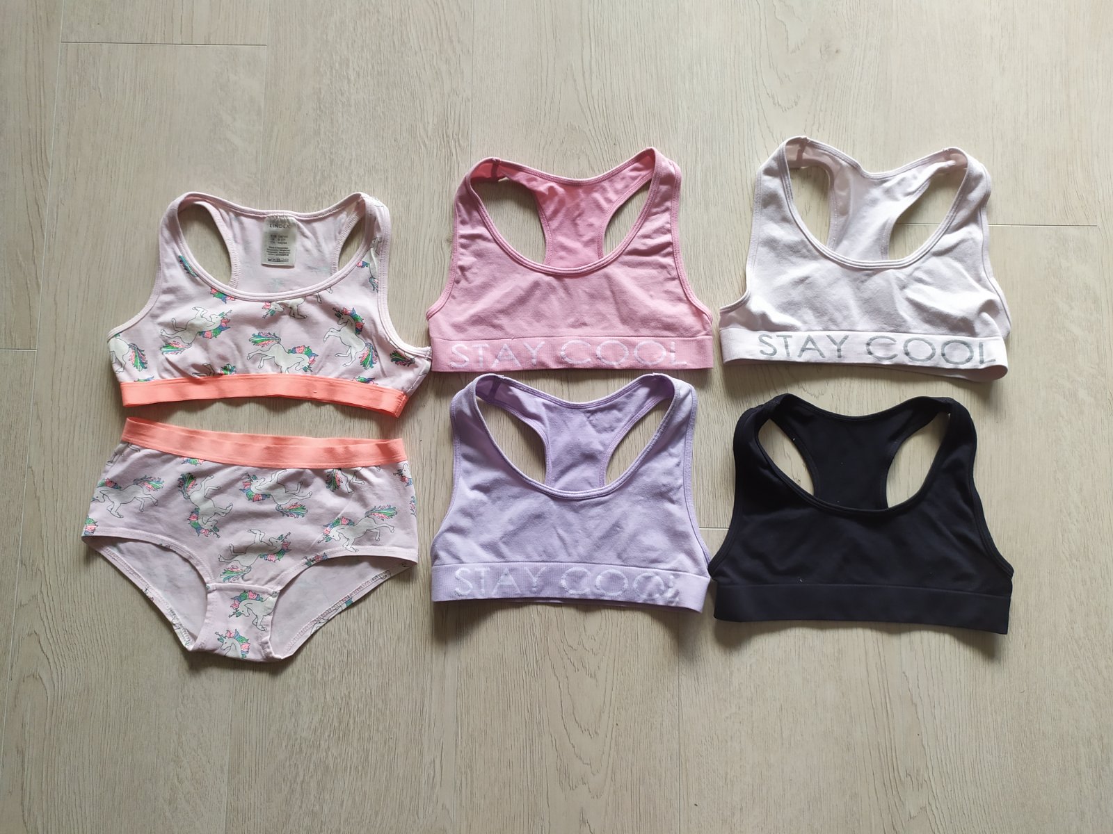 12x podprsenka, k jednej sú nohavičky, k tejto je možné prikúpiť do sady aj nočnú košeľu. Väčšina sú značka Lindex, 3 s ramienkami nie. Vel.134/140, po jednom dieťatku.
