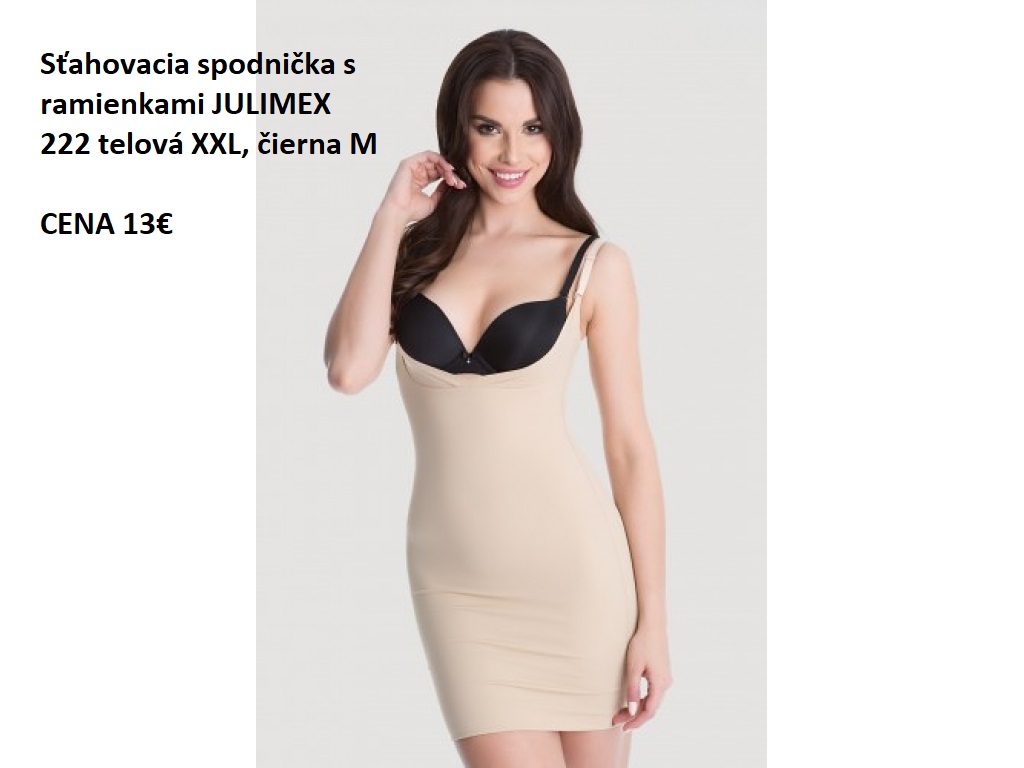 4.MODEL Spodnička JULIMEX 222 (či sťahovacie šaty) na tenkých regulovateľných a odopínacích ramienkach. Diskrétne sploští bruško a vyformuje pás, pekne vyhladí záhyby. Je neviditeľná a nepreznačuje pod oblečením, zamedzí vyhrňovaniu sukní a šiat, pružné ramienka s bežným dĺžkovým nastavením v zadnej časti, inovatívne riešenie ich odopnutia, dĺžka do polovičky stehien (závisí na výške postavy). Materiál: 84% polyamid, 16% elastan. Transparentné ramienka v balení grátis. Máme 1 kus telová XXL, 2 kusy čierna veľkosť M. Cena 13€. Veľkosti: M boky od 96-100cm, XXL boky od 114-118cm.