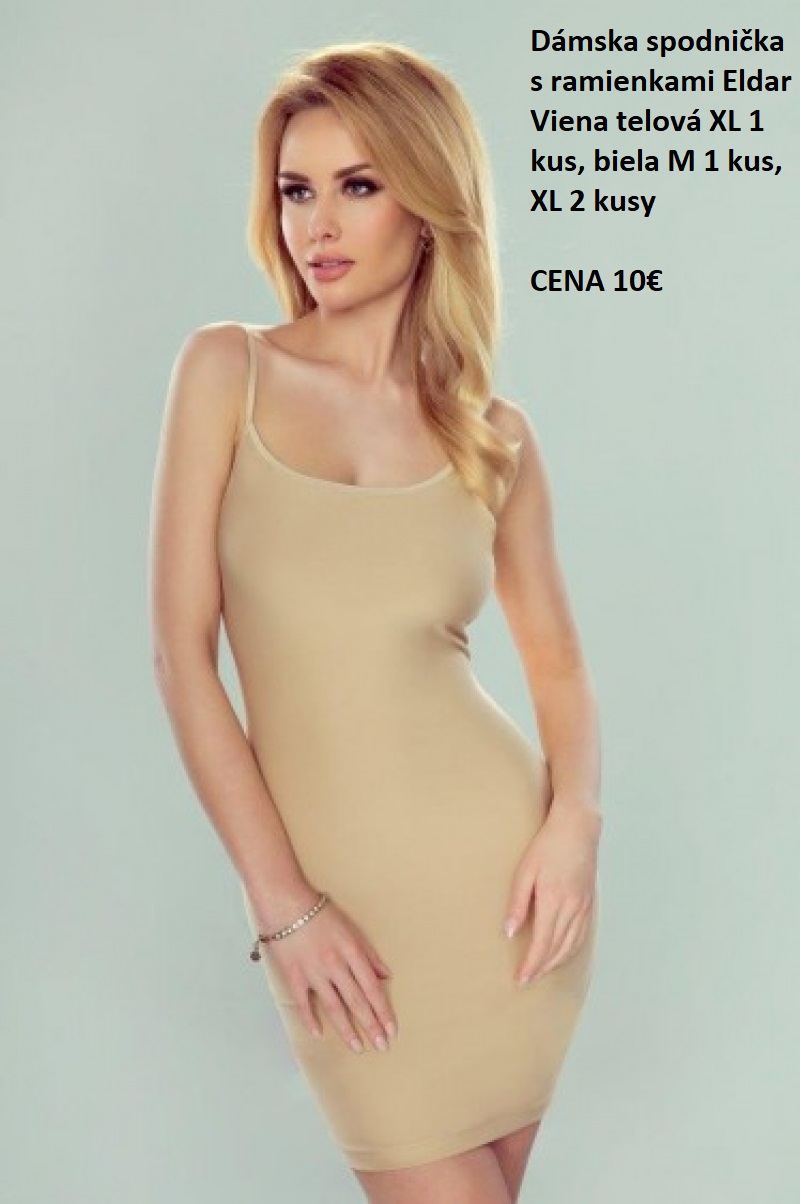 2. MODEL VIENA. Dámska spodnička na tenkých, nastaviteľných ramienakch. Vyrobená z jemného materiálu prispôsobujúcemu sa telu. Ideálna pre letné šaty. Zloženie: 90% polyamid, 10% elastan. CENA 10€. Máme telová XL 1 kus, biela M 1 kus, XL 2 kusy.