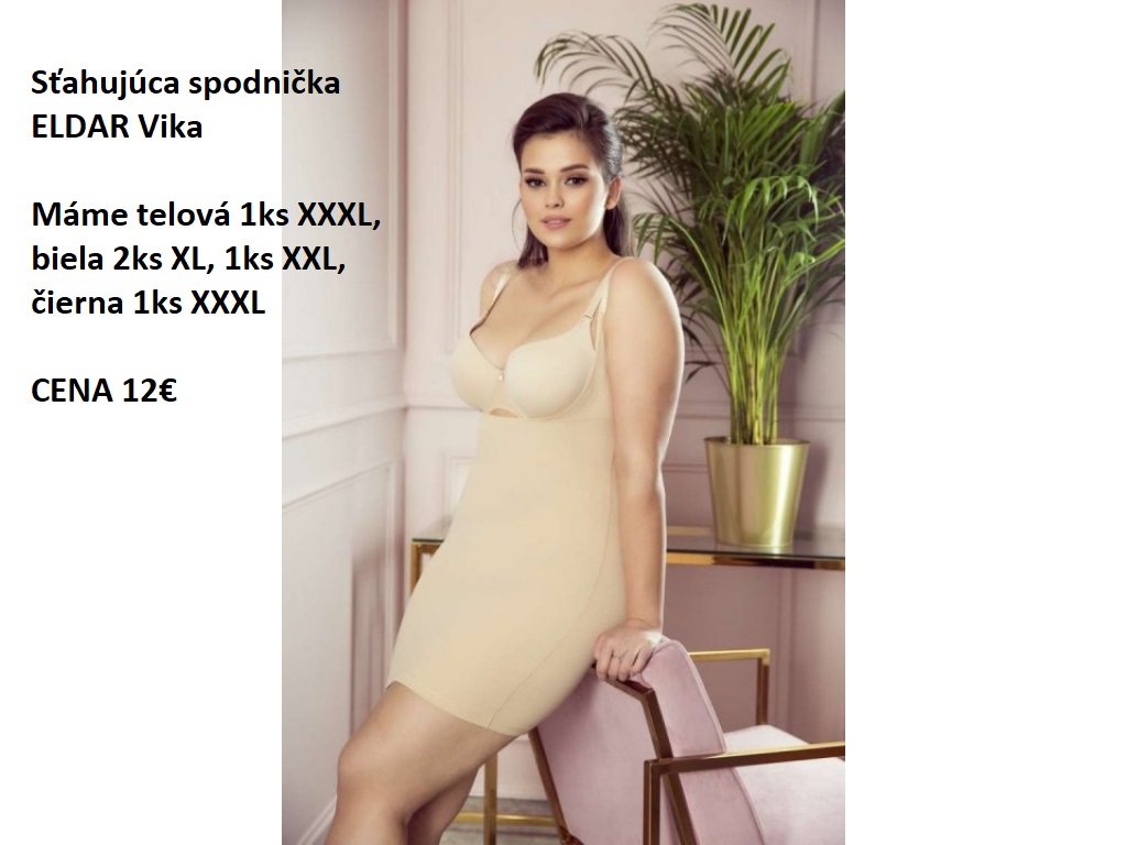 3. MODEL VERSA Zoštíhľujúca, sťahujúca spodnička, ušitá z vysoko kvalitnej látky (tenká, ale pevná zároveň, prilieha k telu ako druhá koža). Sťahovacia spodnička ELDAR Versa s vysokým pásom. Vyrobená z tenkého, pružného materiálu. Modeluje pás, boky a stehná. Pás na vnútornej strane so silikónovým prúžkom. Zloženie: 85% polyamid, 15% elastan. Cena 12€. Máme telovú XXL a XXXL po 1ks.