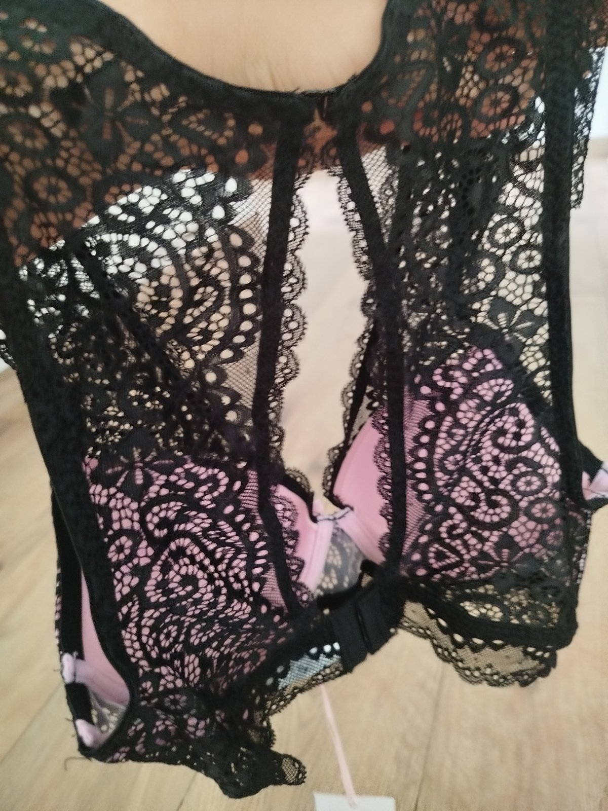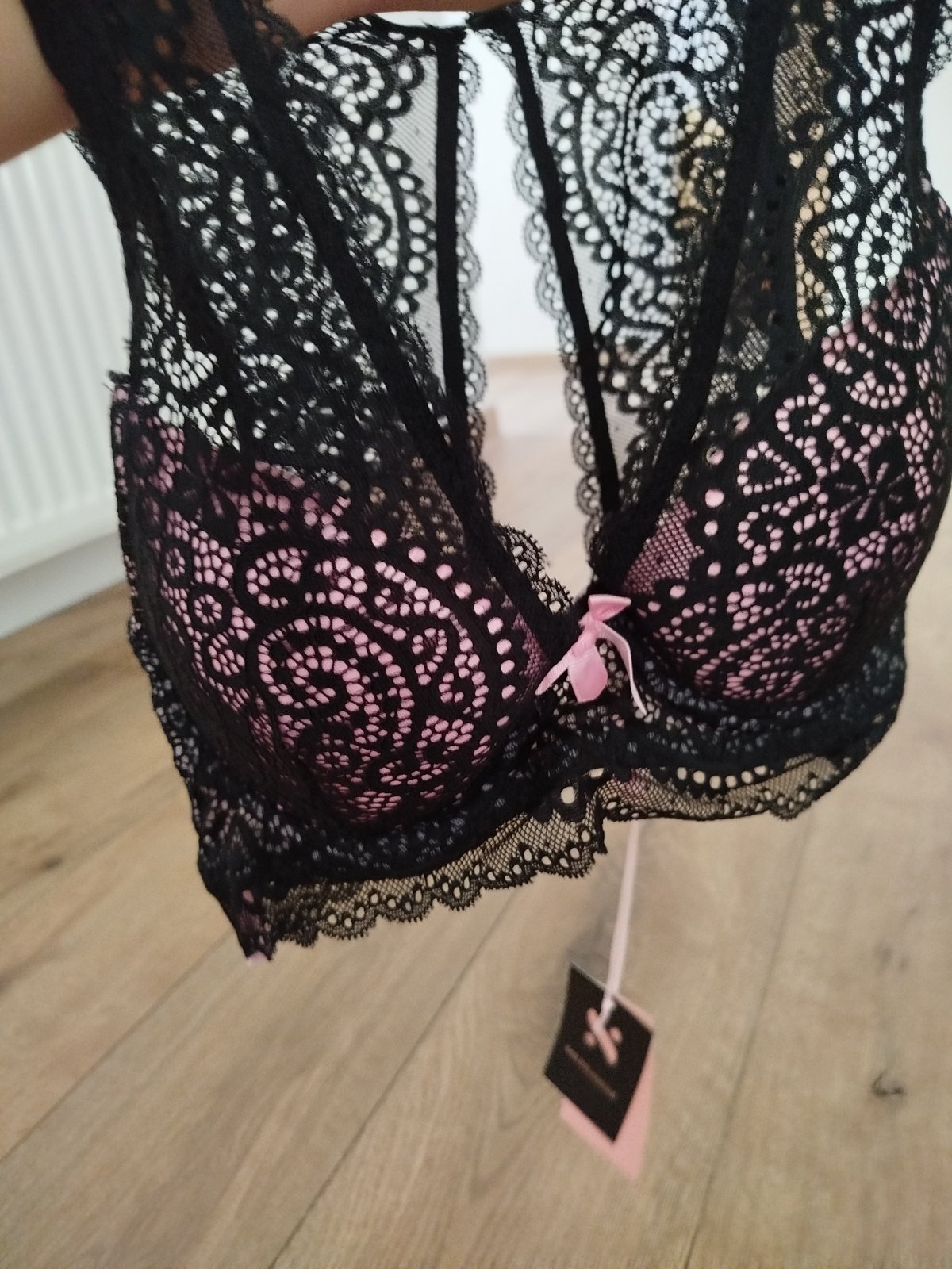Krásna nová podprsenka značka soleilsucre veľkosť 70B vystužená s kosticou dvojradove zapínanie krásny detail na chrbte farba čierna čipka s ružovou.povodna cena odfotená