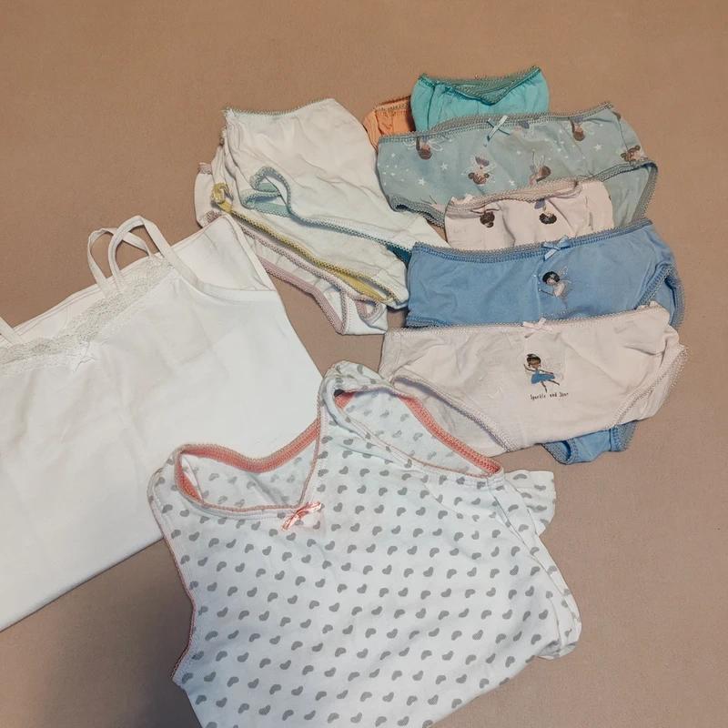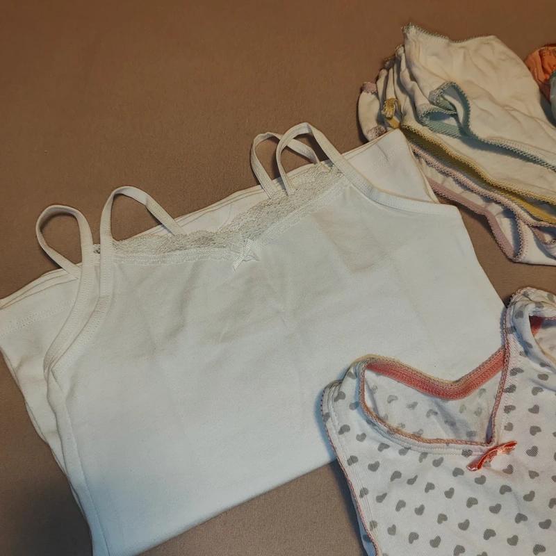 2x nove tielko s tenkými ramienkami. 1x nosené tielko6s potlačou, avsak super stav. 9x nohavičky. 6x ponožky (1 nove, 5 nosené, fajn stav, dcére vsak nevyhovuju "dlhé" ponožky)