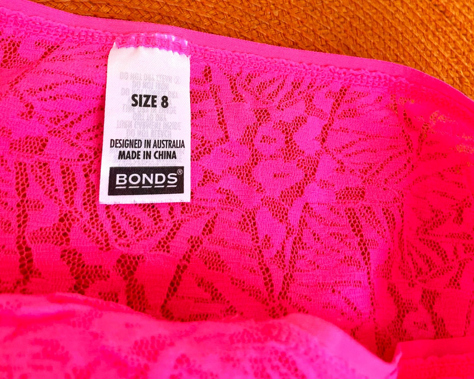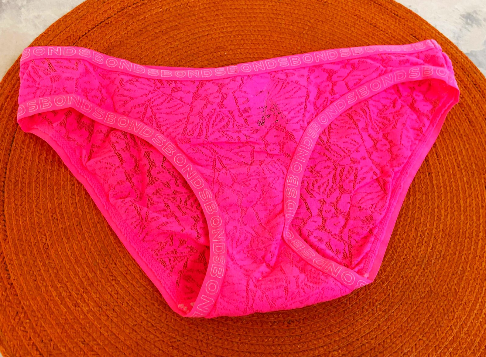 čipkované hipster nohavičky značky Bonds v žiarivej neónovo ružovej farbe s celoplošným kvetinovým čipkovým vzorom a elastickým pásom s opakujúcim sa logom „BONDS“, Bonds je austrálska značka spodnej bielizne).