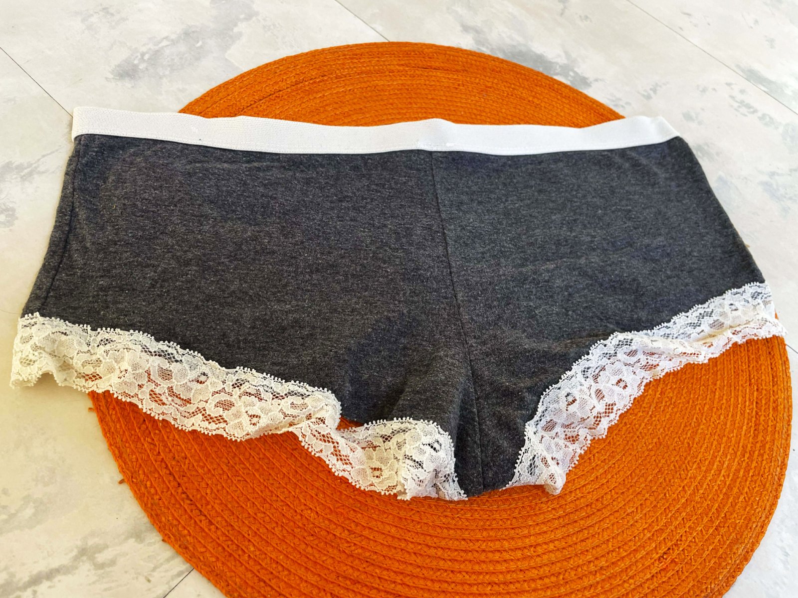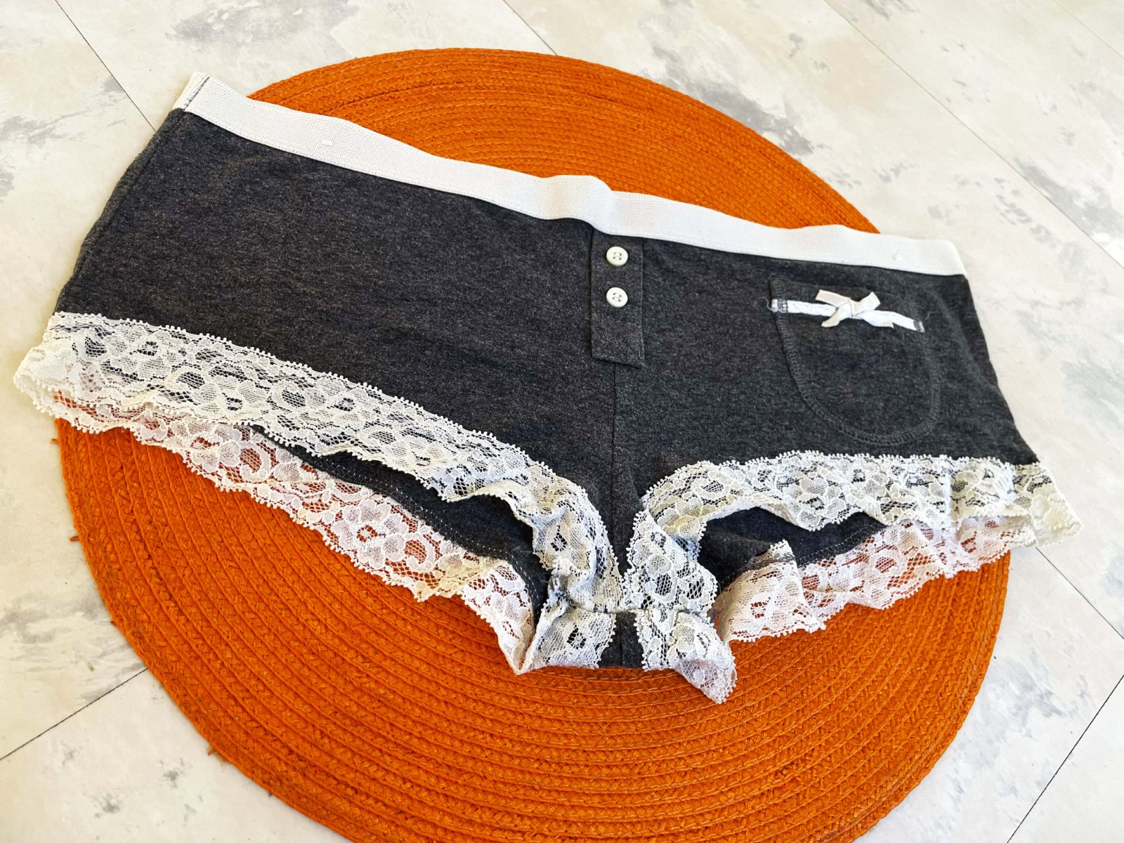 krásne boyleg šortkové nohavičky,šedá melanžová farba s bielym elastickým pásom a širokým lemom z bielej čipky,na prednej strane sú dva dekoračné gombíky (falošné zapínanie) a malé bočné vrecko s bielou mašličkou,veľkosť a značka vyfotená