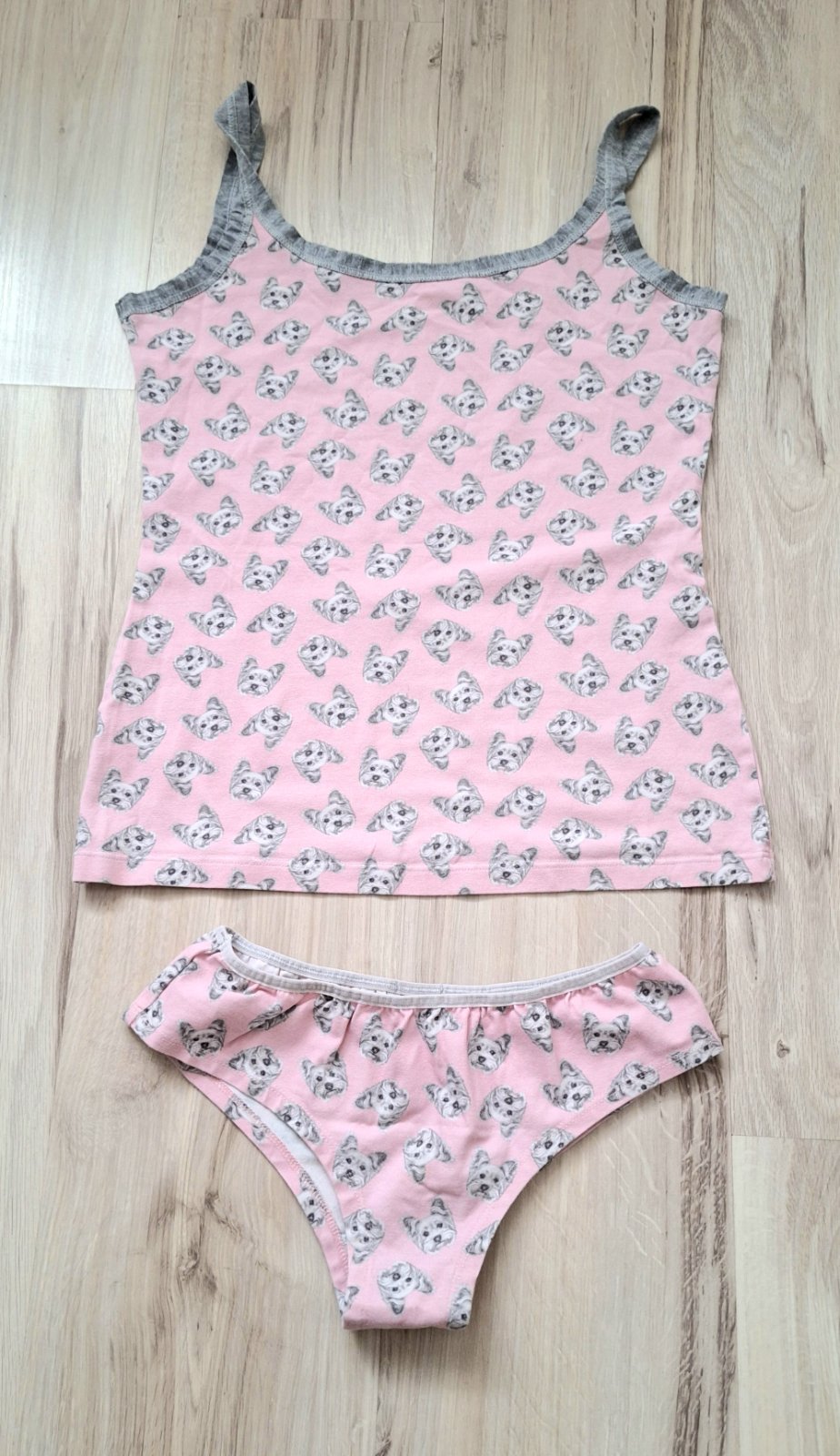 Podprsenka vystuzena s prekrizenymi ramienkami, bola nosena, vidno zboku na gumicke. Nohavicky nenosene, boli dcere male. Tie su detske Lko, cize 164. Spolu.
