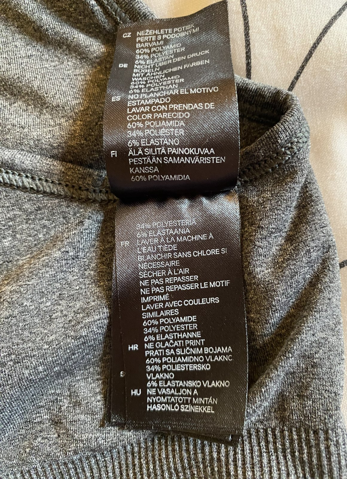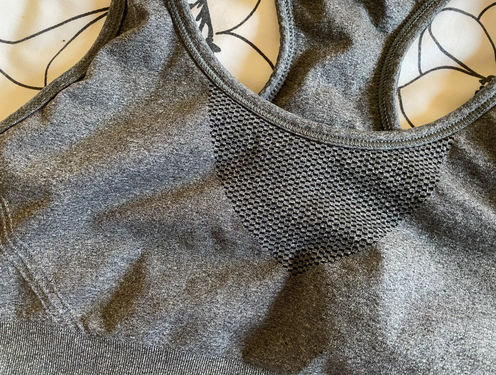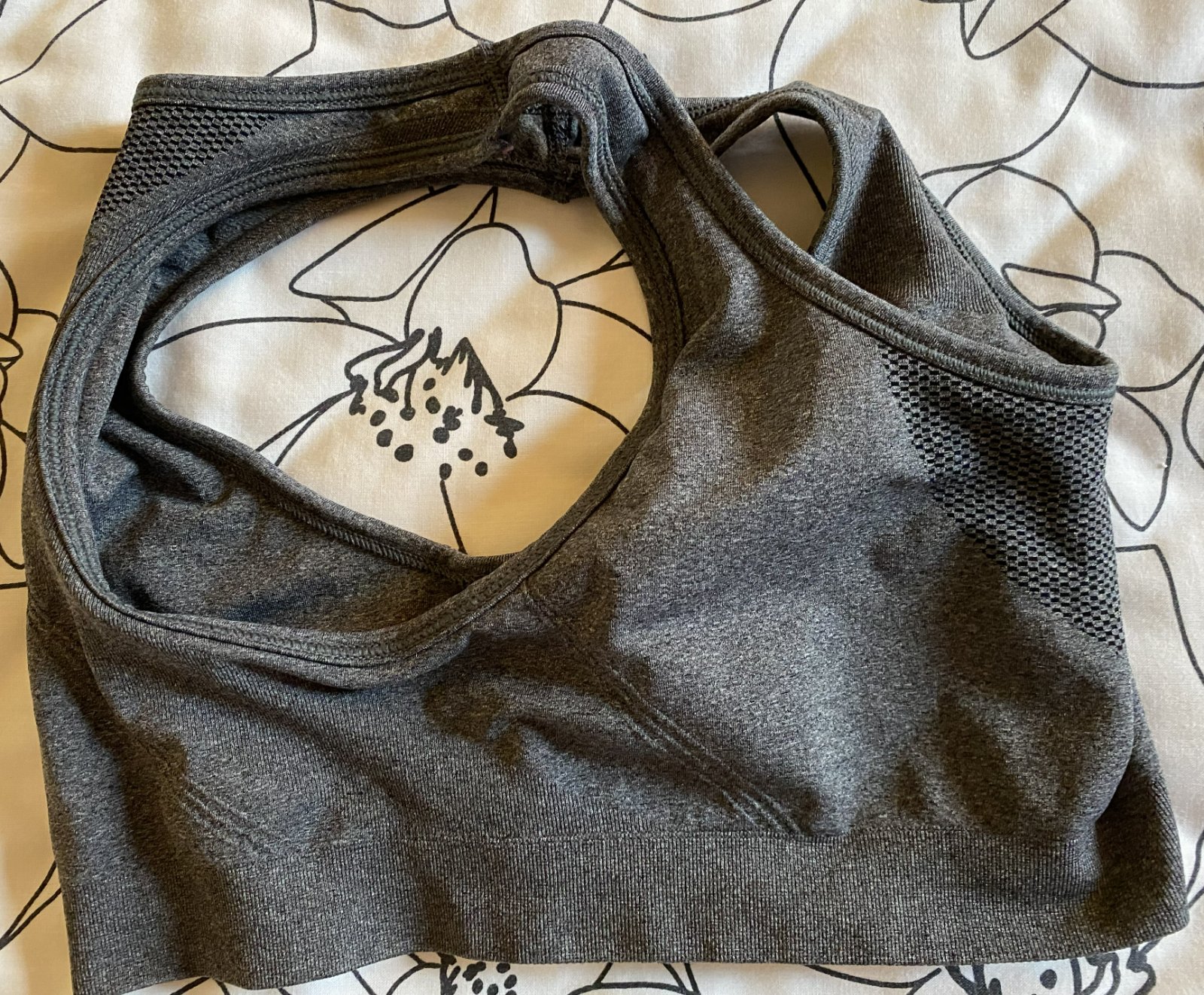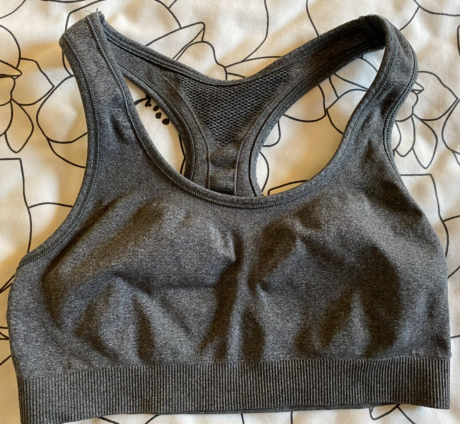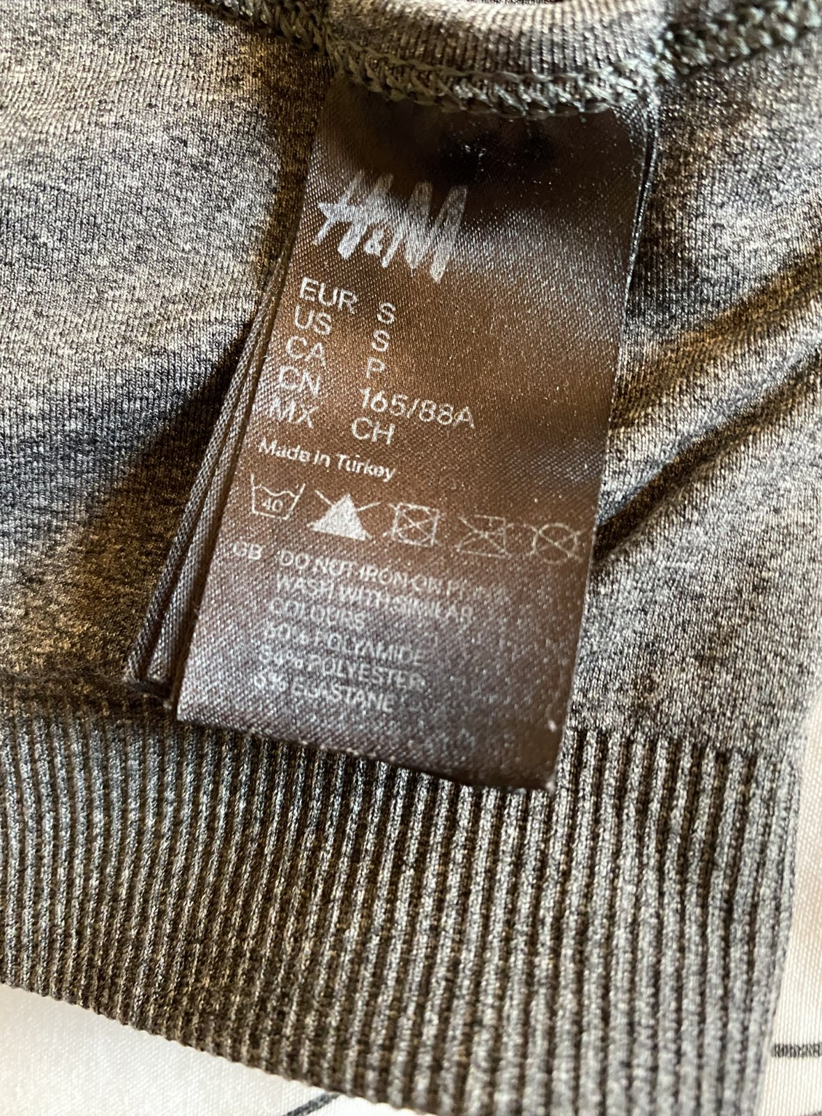 Bezšvová športová podprsenka H&M v. S, materiál 60% polyamid, 34% polyester, 6% elastan, tmavošedý melír v kombinácii s čiernou (vpredu a vzadu v hornej časti), málo nosená - na striedačku s inými, nevyťahaná, bez poškodenia.