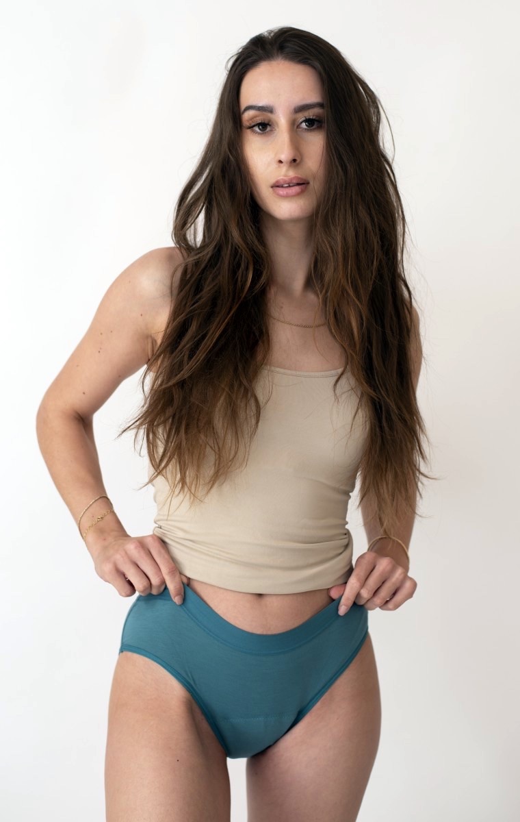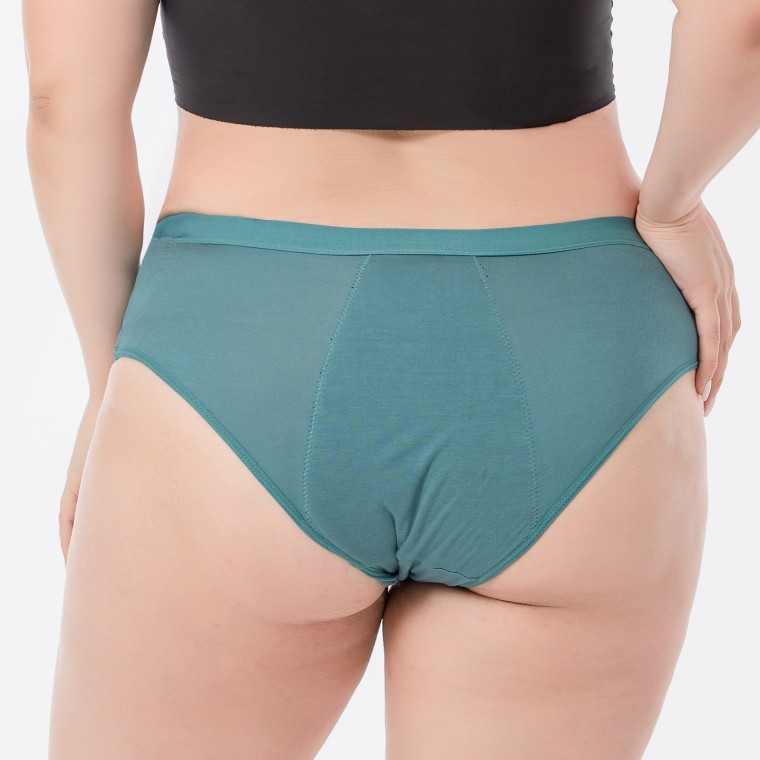 Menštruačné nohavičky Lesana z kolekcie Klasika sú vyrobené v základnom strihu v zelenej farbe. Nikde netlačia, ani neomínajú, sú preto veľmi pohodlné a vhodné aj na každodenné nosenie. Sú vyrobené z bambusovej viskózy, takže sú priedušné a veľmi príjemné na dotyk. Majú vysokú mieru absorpcie, sú preto vhodné aj ako inkontinenčné nohavičky.