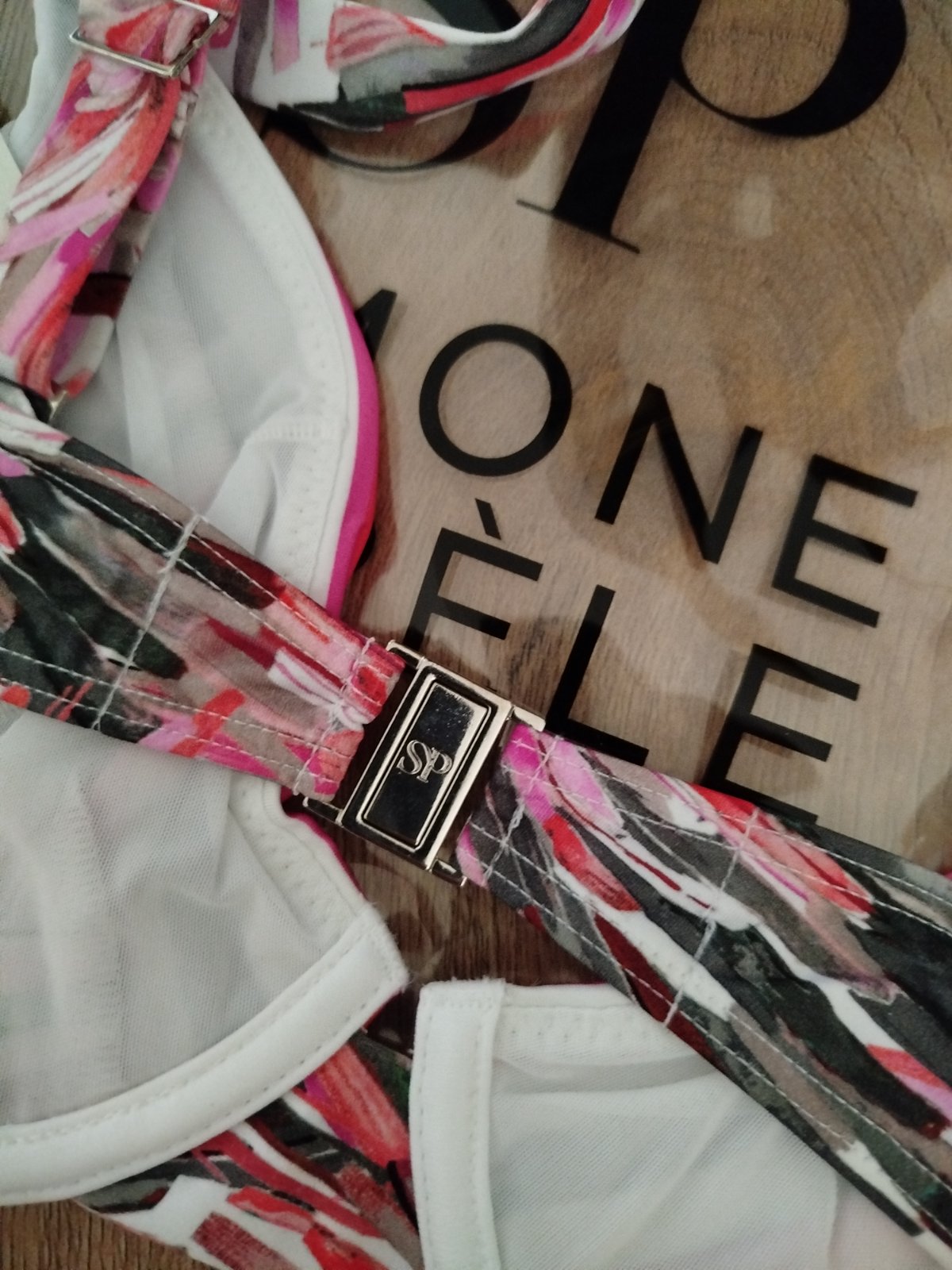 ✅ Detail: kvalitné spracovanie, kovové zapínanie s logom „SP“, jemný vzor a pohodlný strih