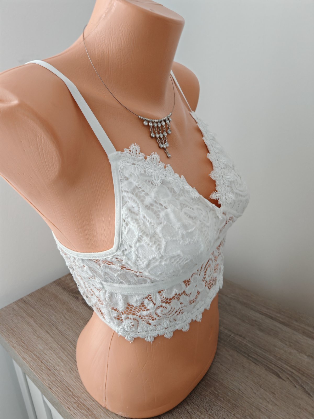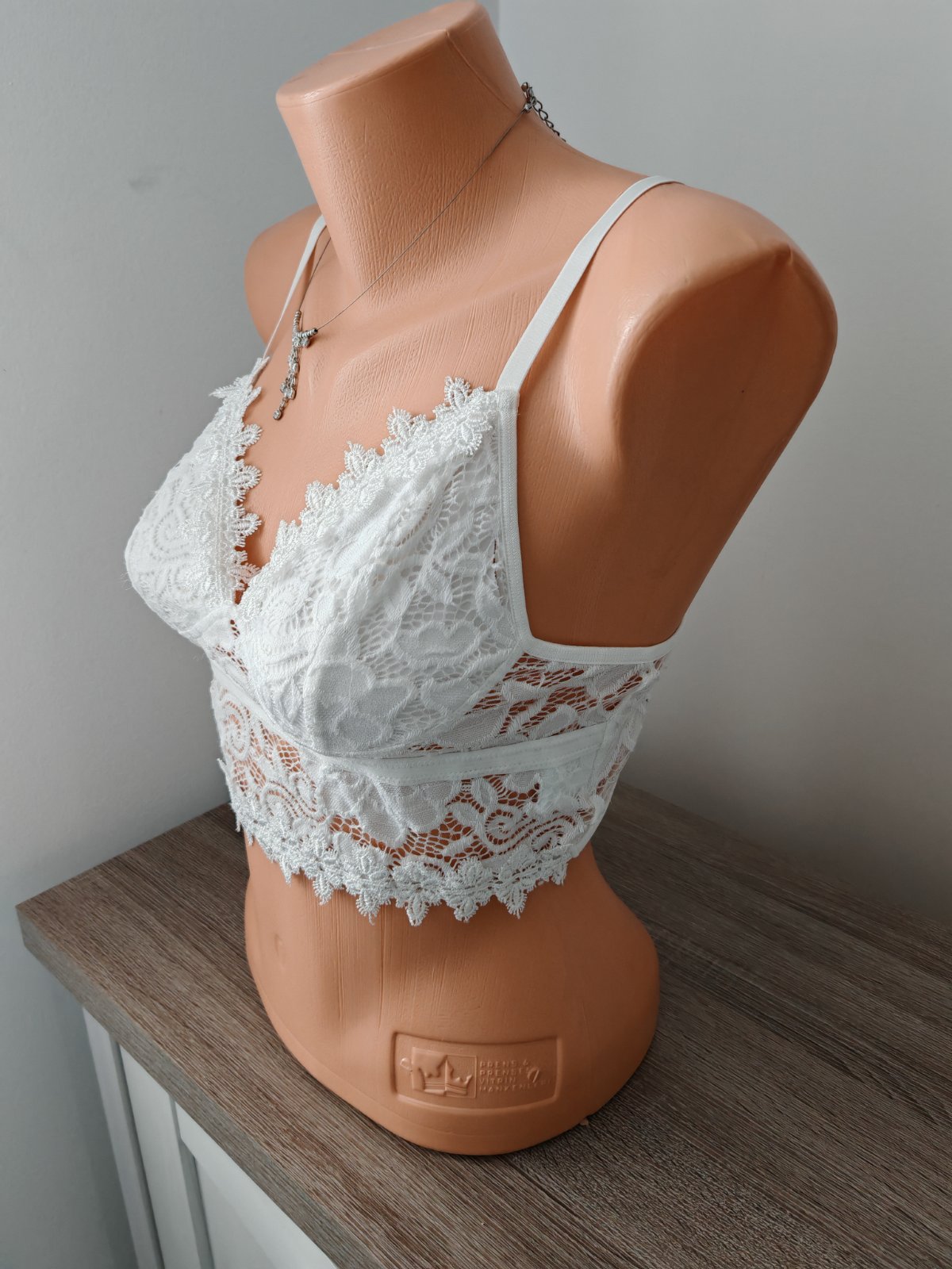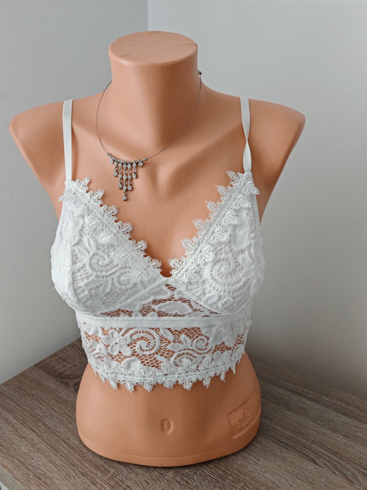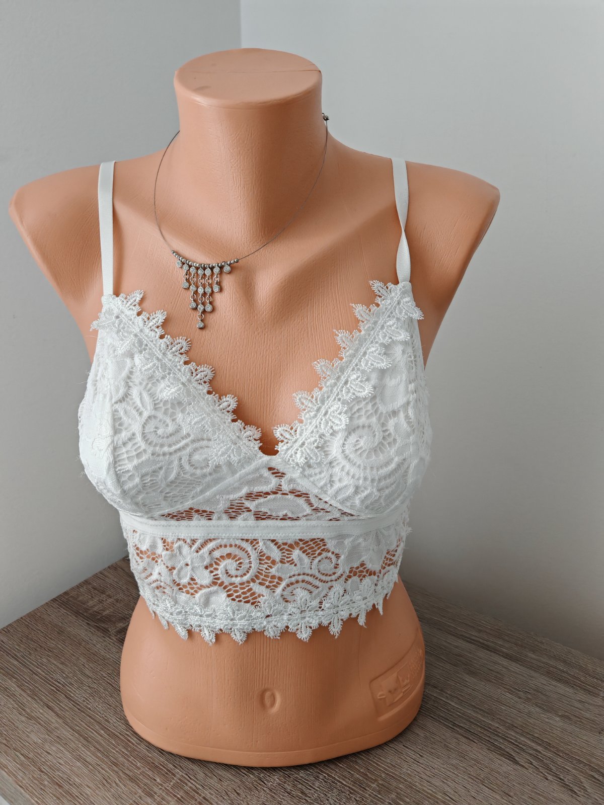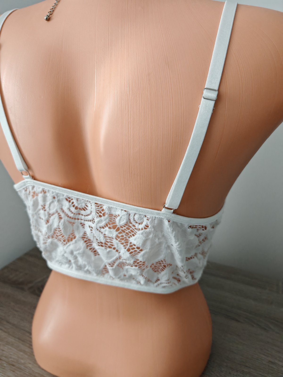 jemný elastický korzet,predná bodkovaná časť je pevnejšia,podprsenka nevystužená,s kosticami a posuvnými ramienkami,šírka pod prsami 33 cm,natiahne sa na 40 cm.