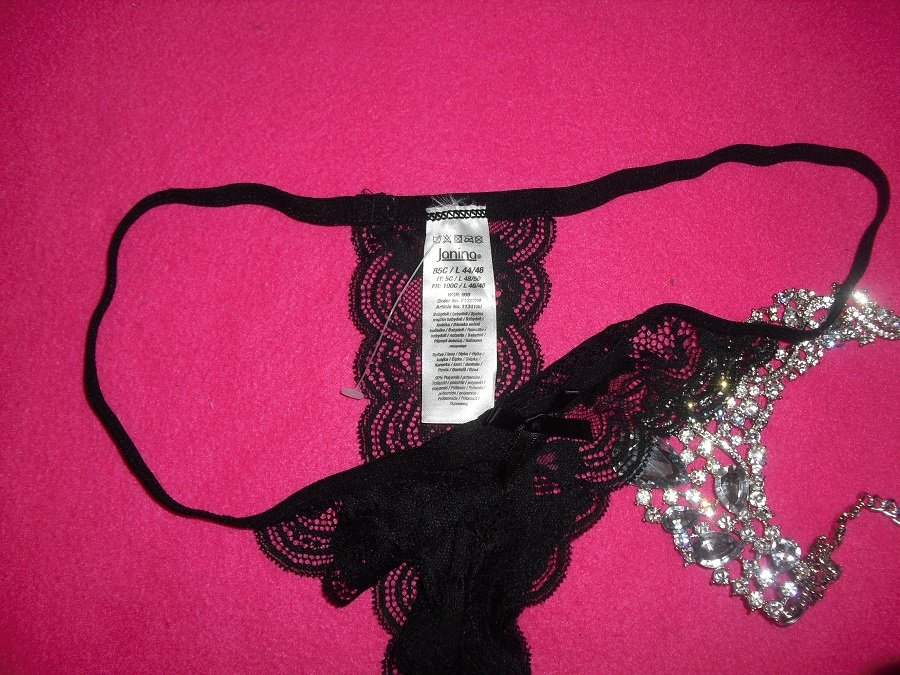 predam nadherne cierne krajkovane znackove tangaciky, velkost uvedena l. 44/46, detailne zdobene krajkami aj v zadu, elasticke. pas 37,5 cm x 2 az 50 cm x 2.