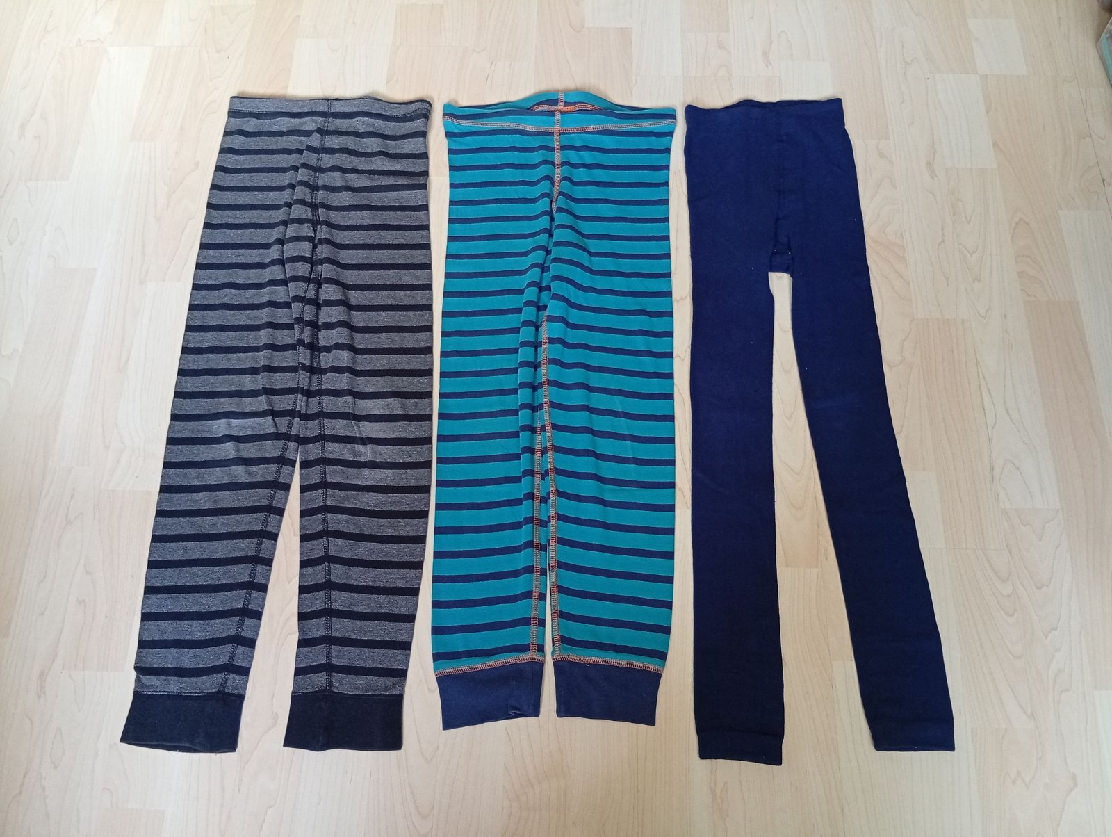 tmavo-modré sú Tatrasvit, sl. výroby oblečené 2x. Druhé 2 su H&M. Cierno-sivé sú skôr na donosenie, boli nosené najviac. Majú trochu šuchnuté kolienka, no bez dier.