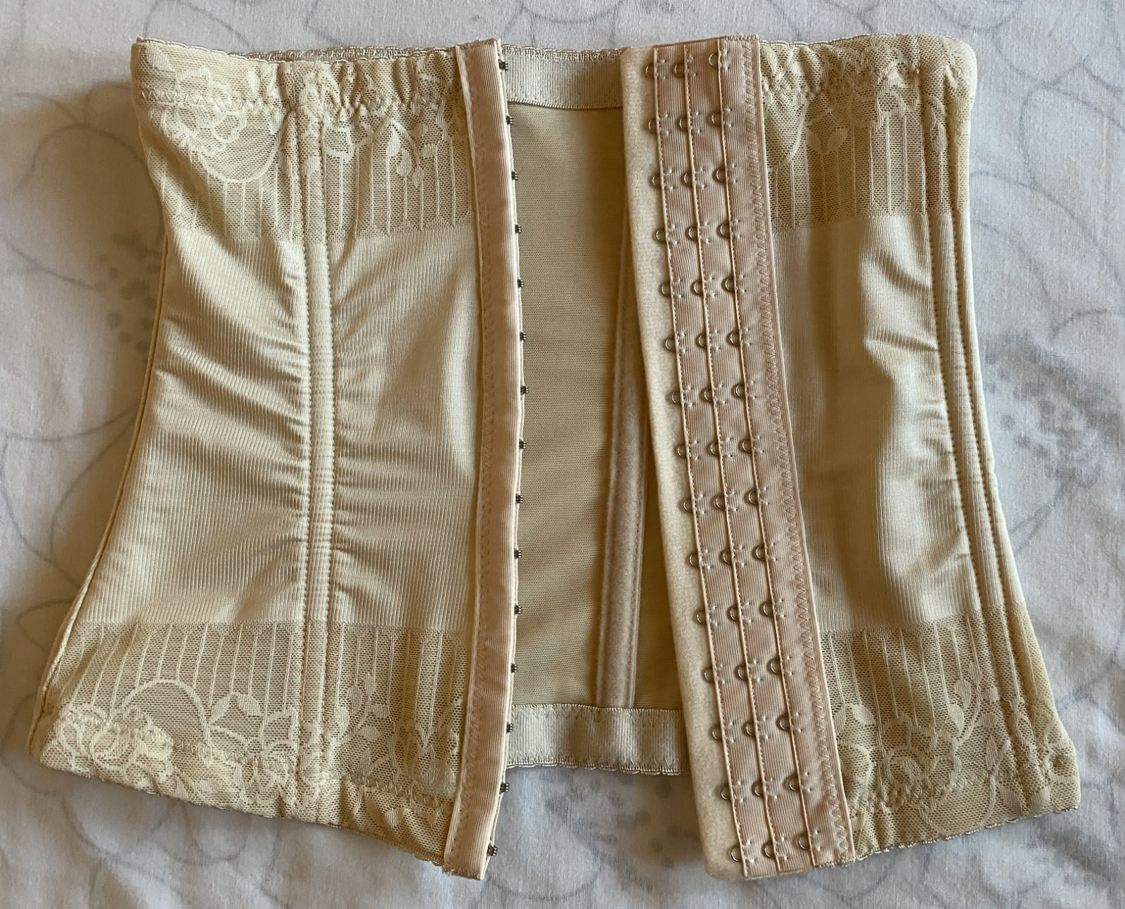 Korzetový pás - bez označenia veľkosti, dávam v. XS/S - premerajte, nenosený, iba opratý, nám malý. Miery roztiahnutý: šíršia časť: 65, stred: 56cm, užšia časť: 57cm, výška cez stred: 25cm. Je pružný, ešte povolí a dá sa regulovať - viď zapínanie.