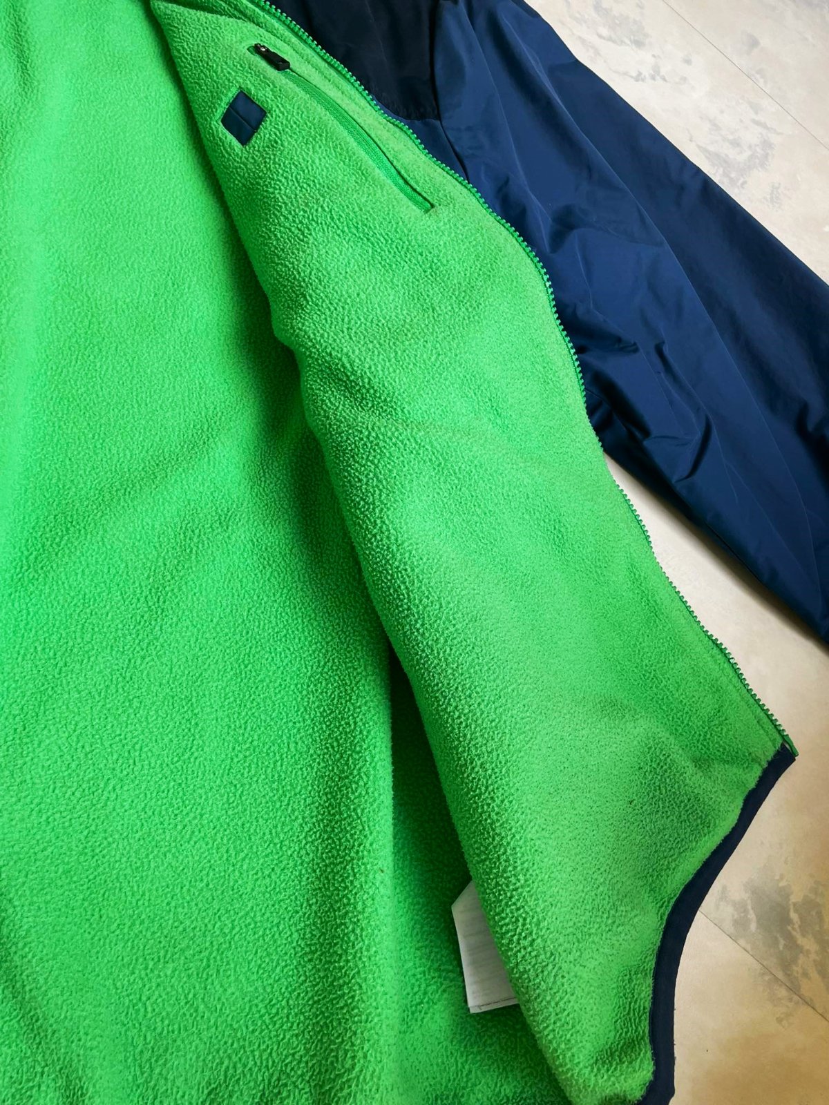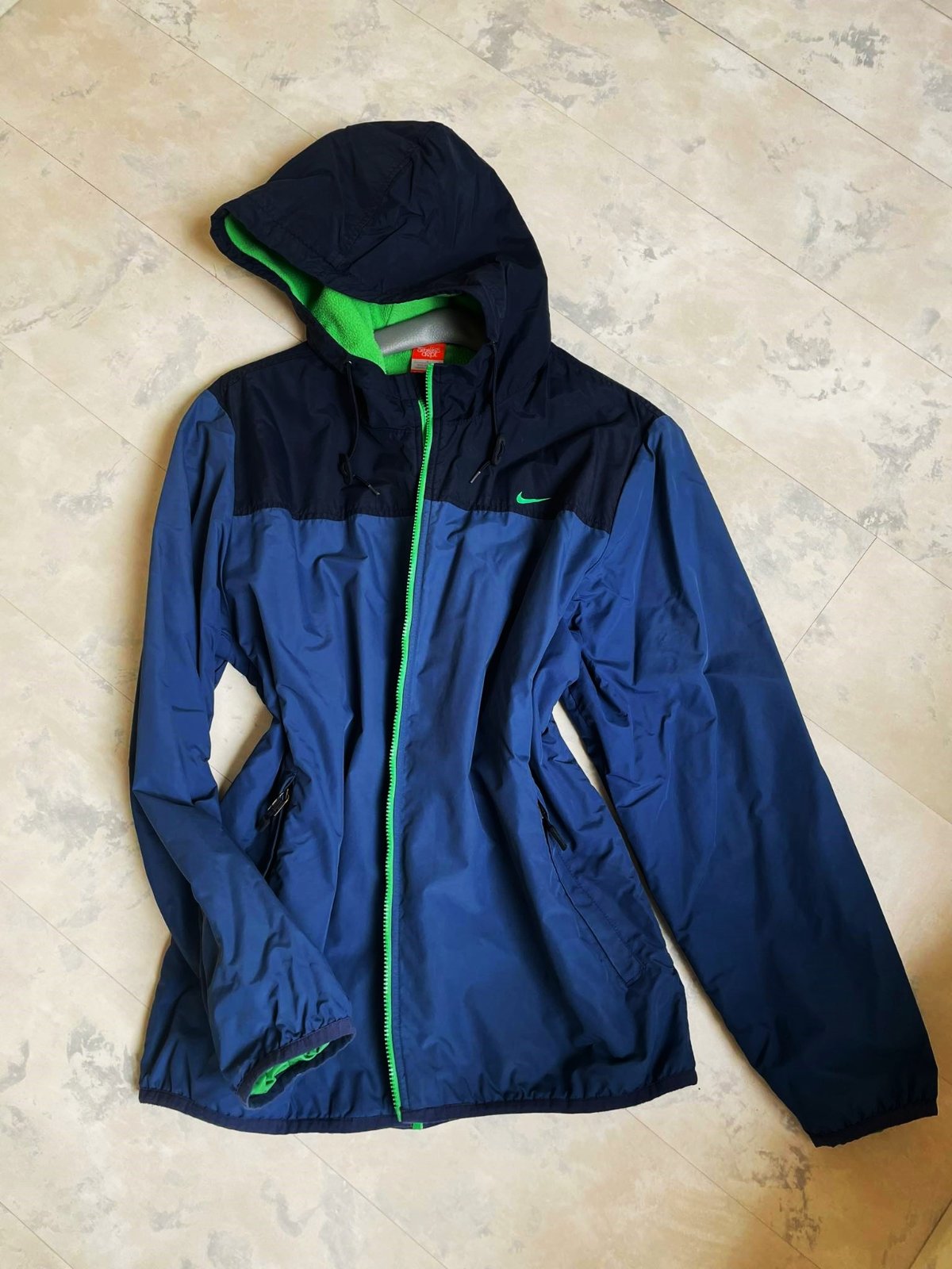krásna a kvalitná vetrovka Nike - originál,perfektný materiál a vypracovanie,krásna kombinácia farieb,farba je oceľovo modrá,kombinovaná na sedle s tmavomodrou,je zateplená pestrým zeleným flisom,transparentný zelený hrubý zips, rukávy podšité futrom v rovnakej farbe