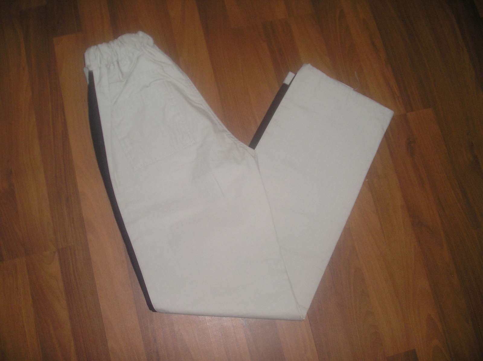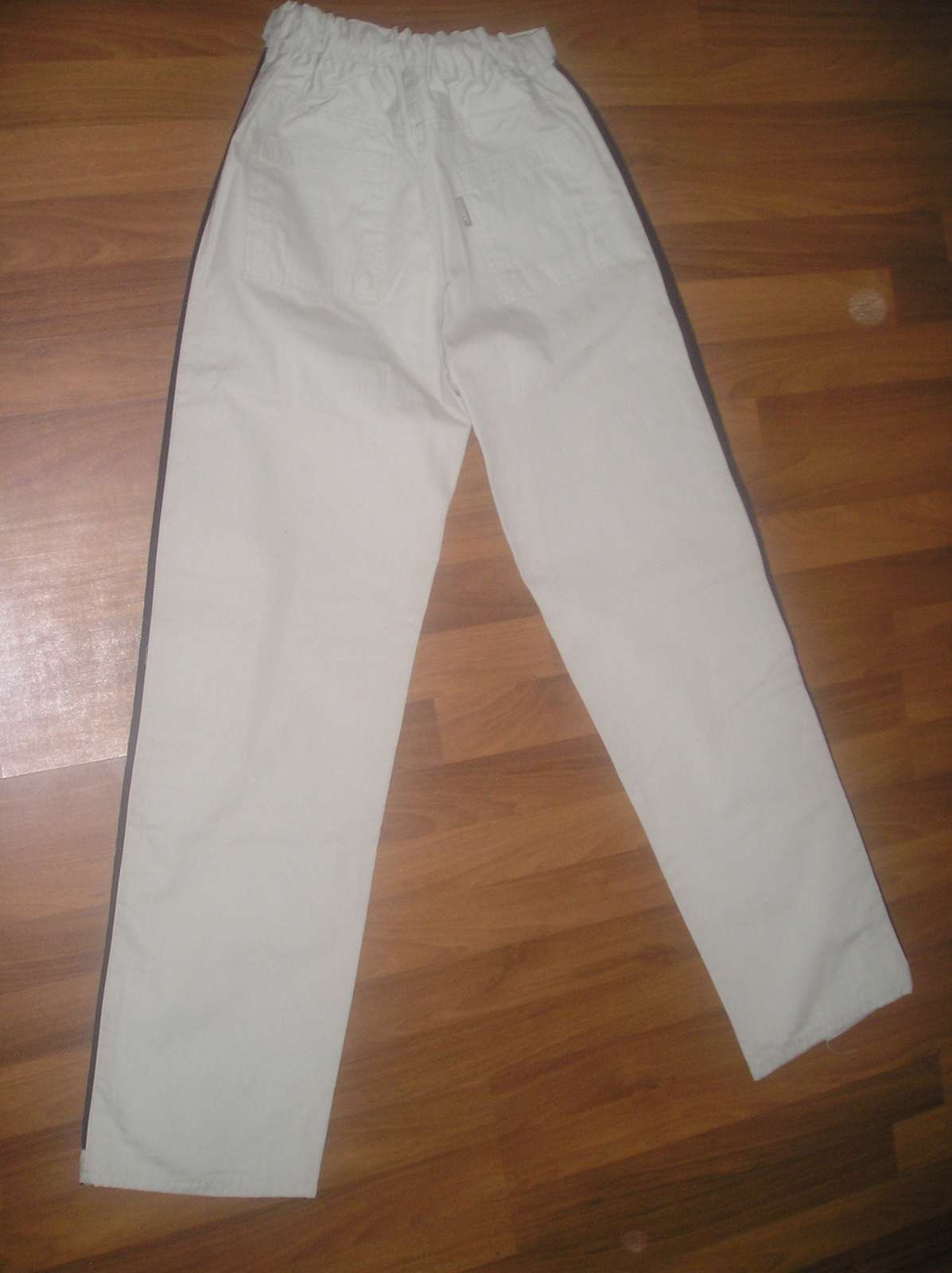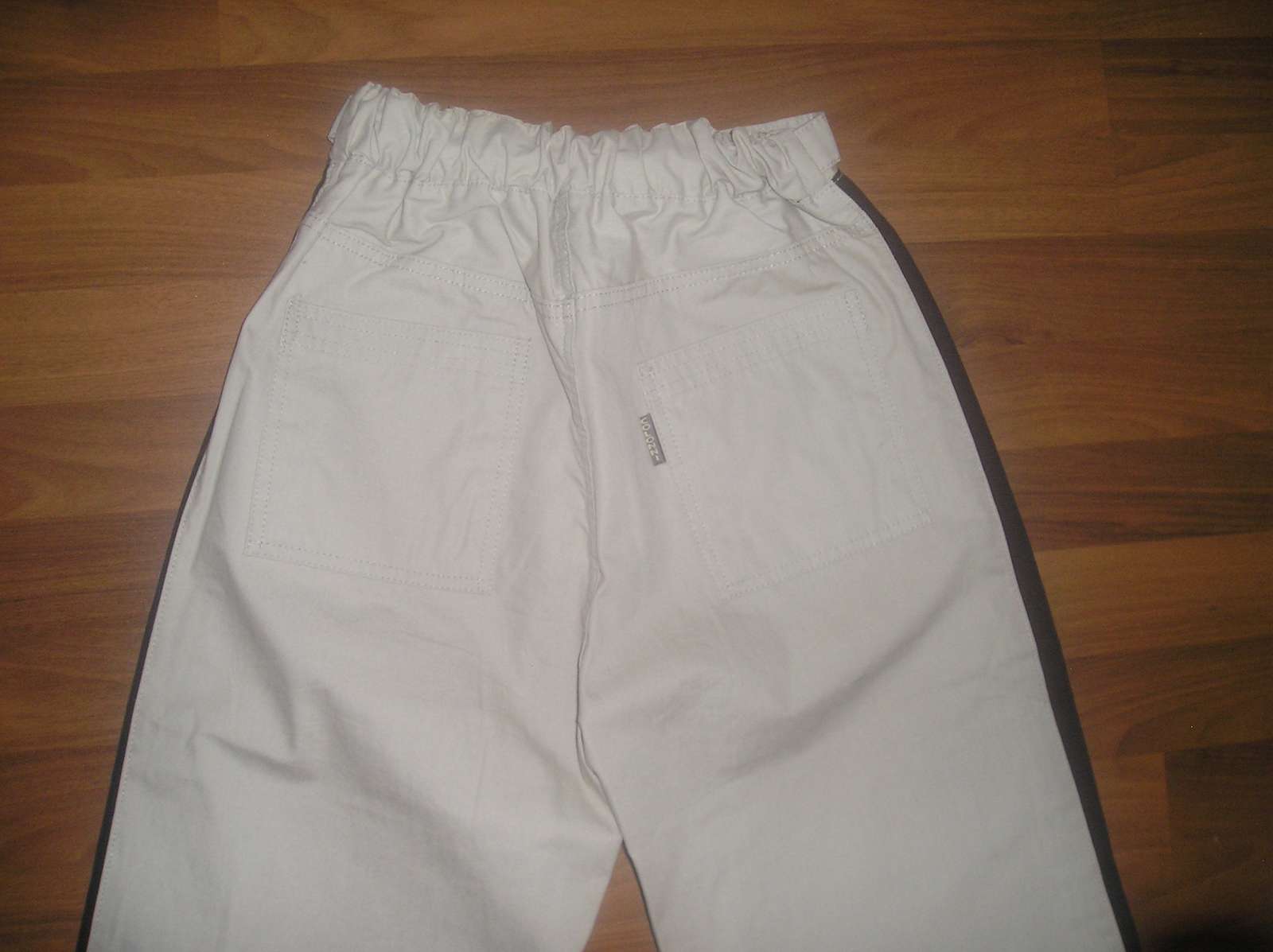 Športové nohavice, bledozelenej až béžovej farby, málo nosené, perfektný stav, dĺžka 116 cm, vpredu 2 vrecká, vzadu tiež. V páse guma + šnúrka na stiahnutie, šírka v kľudnom stave 2x 29 cm, roztiahnutý pás šírka 2x 46 cm, šírka boky 2 x 53 cm. Šírka stehna 2 x 32,5 cm