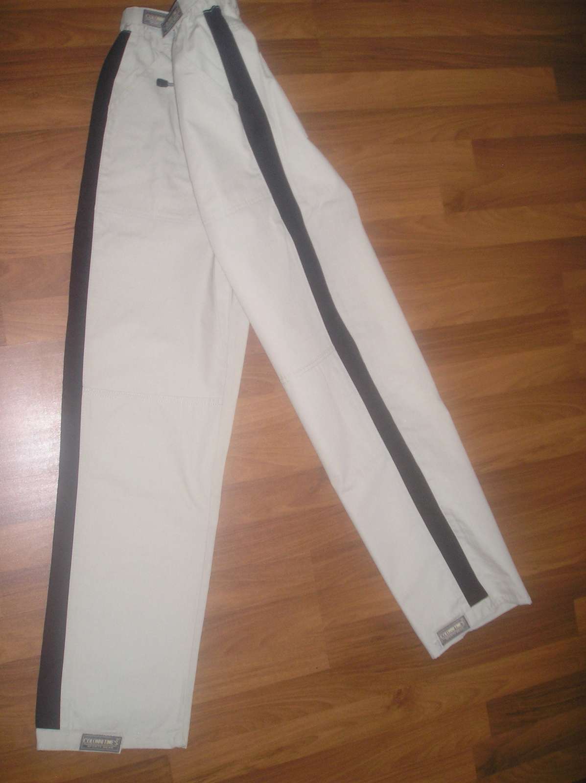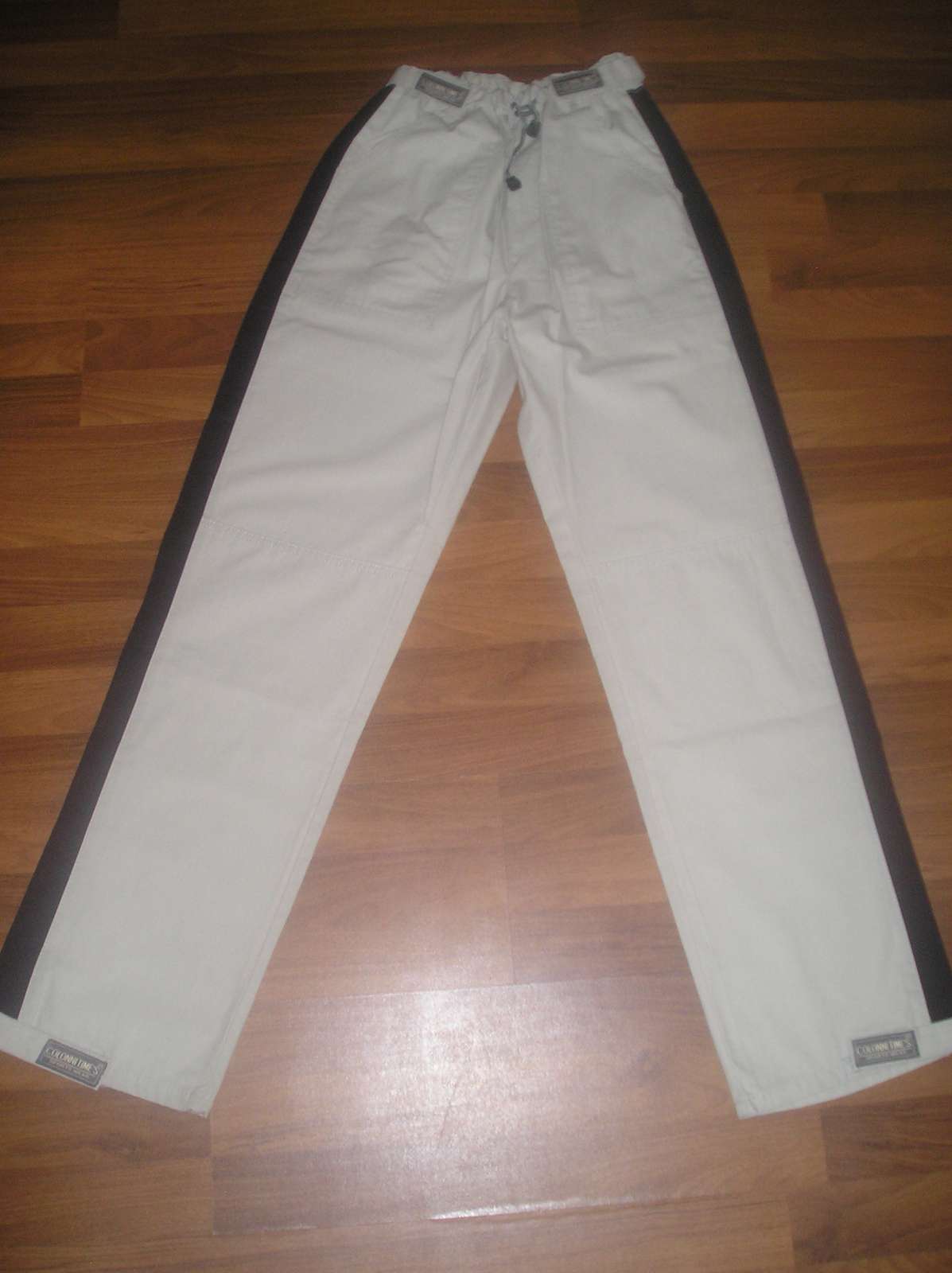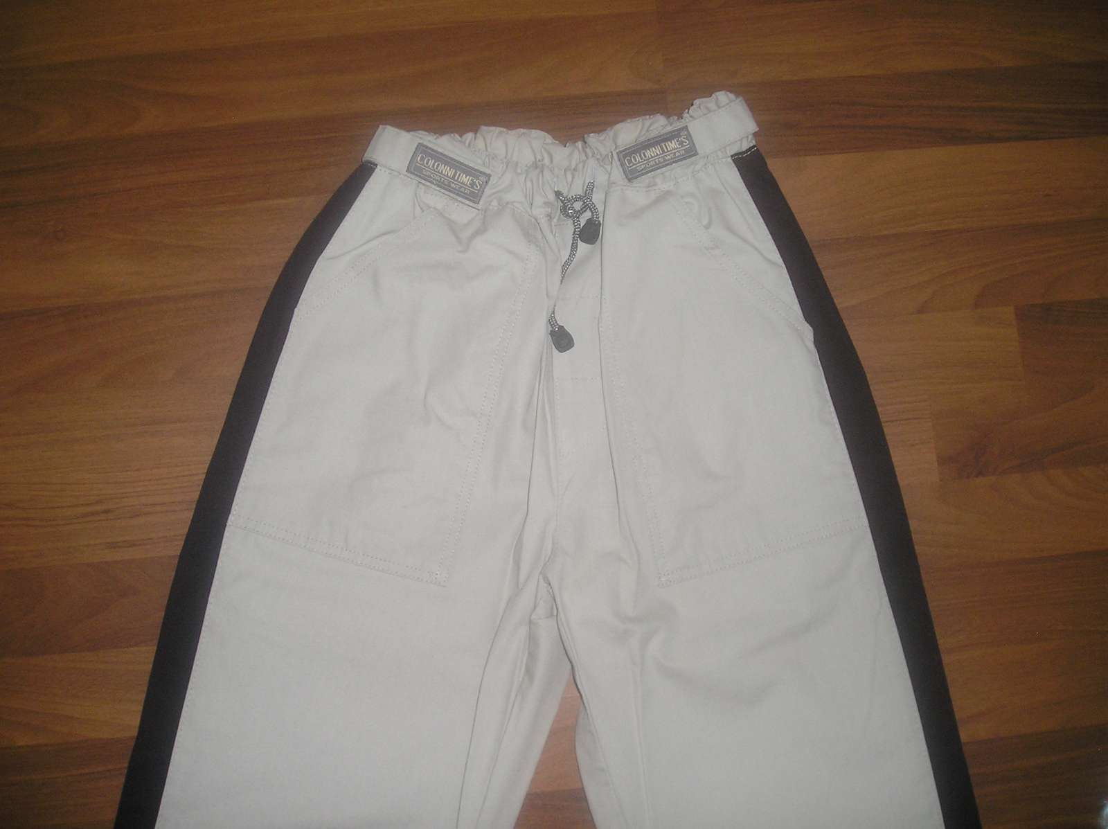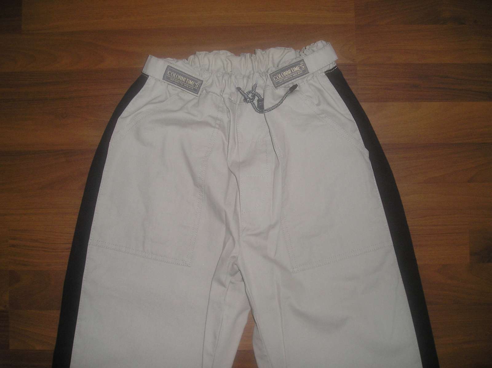 Športové nohavice, bledozelenej až béžovej farby, málo nosené, perfektný stav, dĺžka 116 cm, vpredu 2 vrecká, vzadu tiež. V páse guma + šnúrka na stiahnutie, šírka v kľudnom stave 2x 29 cm, roztiahnutý pás šírka 2x 46 cm, šírka boky 2 x 53 cm. Šírka stehna 2 x 32,5 cm