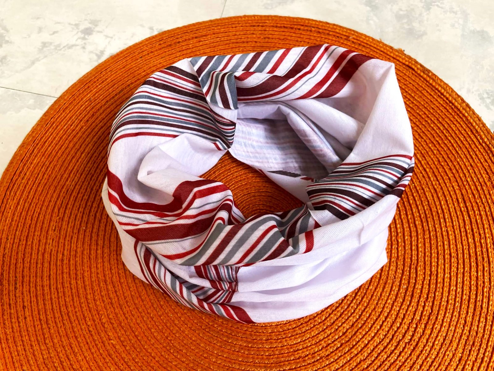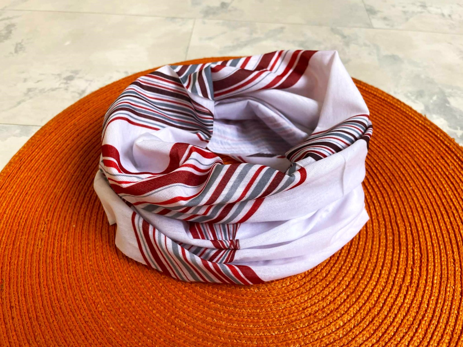 viacúčelový elastický a variabilný nákrčník, na krk, na hlavu,na vlasy - ako čelenka, alebo aj ako rúško,je nový - iba prepraný, v top stave,materiál - jemná tenká tričkovina, super na zimné športy alebo behanie,materiál : tenšia tričkovina, 48 x 25 cm