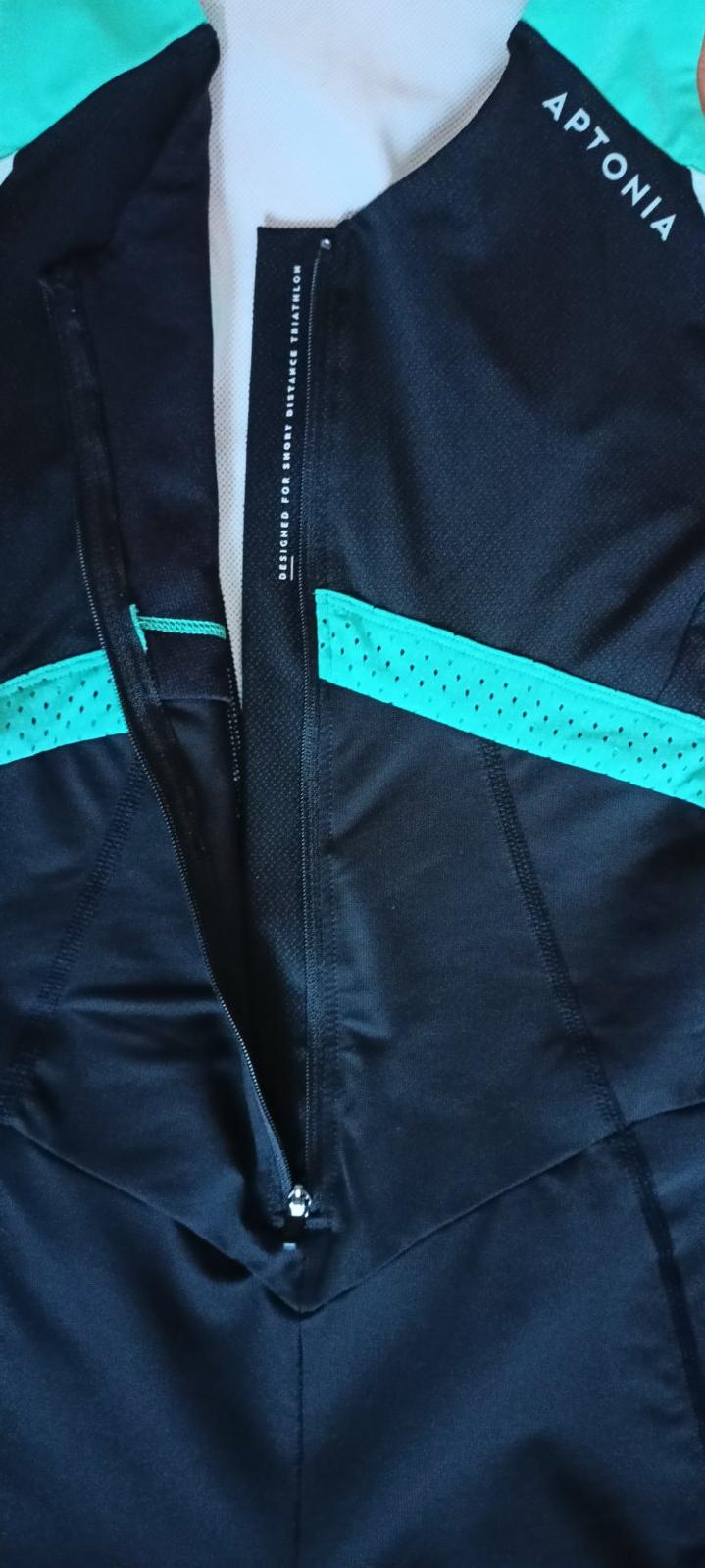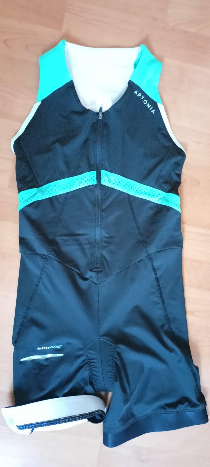 1. Tyrkysová má zdvojený predný diel so zipsom, čo tvorí akési vrecko. Materiál 80 % polyamid, 20 % elastan. Zapinanie na zaklikávaciu sponu, nastaviteľné ramienka. Z rubovej strany je taká čmuha ...