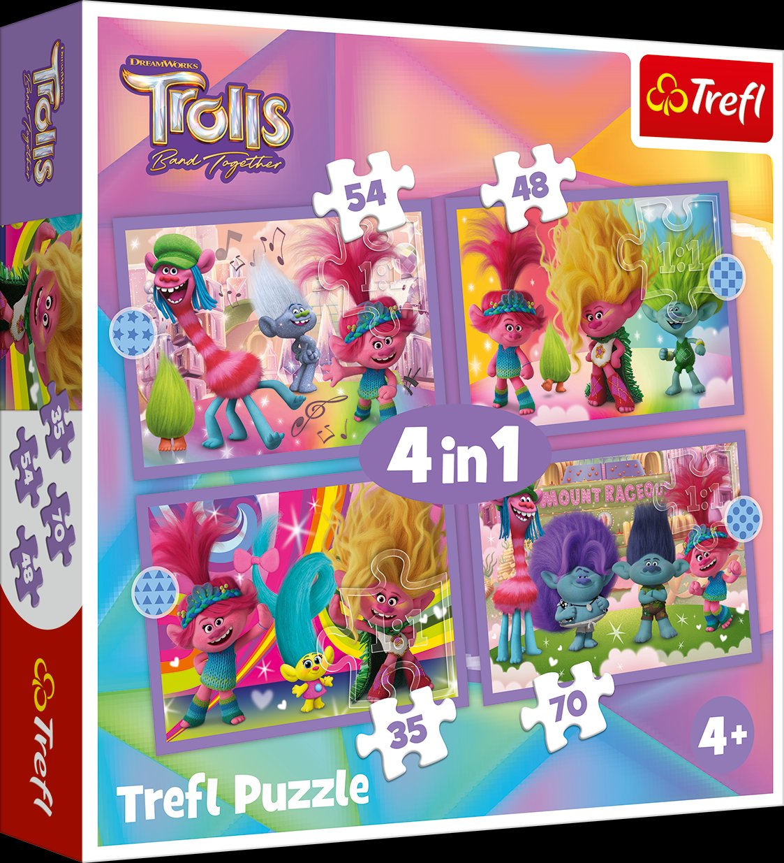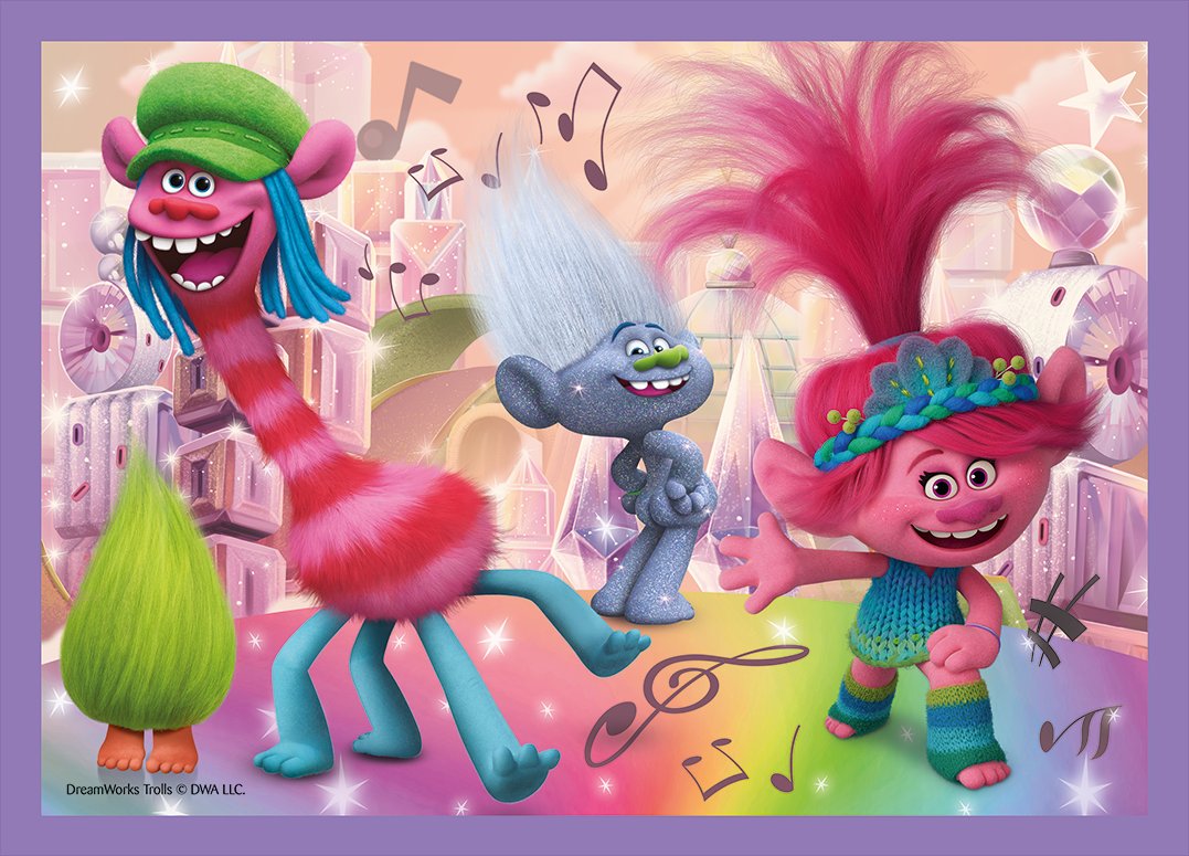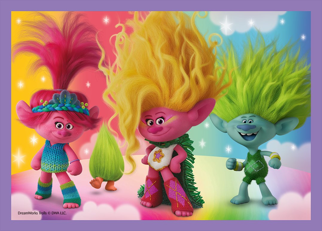 Detské puzzle TREFL s motívom animovaného filmu Trollovia. Progresívne puzzle s rôznymi úrovňami obtiažnosti - 4 puzzle s 35 - 70 dielikmi.