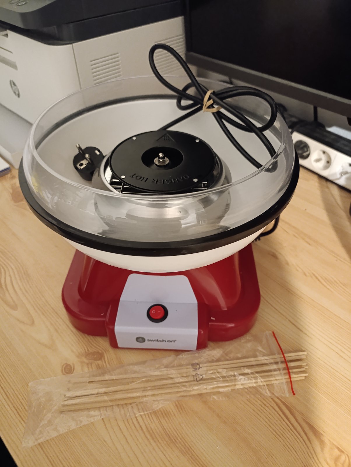 Raz použitý výrobní cukrovej vaty.Nemecky výrobca Dema. Pôvodná cena 41e v zľave kúpený, predávam za 30 e..esre rok v záruke.extra veľký priemer