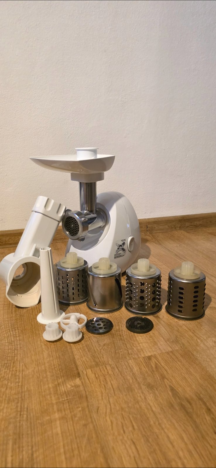 Plne funkčný bez poškodení,bežné známky opotrebovania,za celý čas bez poruchy,obojstranný nôž na mletie mäsa,2 náhradné poistky na mäsový mlynček.