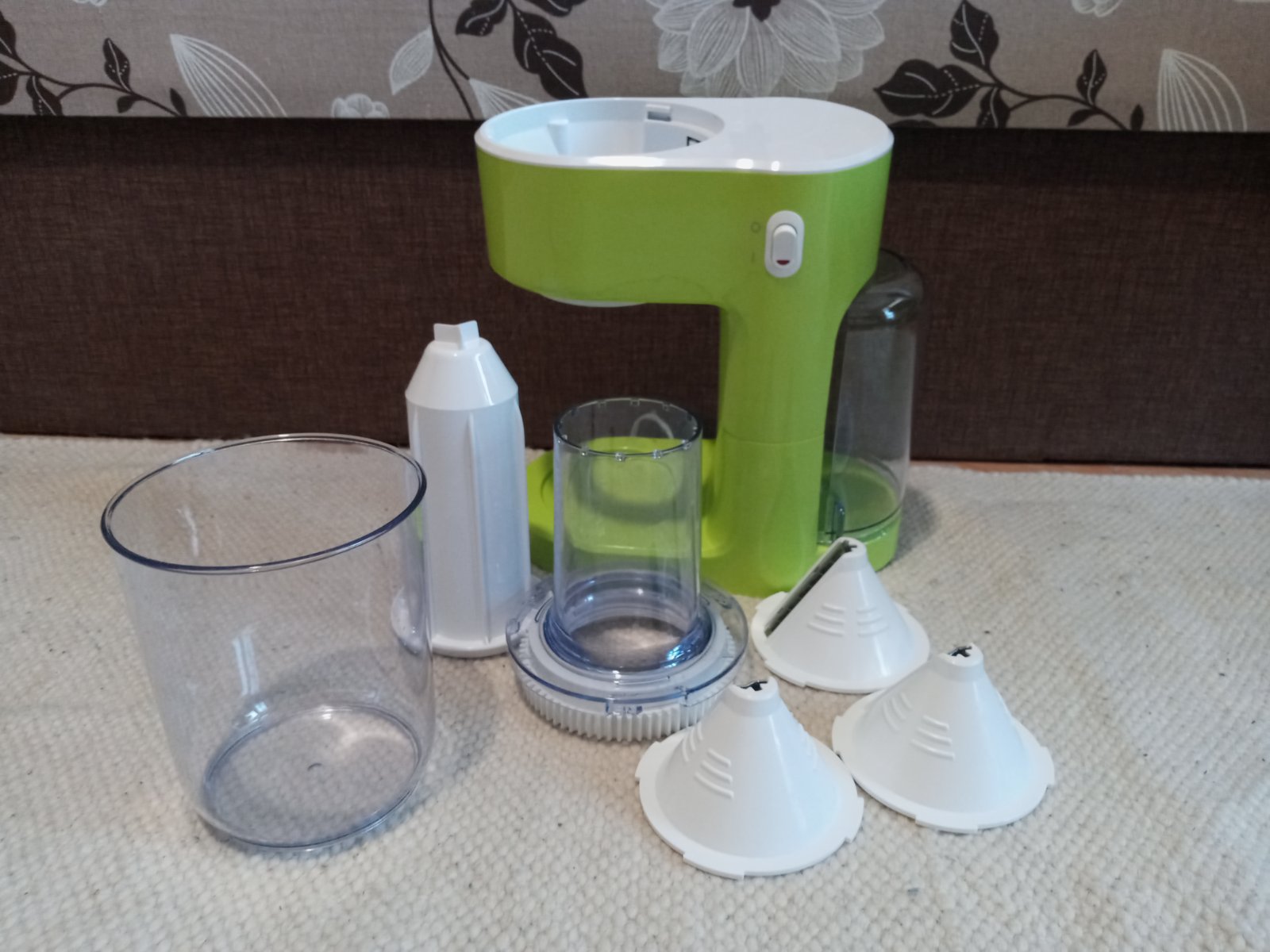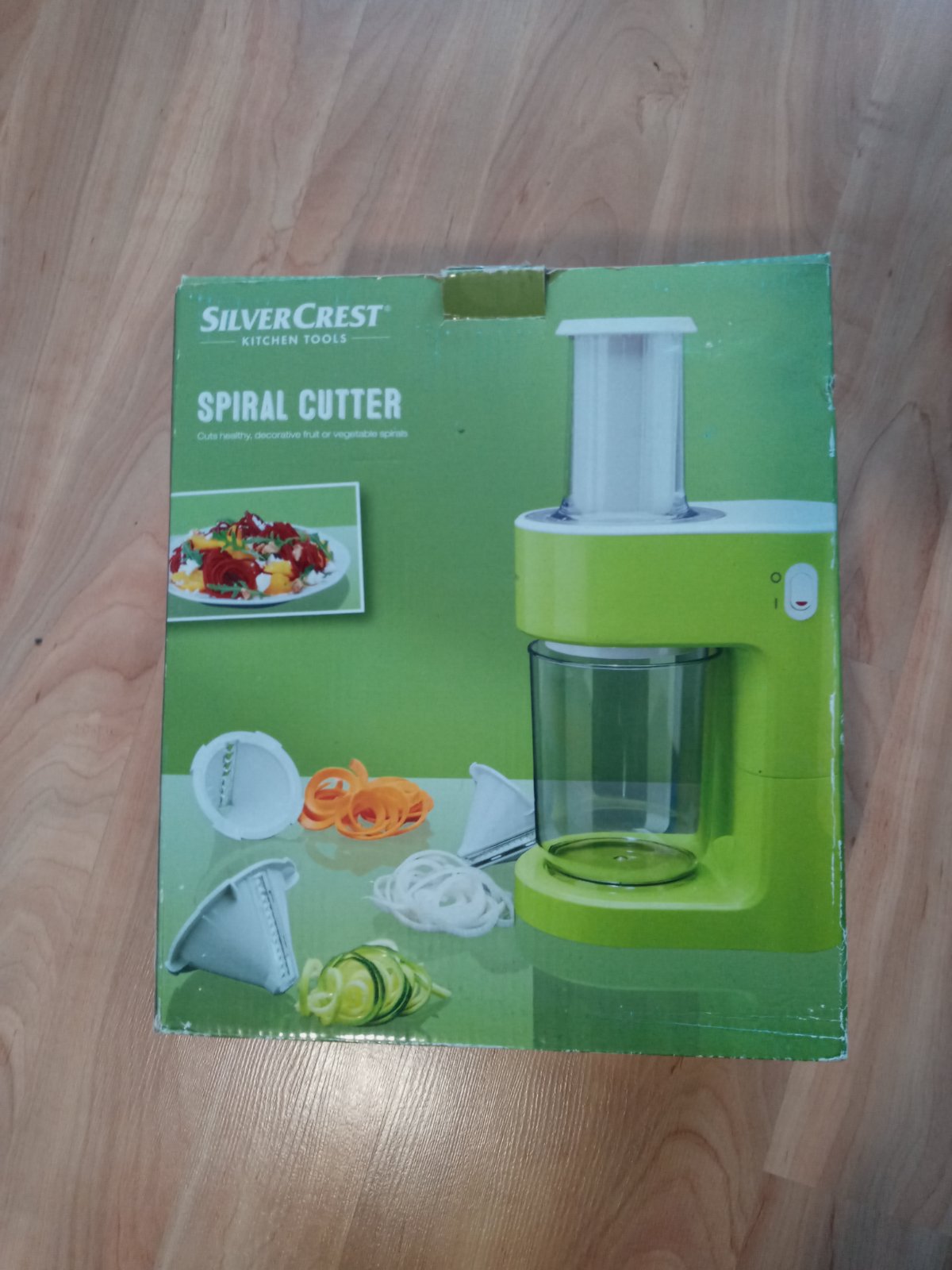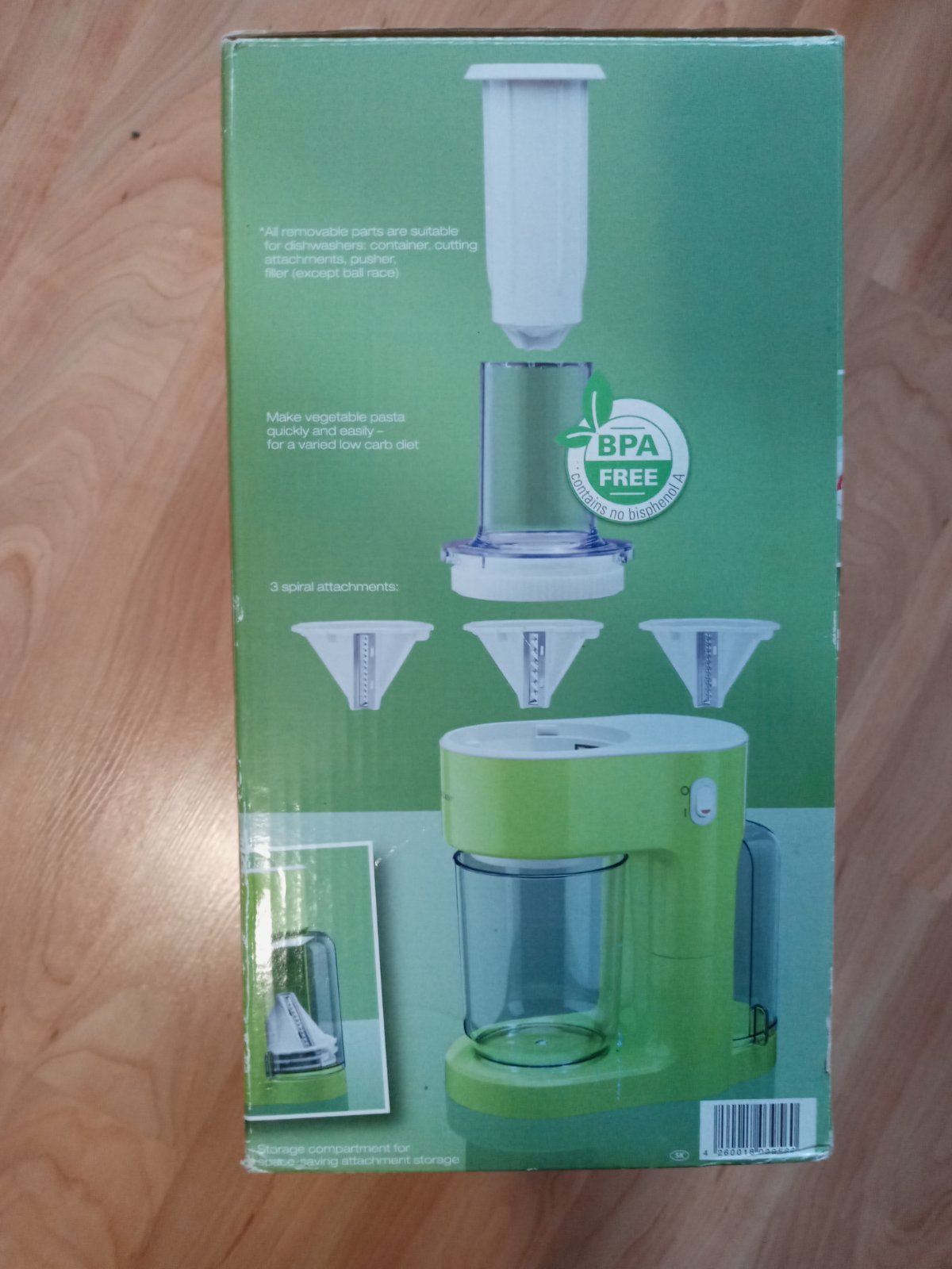 Plne funkčný elektrický špiralizér na ovocie a zeleninu s troma rôznymi rezacími vložkami na špagety, rezance šírky 9 mm, 5 mm, 3 mm. Použitý pár krát.