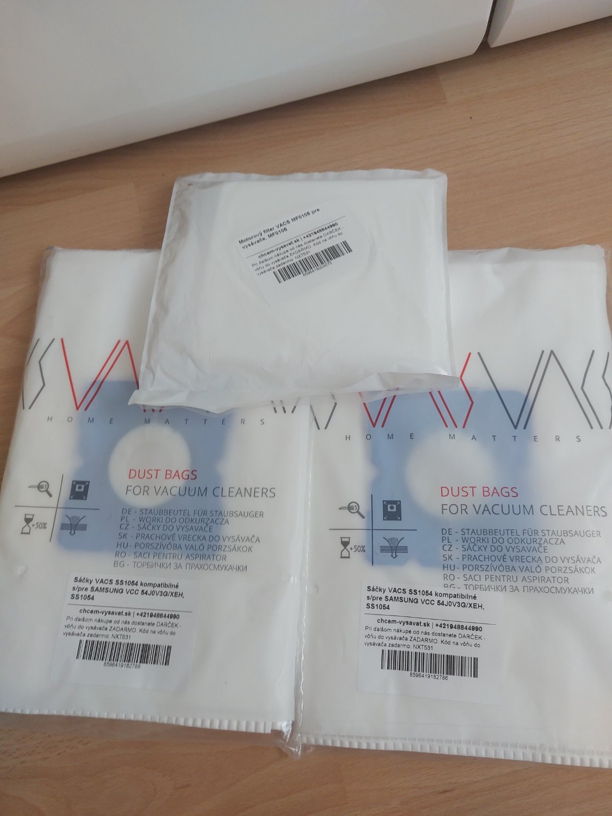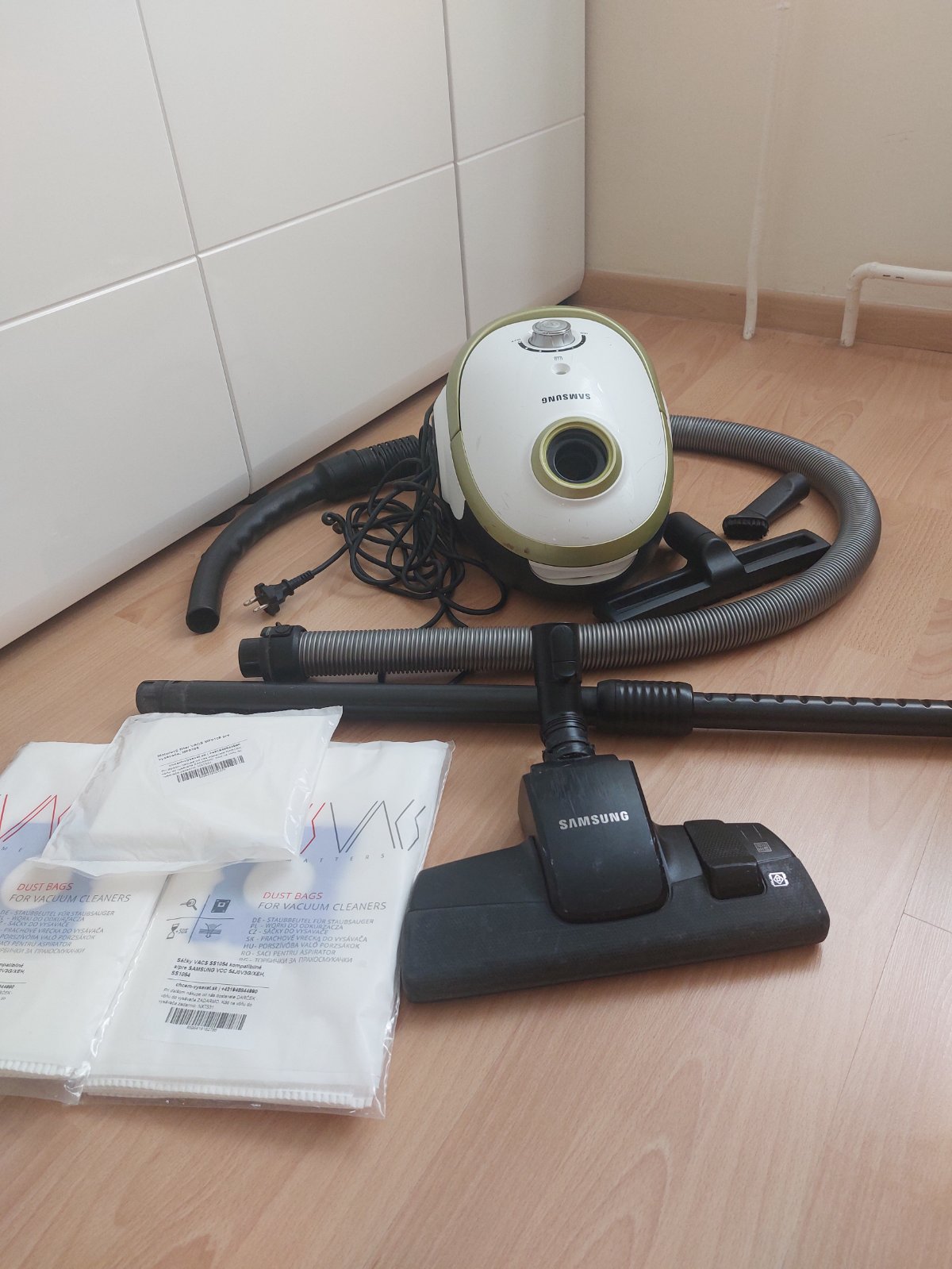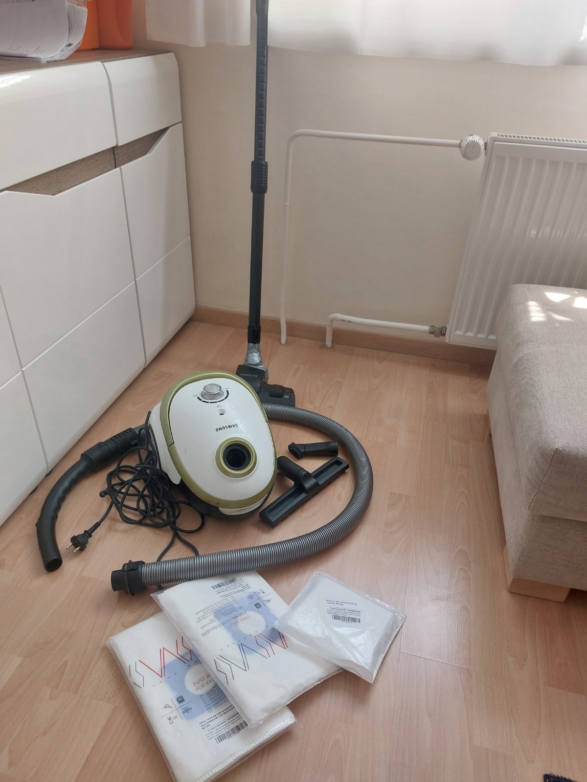 Predám 8- ročný vreckový vysávač zn. Samsung. Vysávač je po motorickej stránke plne funkčný, príkon 1200 W, sací výkon: 330 W, hlučnosť 81 dB, EPA filter, elektronický ukazovateľ naplnenia vrecka, dĺžka prívodného kábla 6 metrov, akčný rádius 9,2 m, objem vrecka 2,5 l. K vysávaču je ako príslušenstvo štrbinová hubica (nepoužitá) a hubica na prah. Vysávač má veľmi silný sací výkon, je však pokazené samonavýjanie kábla a zlomená parketovú hubica (priemer rúrky 3 cm), čo je zohľadnené v cene. Po dokúpení univerzálnej náhradnej podlahovej hubice (ceny od 7 eur), je plne využiteľný so silnejším výkonom ako súčasné vysávače. K vysávaču za 10 eur ponúkam aj pred mesiacom zakúpených 8 originál vreciek a motorový filter v hodnote spolu 19 eur. Iba osobný odber Petržalka.