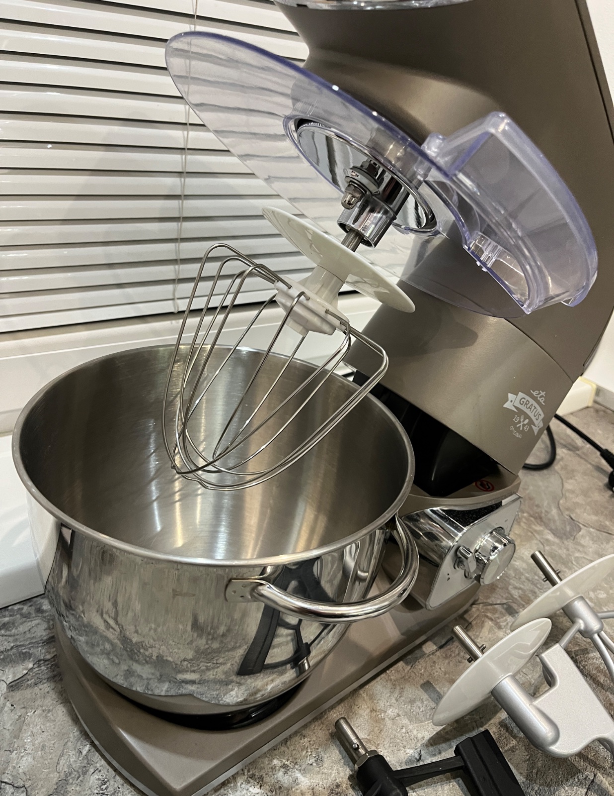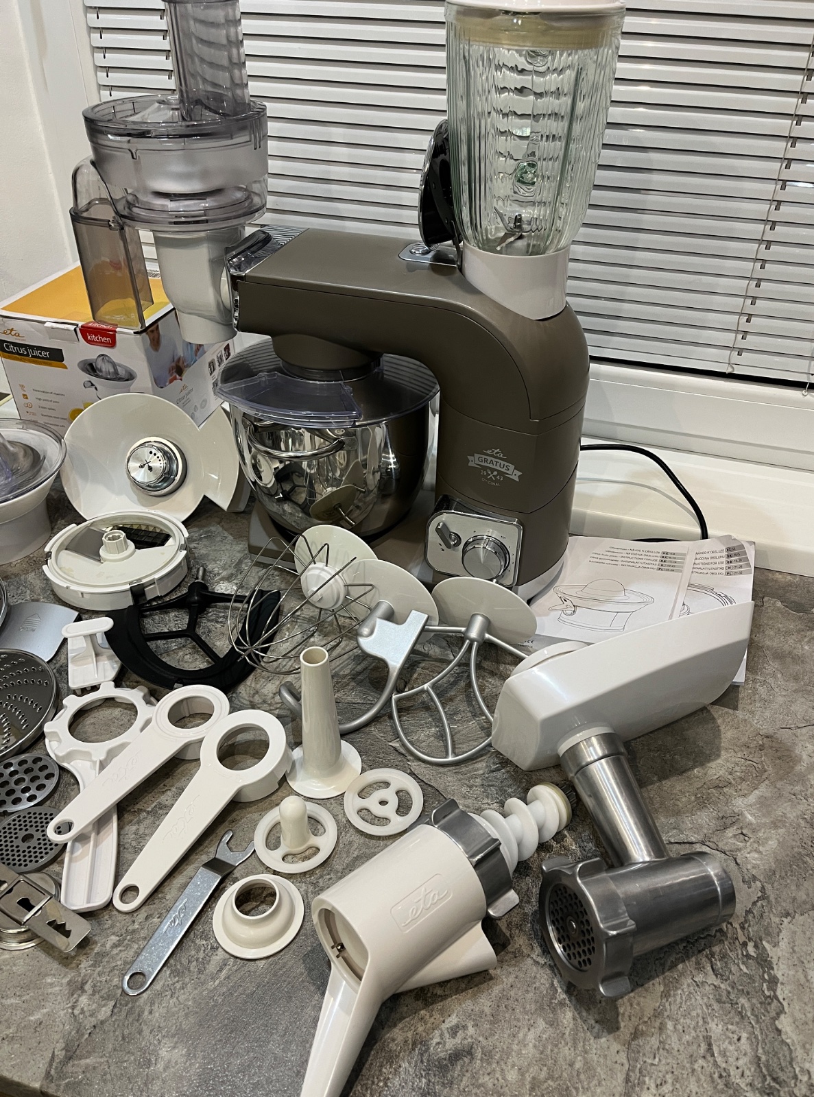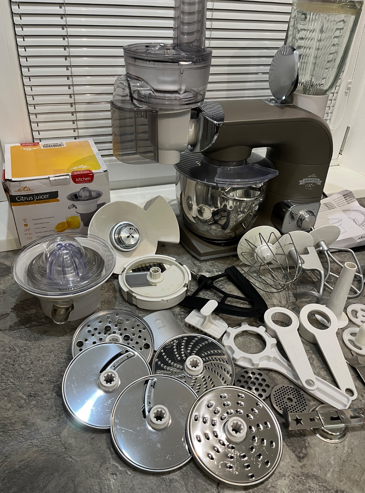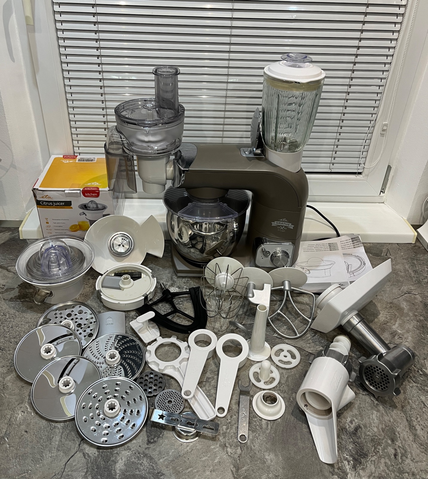 Dobrý deň, predám kuchynský robot ETA Gratus 0028 90030, robot je vo vynikajúcom stave, dokúpené veľké množstvo príslušenstva ako kockovač, odšťavovač, lis na citrusy, mlynček na mak, všetko na fotkách, ponúkam za 280€, tel.č. +421918861438 BA Podunajské Biskupice, viem doviezť cestou na Záhorie, Skalica, Trnava, Nitra, Zlaté Moravce, Levice, NZ, DS, alebo pošlem Packeta.
