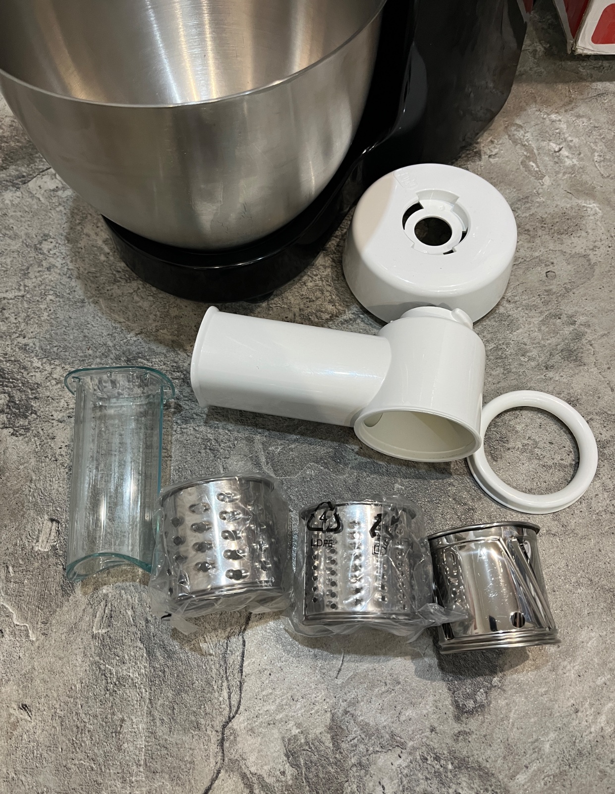 Dodáva sa s cukrárskou sadou: patentovaná metla Flex Whisk pre šľahanie riedkych surovín, plastová metla na cukrárske cesto, antikorový hnetací hák na ťažké cesto