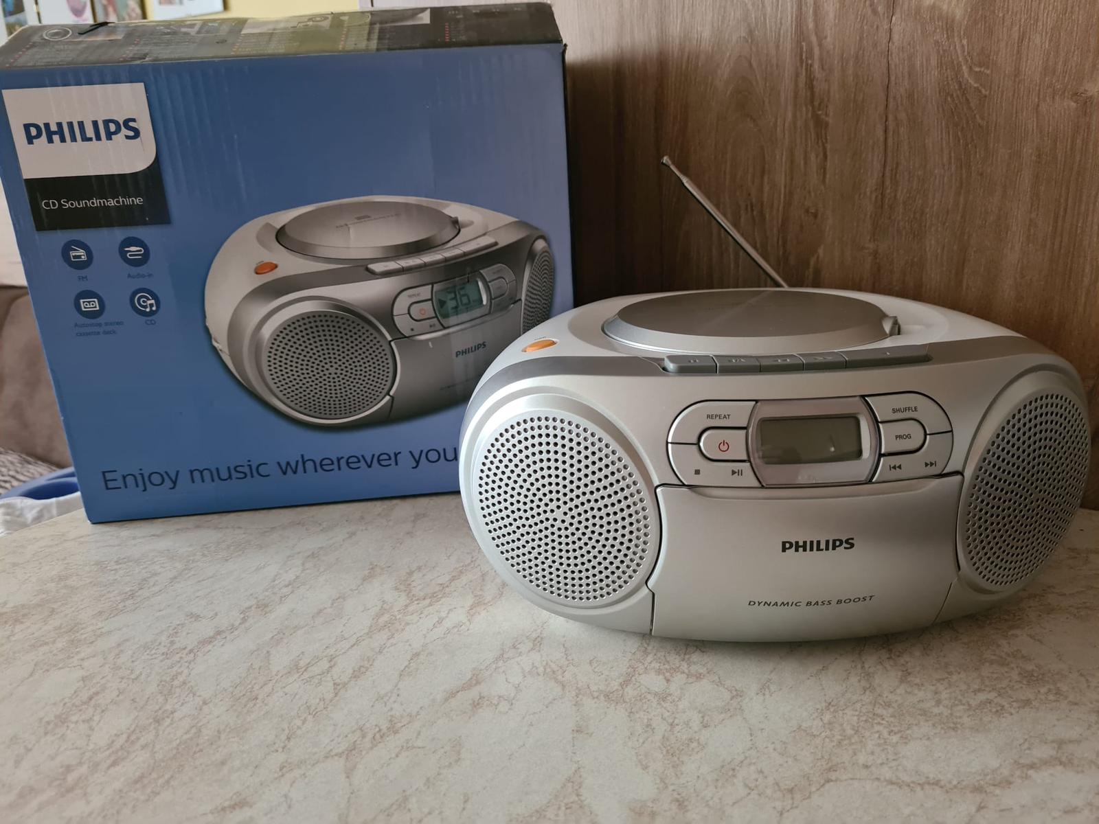 Nepoškodený, plne funkčný Rádiomagnetofón s CD, kazetový prehrávač, AUX vstup, analógový tuner, výkon 2 W, dynamické zvýraznenie basov.