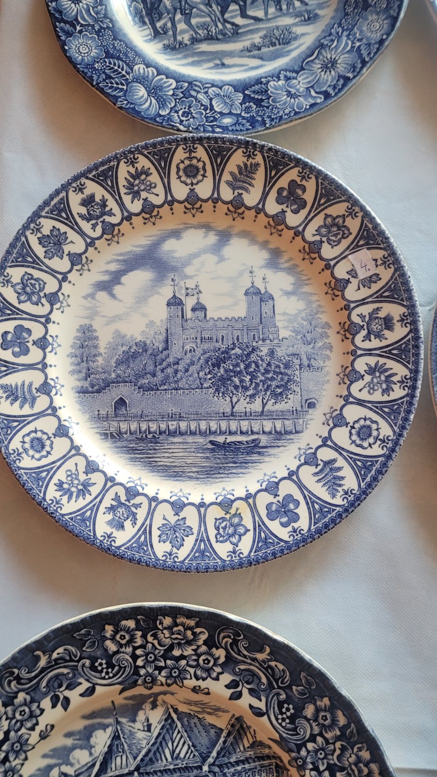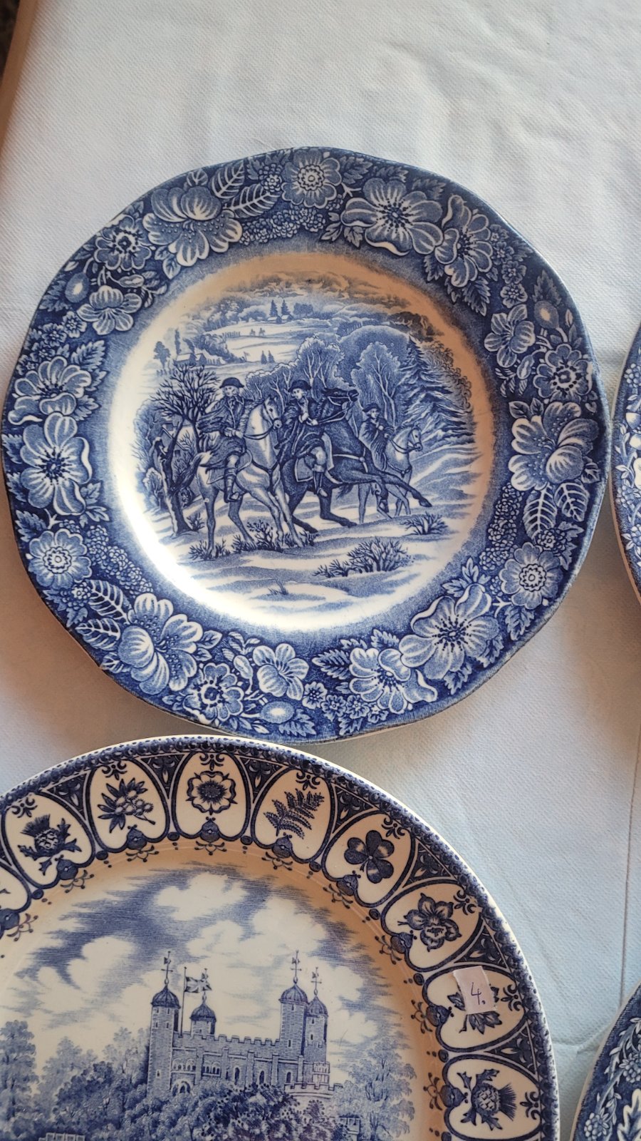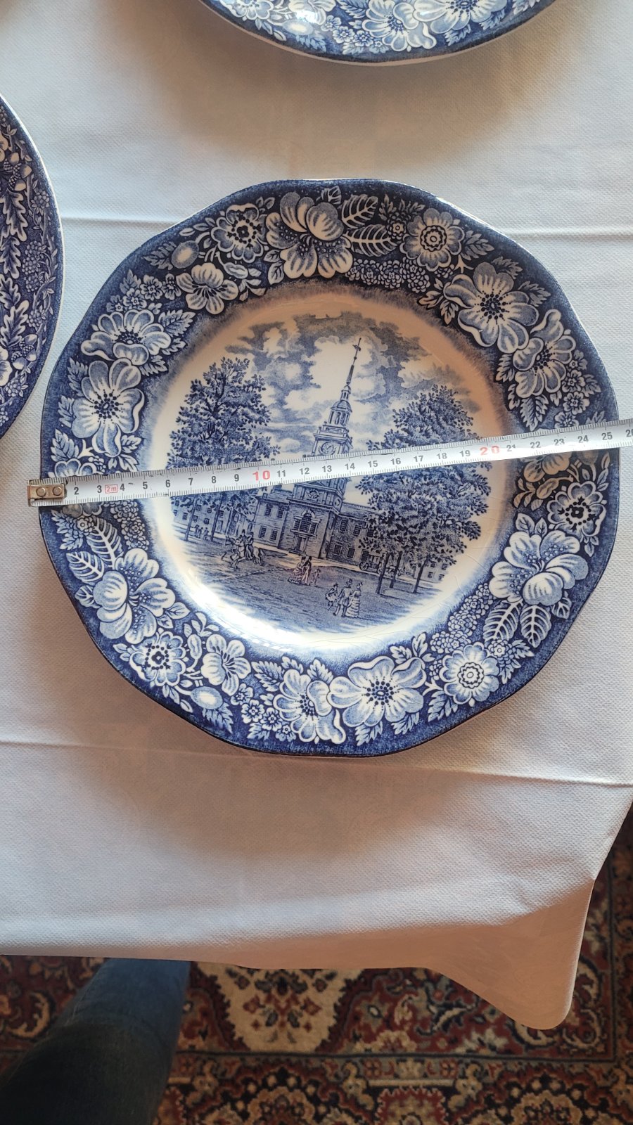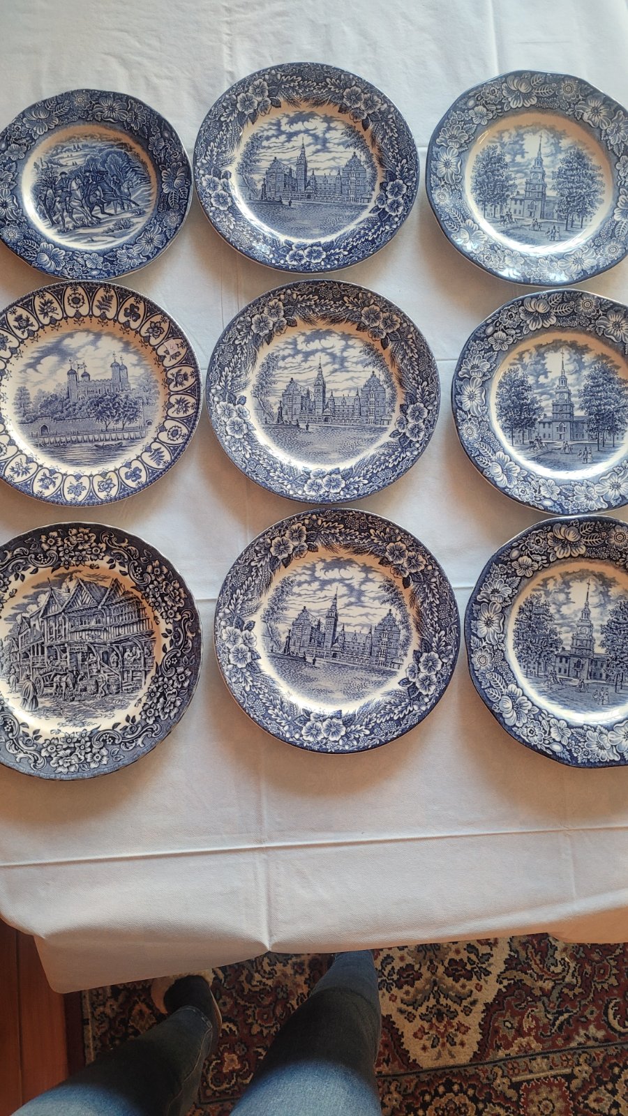 Predám 9 kusov anglických modrých tanierov, 8 kusov priemer 25 cm a 1 kus priemer 22 cm. Vid. obrazok. Cena 8 eur za kus.