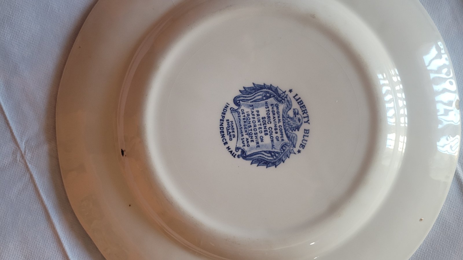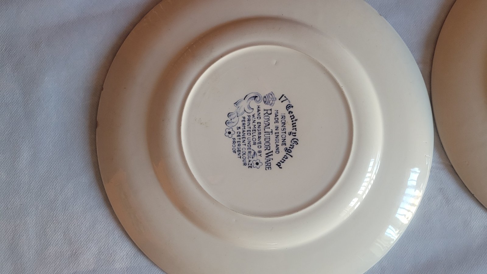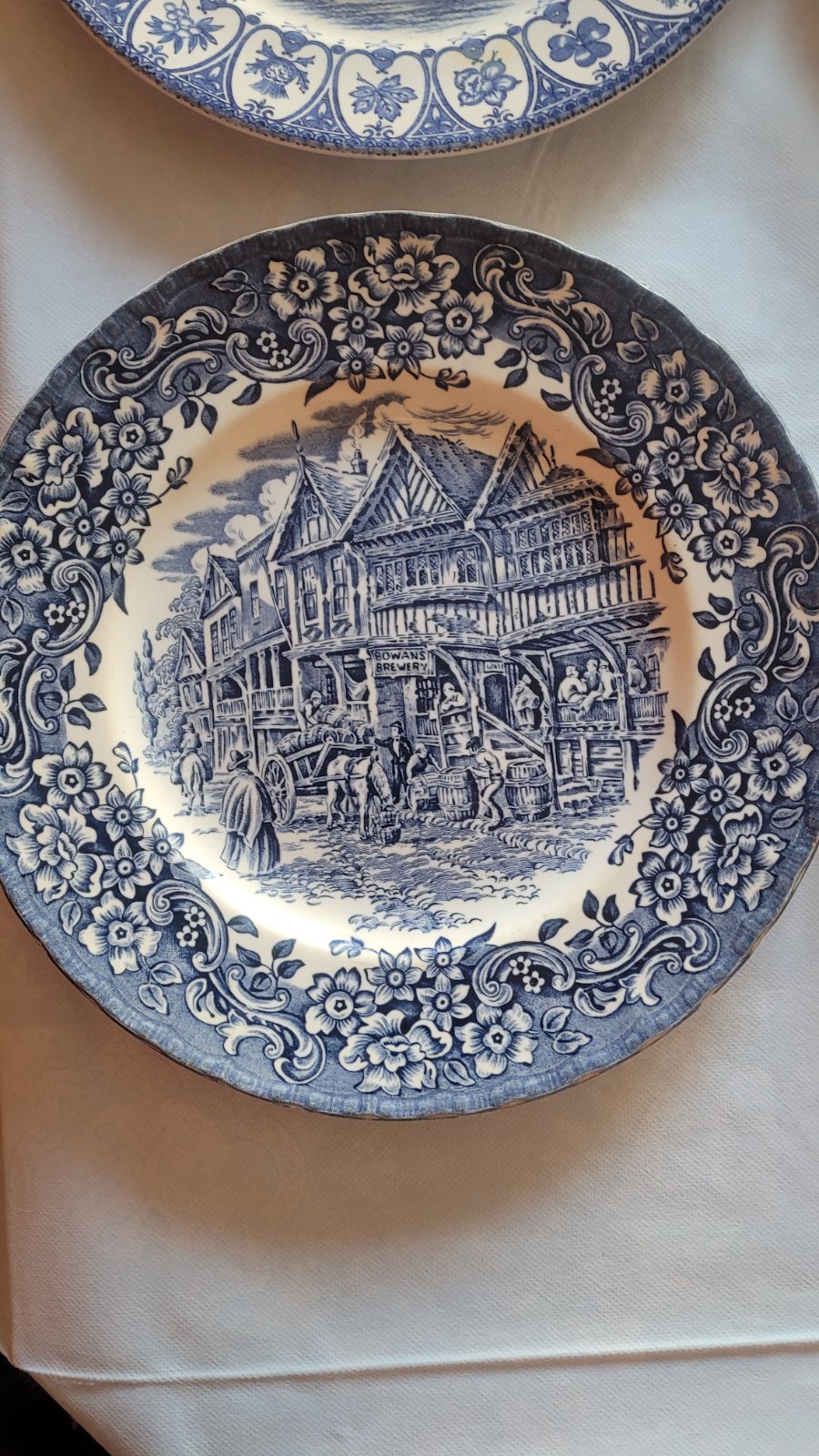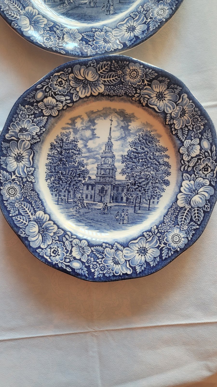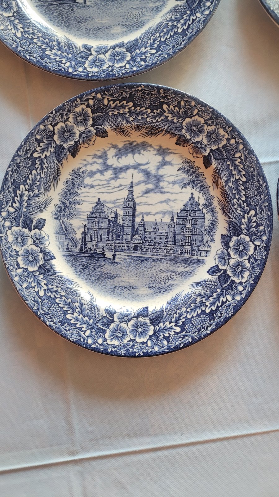 Predám 9 kusov anglických modrých tanierov, 8 kusov priemer 25 cm a 1 kus priemer 22 cm. Vid. obrazok. Cena 8 eur za kus.
