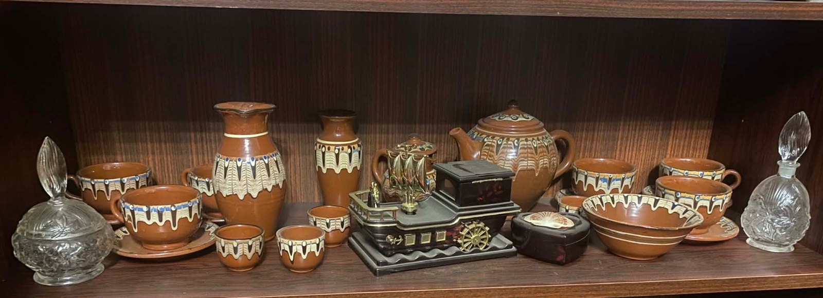 Predám hnedú keramickú sadu v retro/chalupárskom štýle. Súčasťou predaja sú hrnčeky, šálky s podšálkami, misy, kanvica, cukornička a vázy (viď foto).