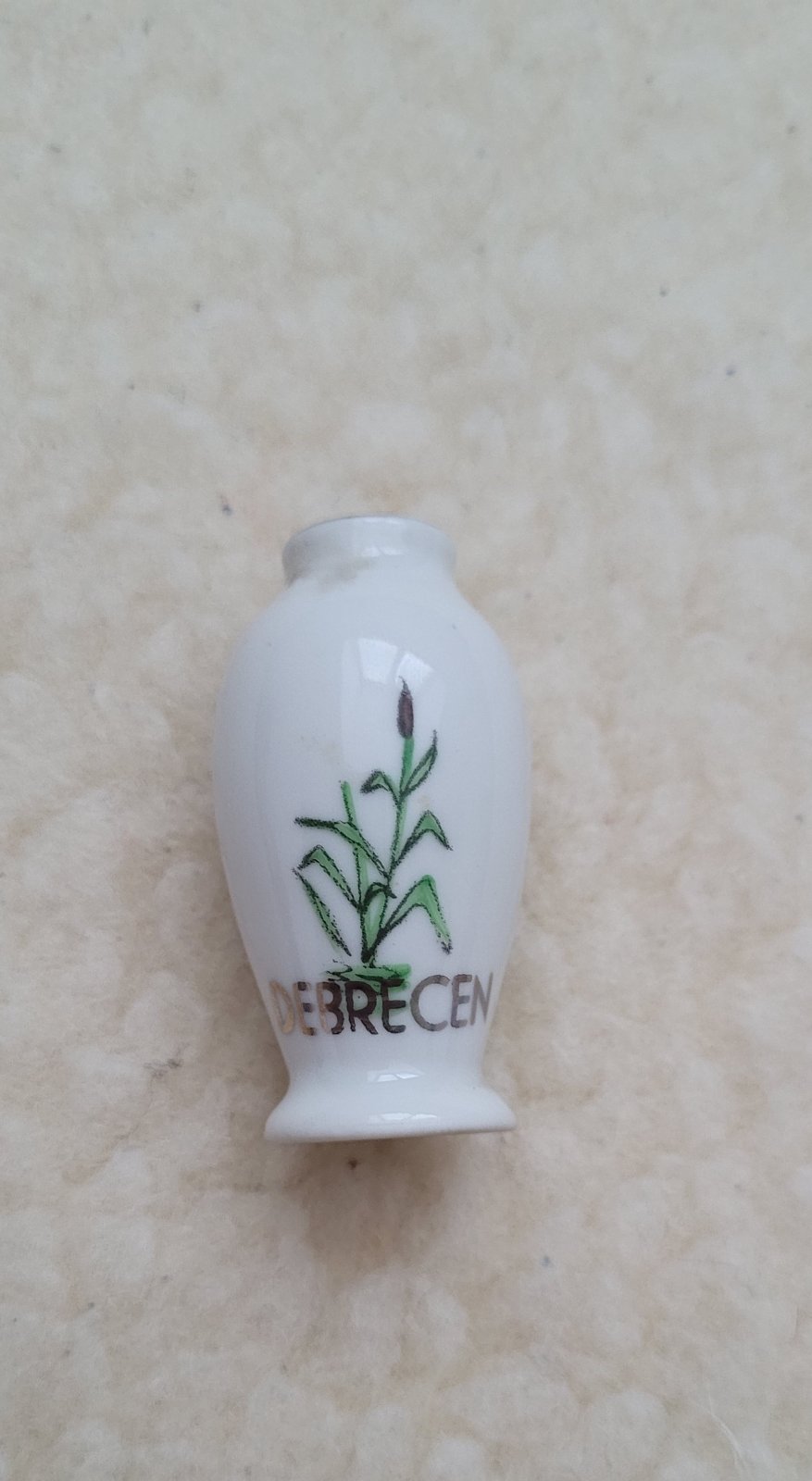 Je zn. Hollóháza. Zdobená ručne maľovaným rastlinným motívom a nápisom „Debrecen“, čo naznačuje, že ide o suvenír z tohto mesta. Neporušená.
