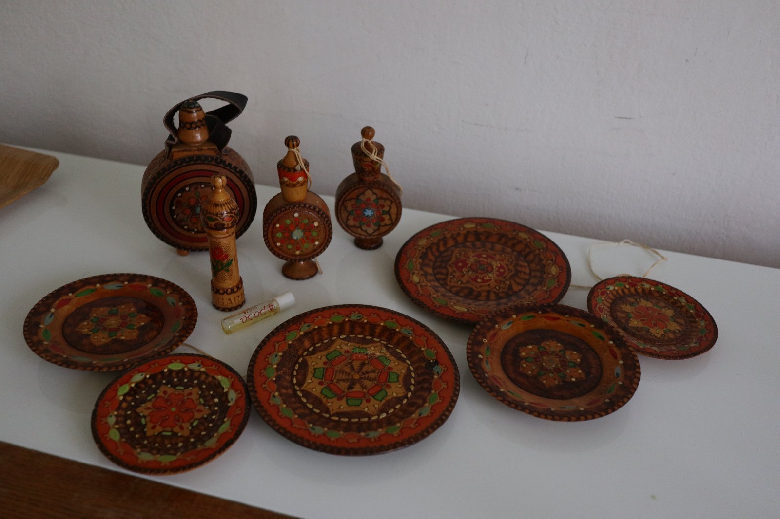 - typické drevené folklorne tanieriky s vypalovaným vzorom a farbením, spolu 8€,