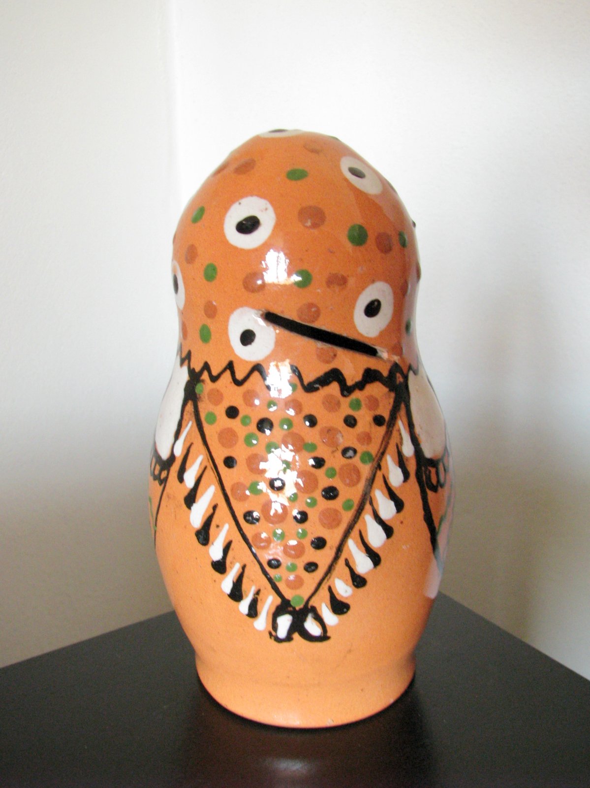 Stará vintage maľovaná keramická figúrka - matrioška strednej veľkosti s otvorom vzadu na hlave, slúžiaca pôvodne ako pokladnička alebo len na dekoráciu. Pár malých šuchnutí okolo otvoru, inak výborne zachovalá, bez poškodení. To biele na ústach a inde sú len odlesky, je lesklá. V prípade záujmu premeriam.