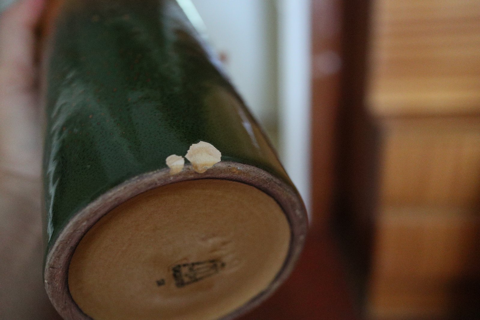 -retro vysoká váza žltozelena, výrobca Kravsko ČSSR, nadčasový dizajn, malý oťuk, vhodné aj na vysoke kvety - gladiole, ruže, maxi kytice, 12€