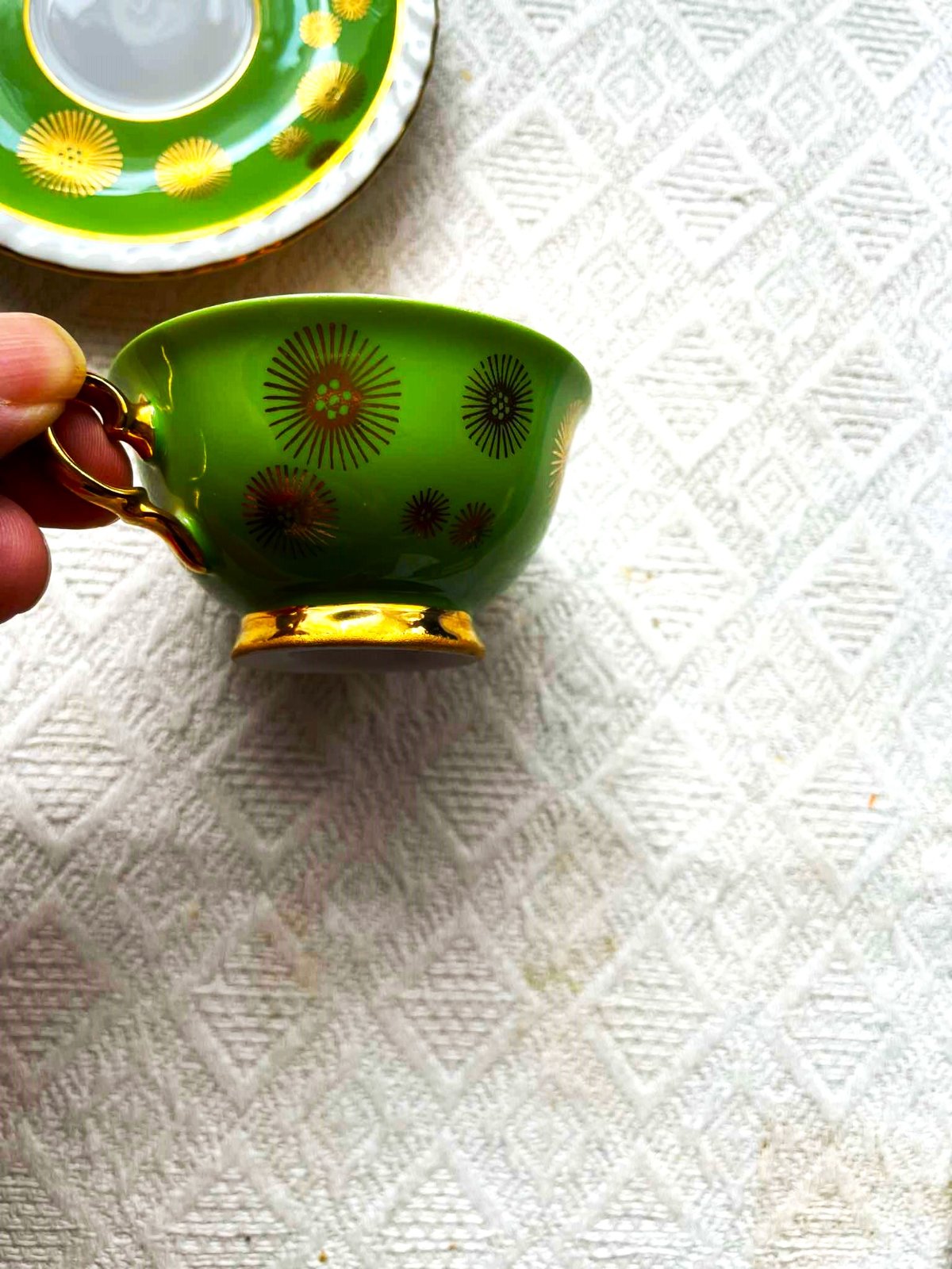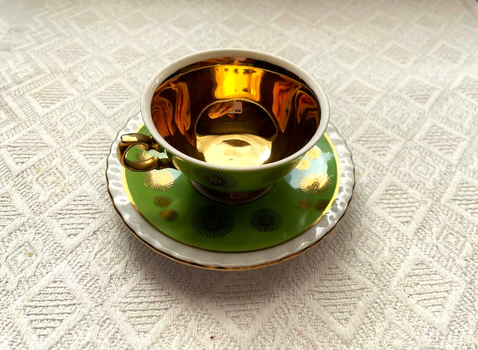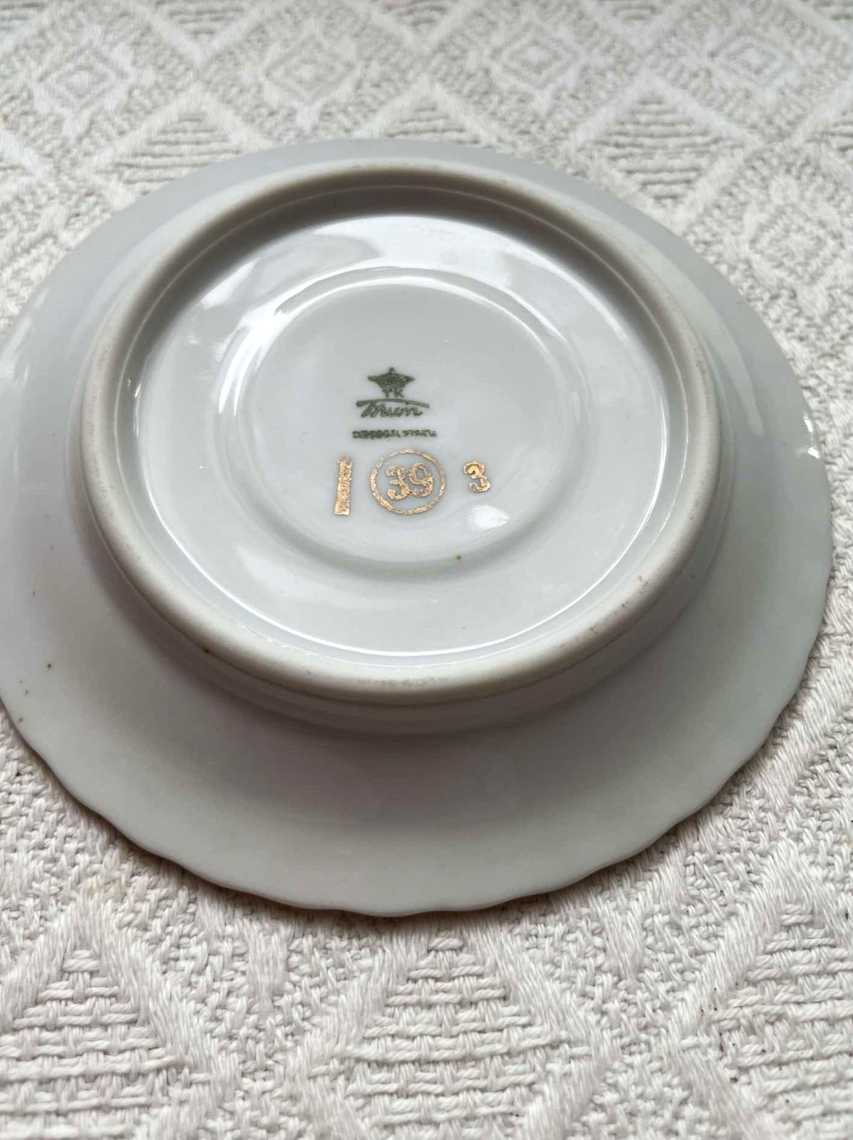 krásna mocca stará porcelánová súprava značky Thun Marie Louise Karlovarský porcelán.Súprava je kompletná,nebola nikdy ani raz použitá, nemá ani jeden škriabaneček,vitrínový stav, materiál: pravý Československý porcelán,vnútro šáločiek je zlaté, tanierik zdobený zlatom.Výška šáločky = 4 cm,priemer = 7 cm