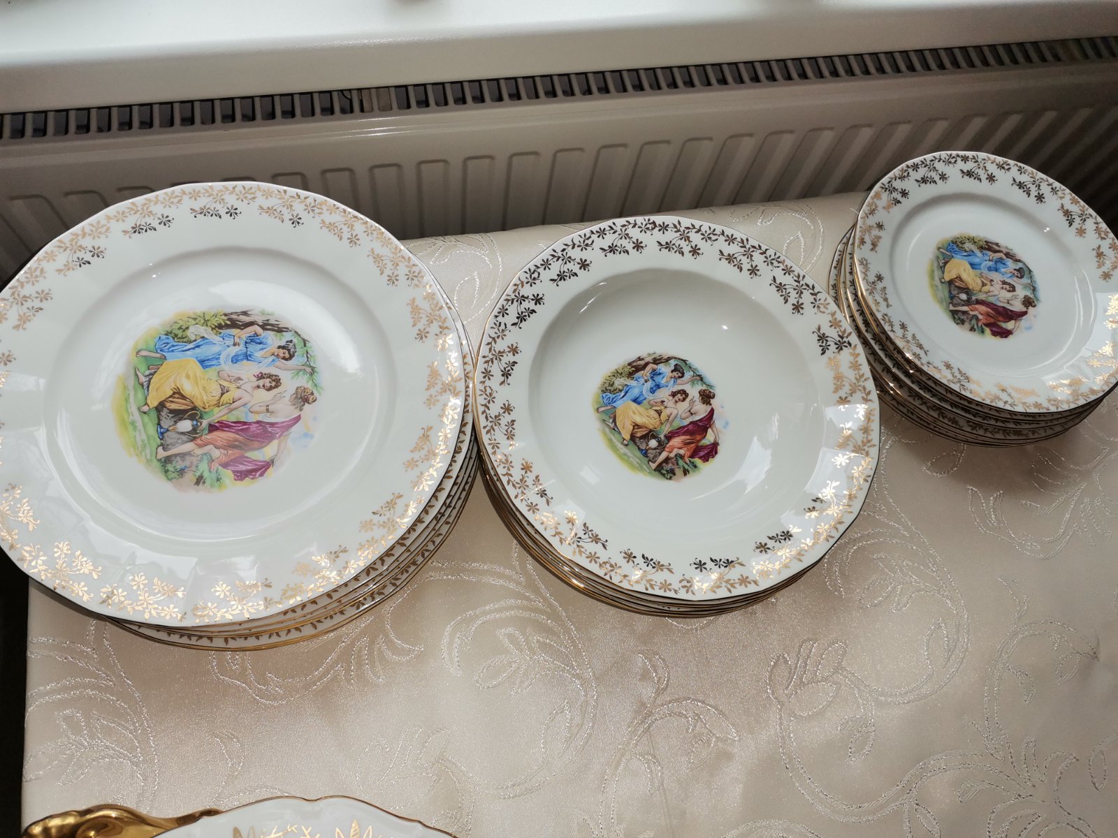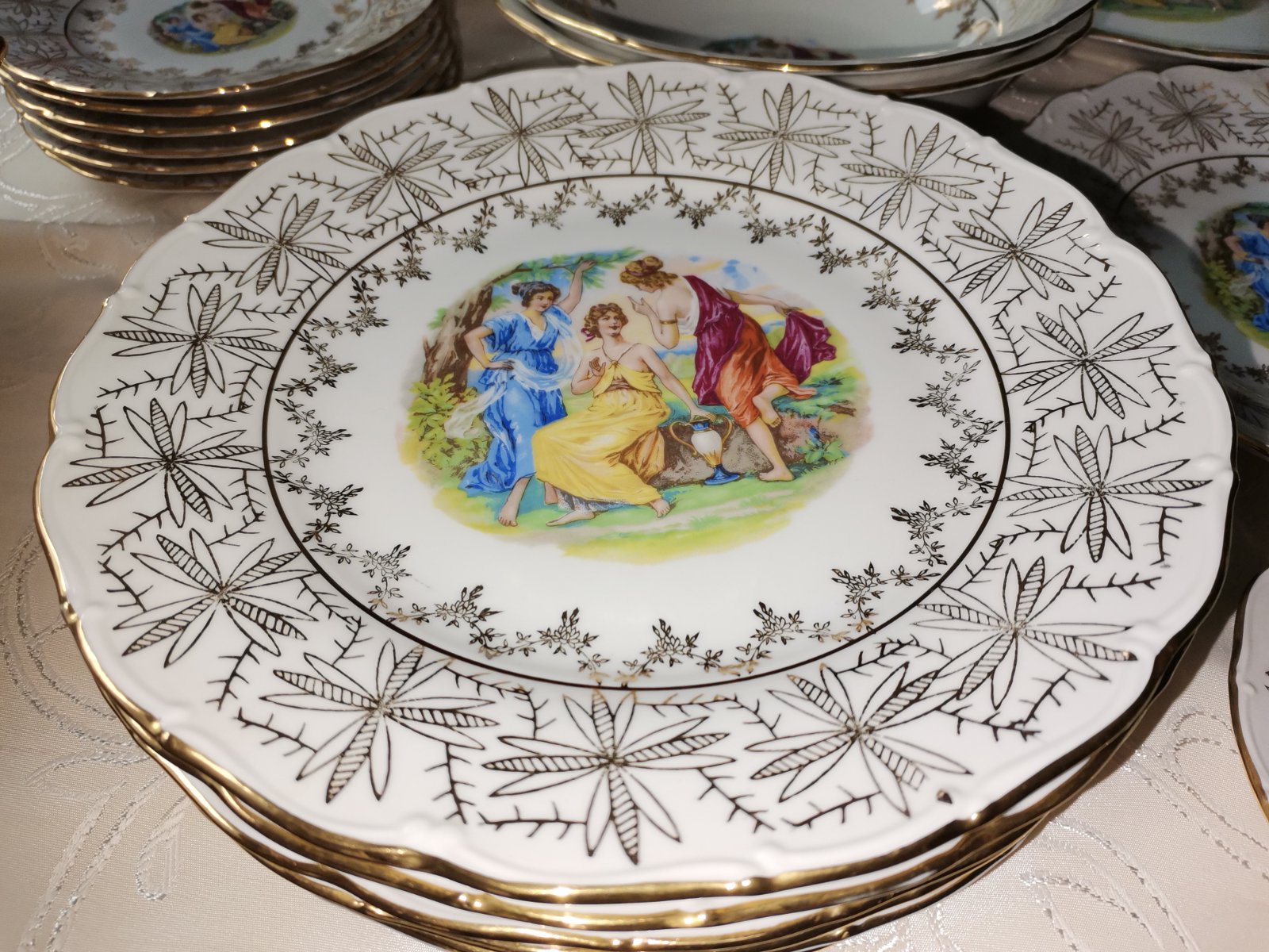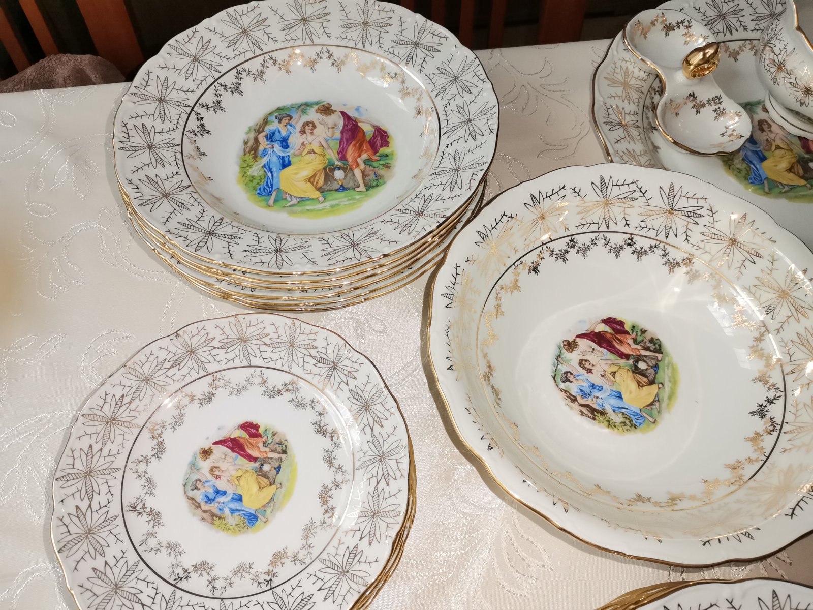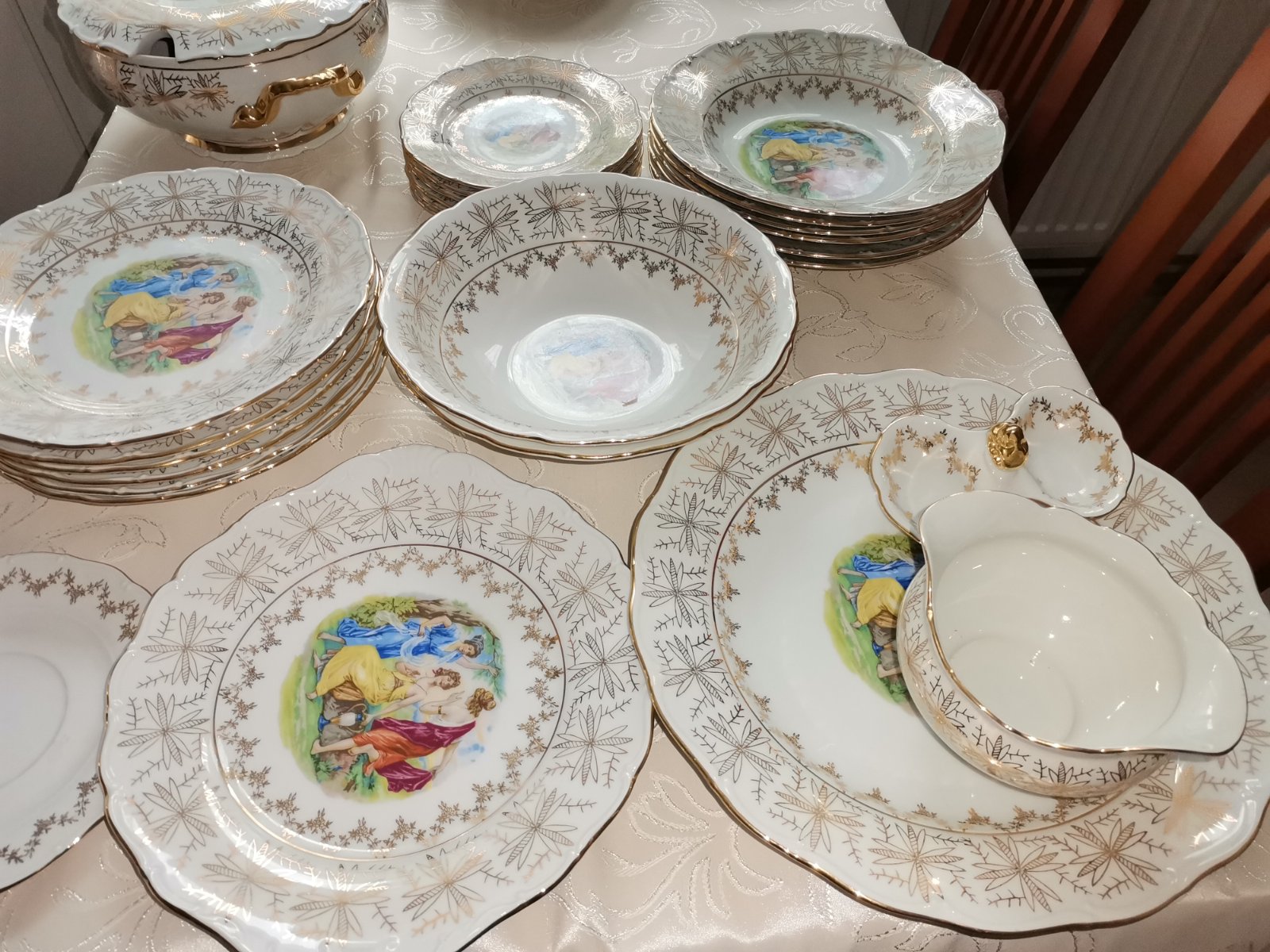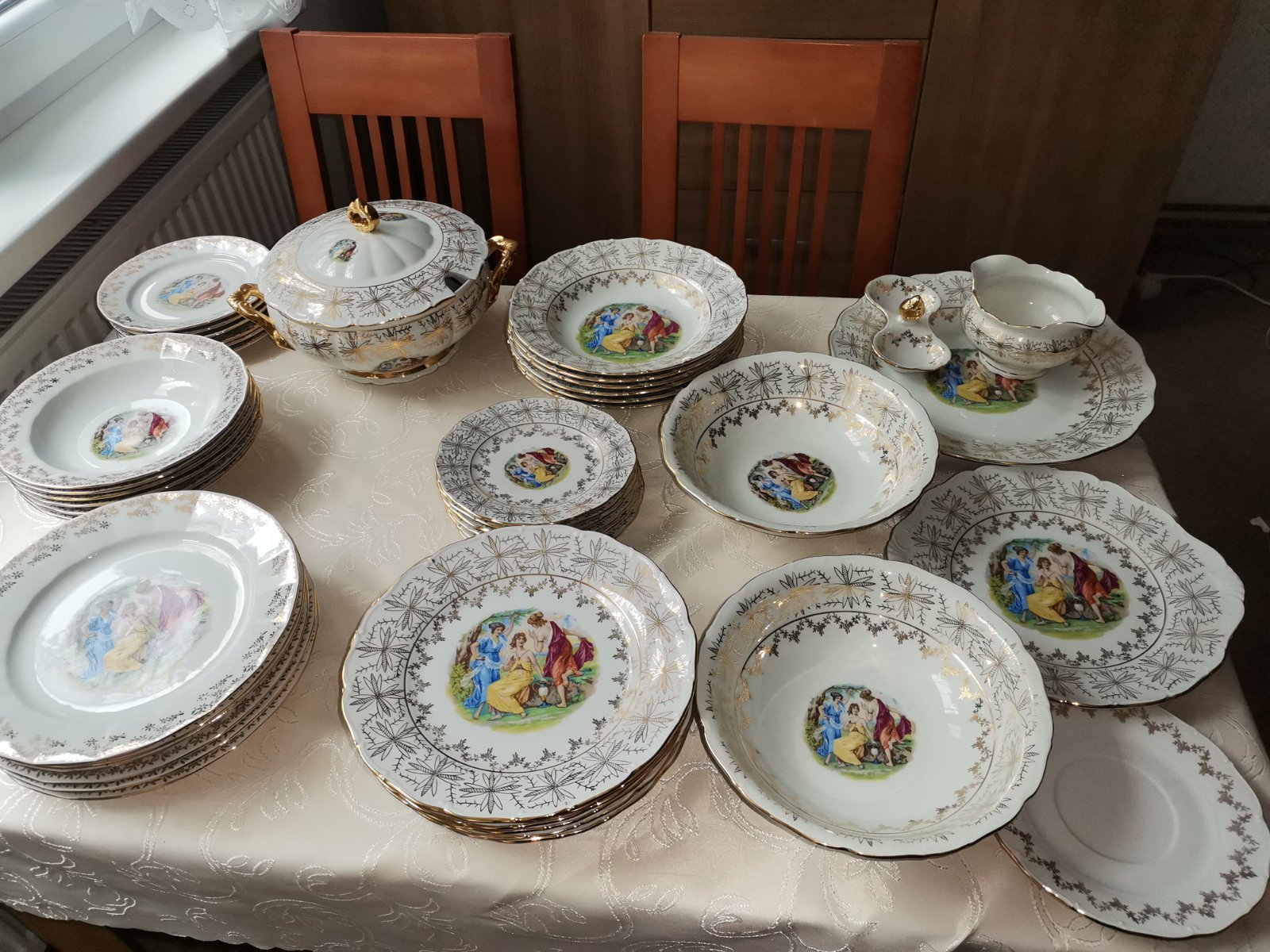 Obedová súprava pre 6 osôb "tri grácie" a k tomu plytké, hlboké a dezertné taniere pre ďalších 6 osôb podobný dekor. Kávová súprava pre 6 osôb menšie šálky, kávová súprava pŕ 6 osôb väčšie šálky, ku každej súprave 2 karafy, nádoba na mlieko a cukornička, zabalené v krabici, nikdy nepoužíté v 100% stave, len osobný odber...