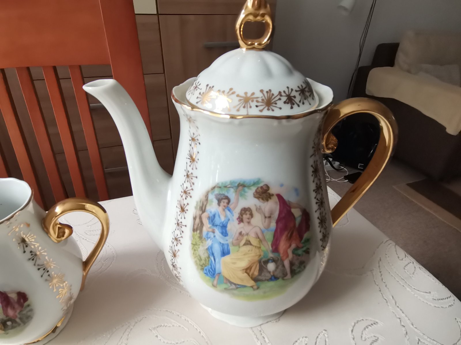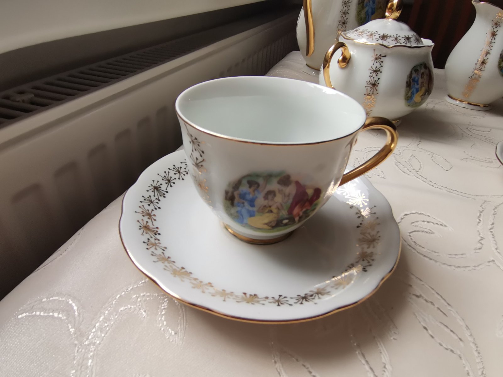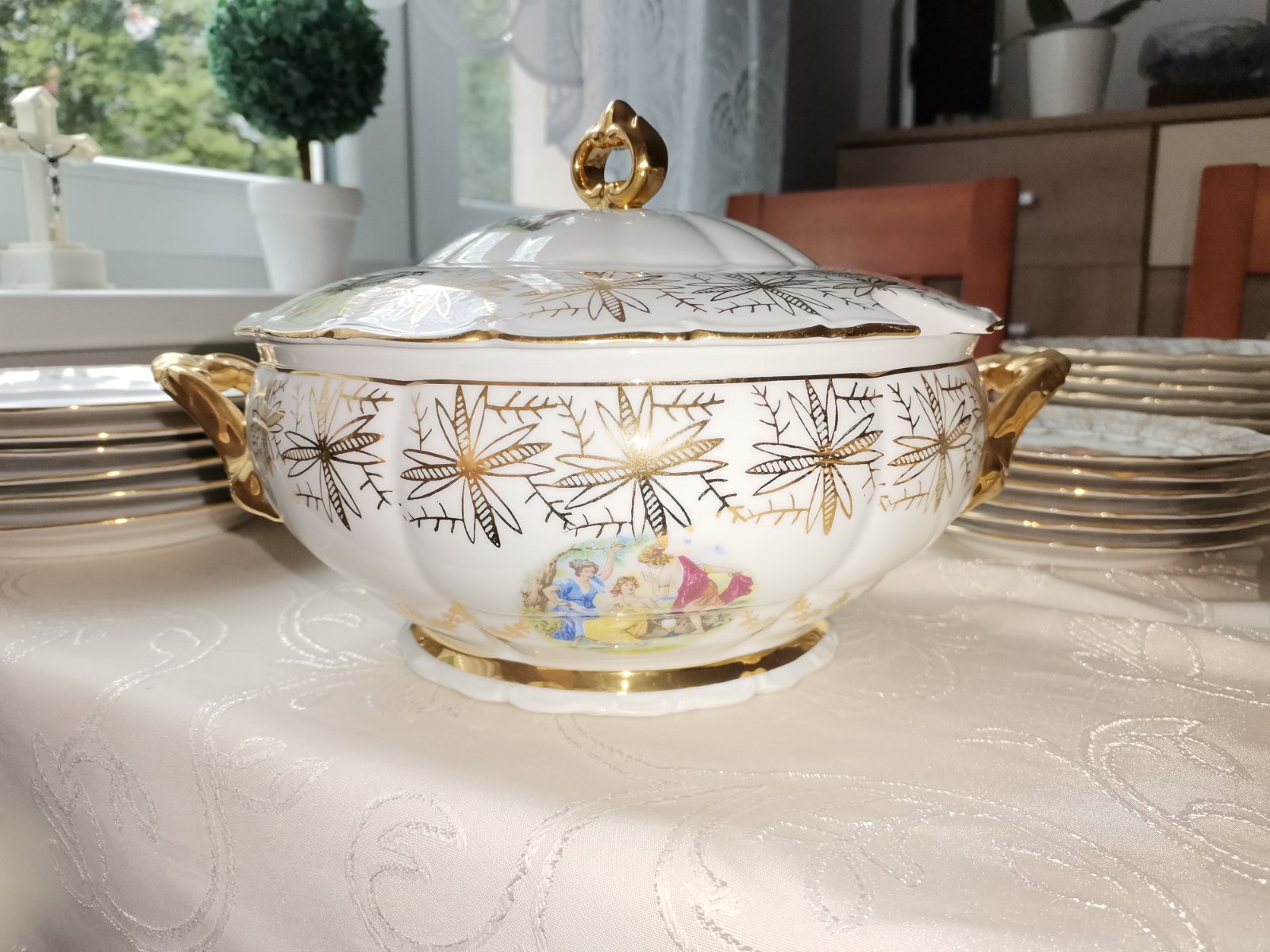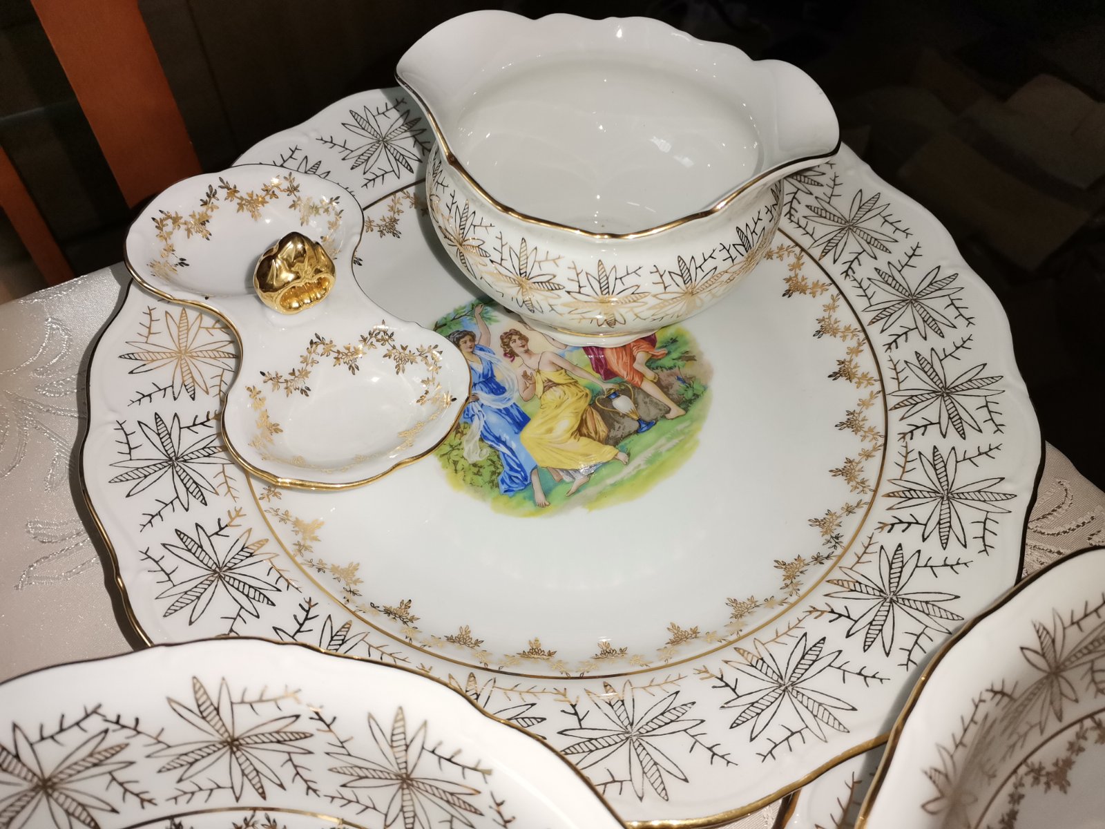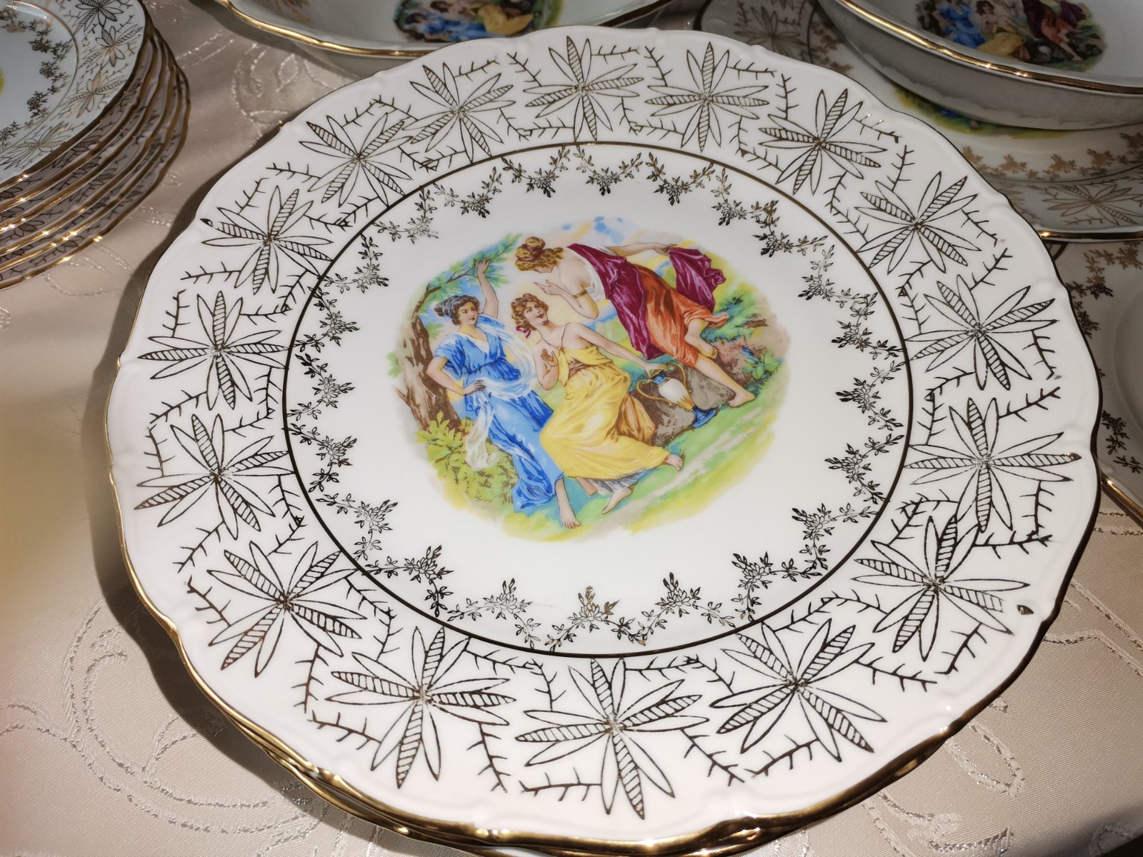 Obedová súprava pre 6 osôb "tri grácie" a k tomu plytké, hlboké a dezertné taniere pre ďalších 6 osôb podobný dekor. Kávová súprava pre 6 osôb menšie šálky, kávová súprava pŕ 6 osôb väčšie šálky, ku každej súprave 2 karafy, nádoba na mlieko a cukornička, zabalené v krabici, nikdy nepoužíté v 100% stave, len osobný odber...