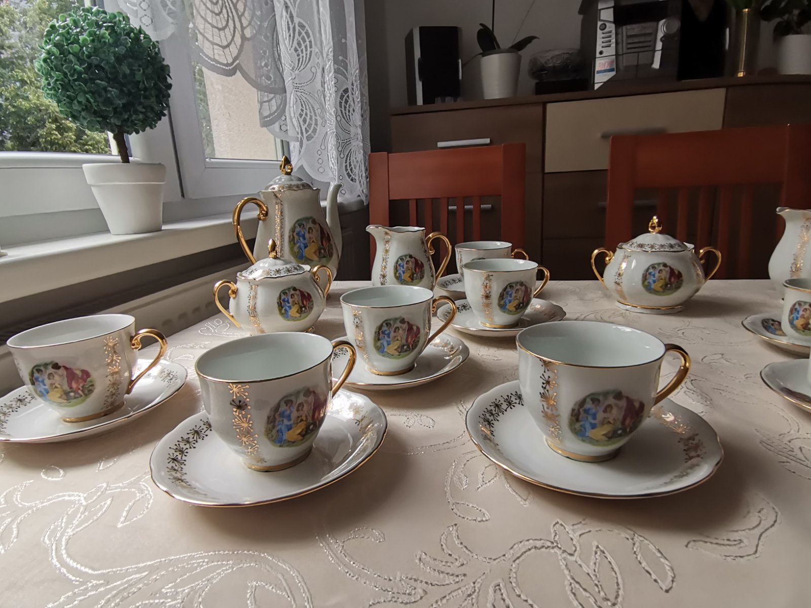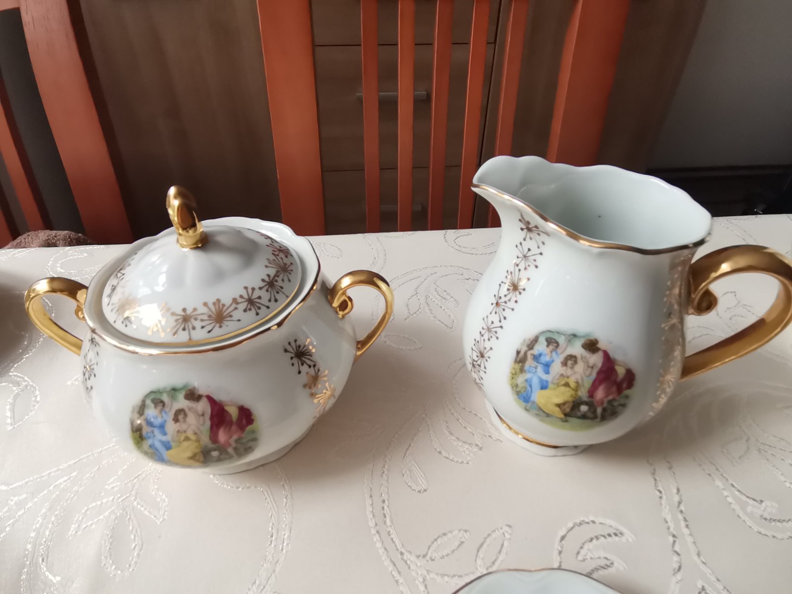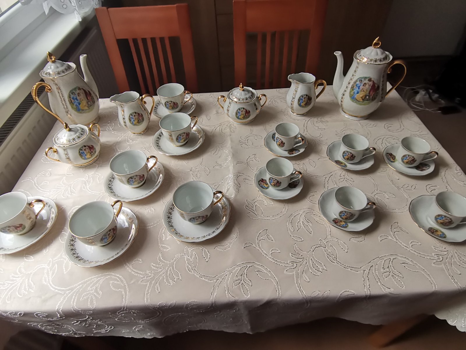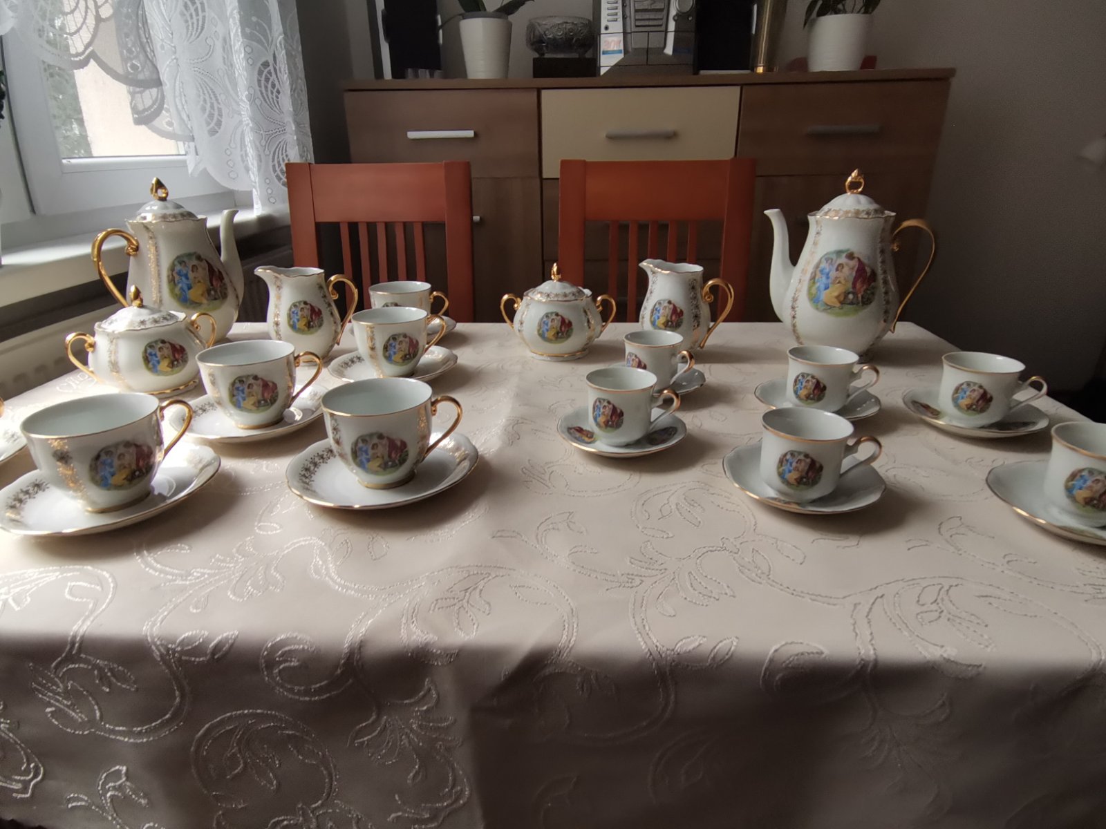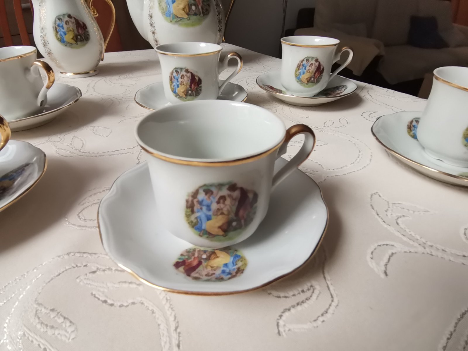 Obedová súprava pre 6 osôb "tri grácie" a k tomu plytké, hlboké a dezertné taniere pre ďalších 6 osôb podobný dekor. Kávová súprava pre 6 osôb menšie šálky, kávová súprava pŕ 6 osôb väčšie šálky, ku každej súprave 2 karafy, nádoba na mlieko a cukornička, zabalené v krabici, nikdy nepoužíté v 100% stave, len osobný odber...
