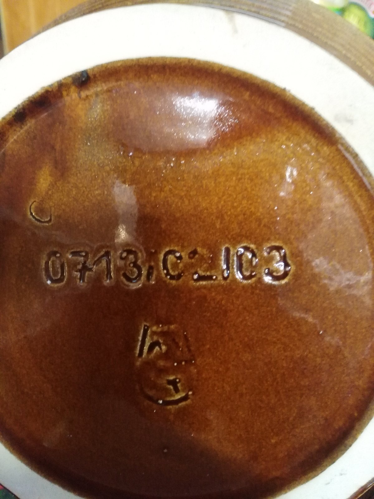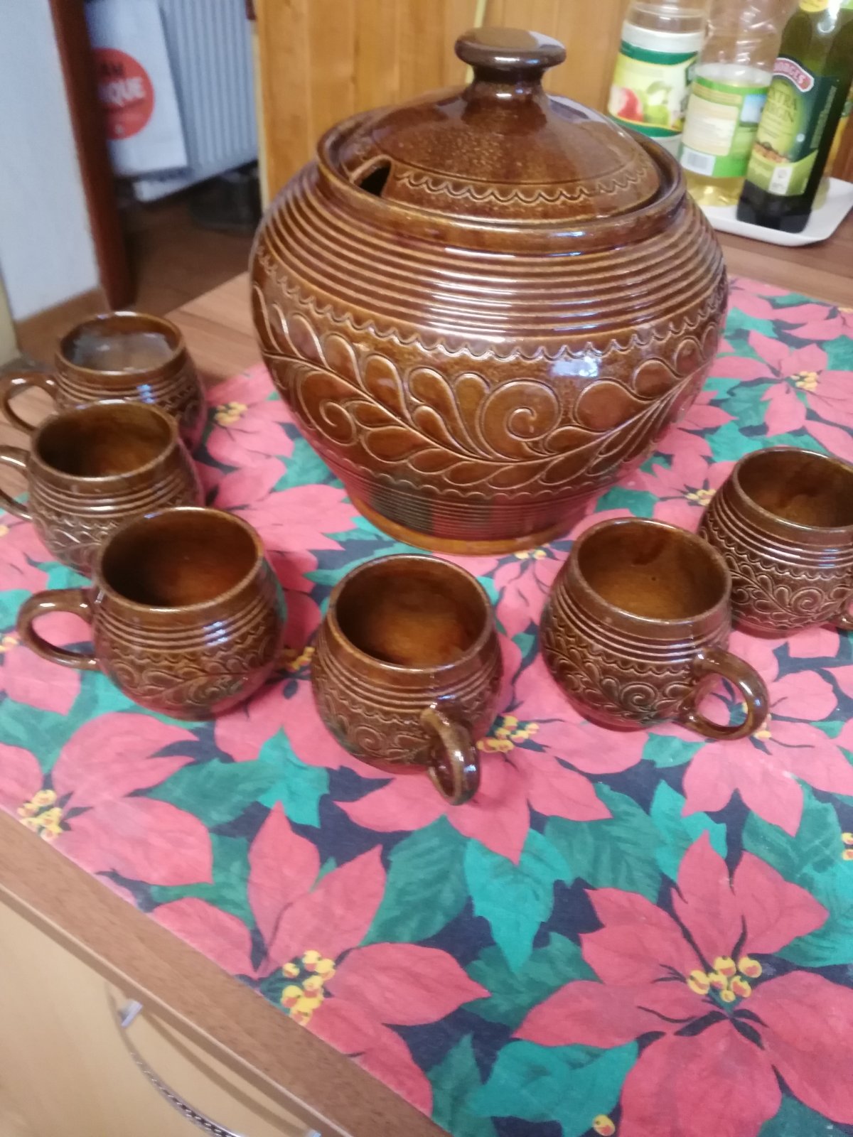 Krasna starozitna znacena nadoba, viecko s otvorom pre varesku alebo skor naberacku, k tomu 6 hrncekov, bez poskodenia okrem na jednej sialke na vrchu malicky kusok odlupeny, asi najskor na varene vino.