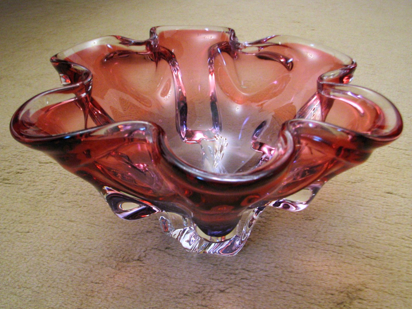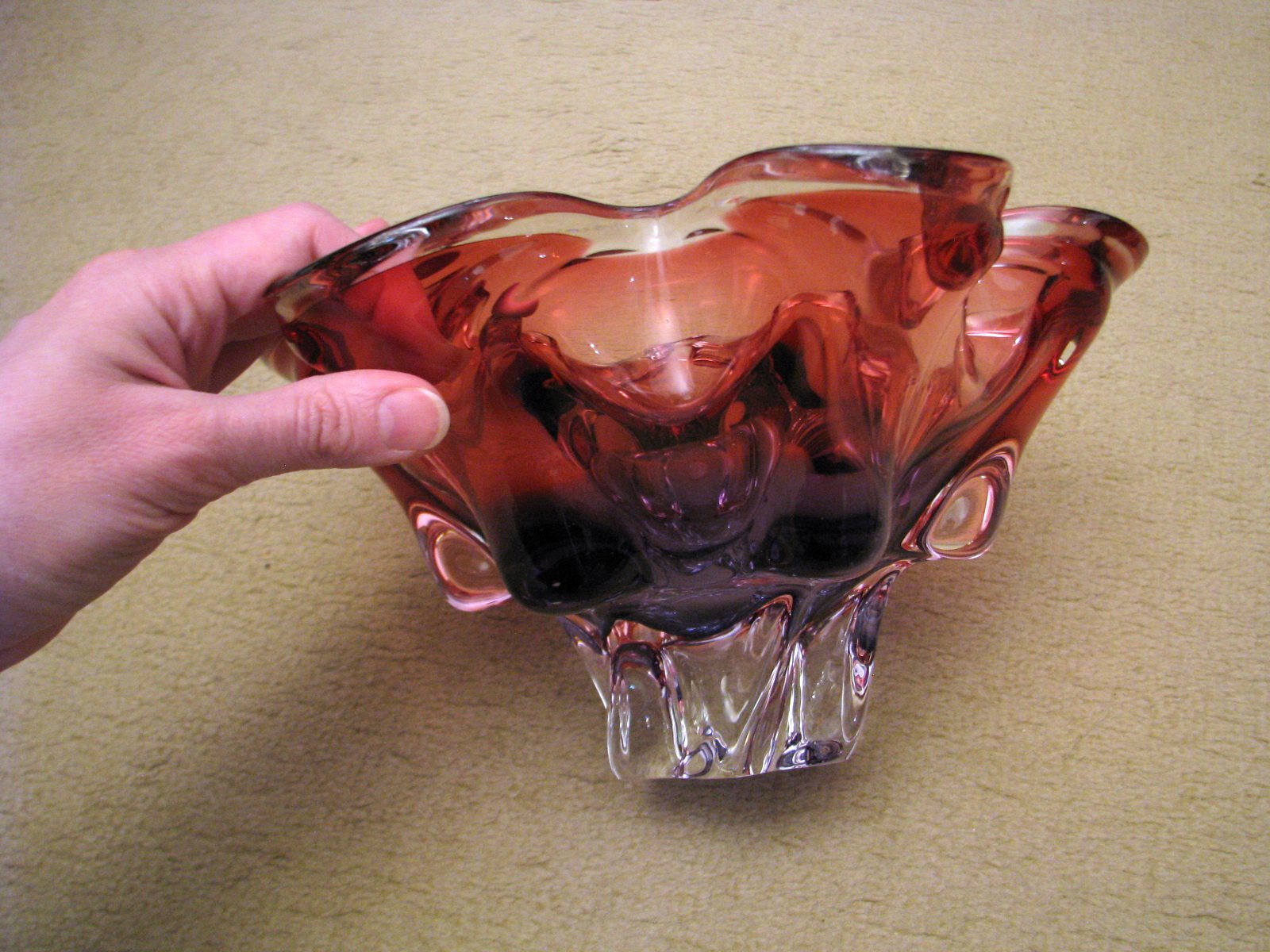 Krásna veľká misa z hutného skla v tvare kvetu, priemer 25,5 cm. Ružová farba, uprostred sa prelínajúca do fialovej, nožička a okraje sú číre. Výborný stav, bez poškodení. Autor návrhu Josef Hospodka, Chřibská, asi 1960, Československo.