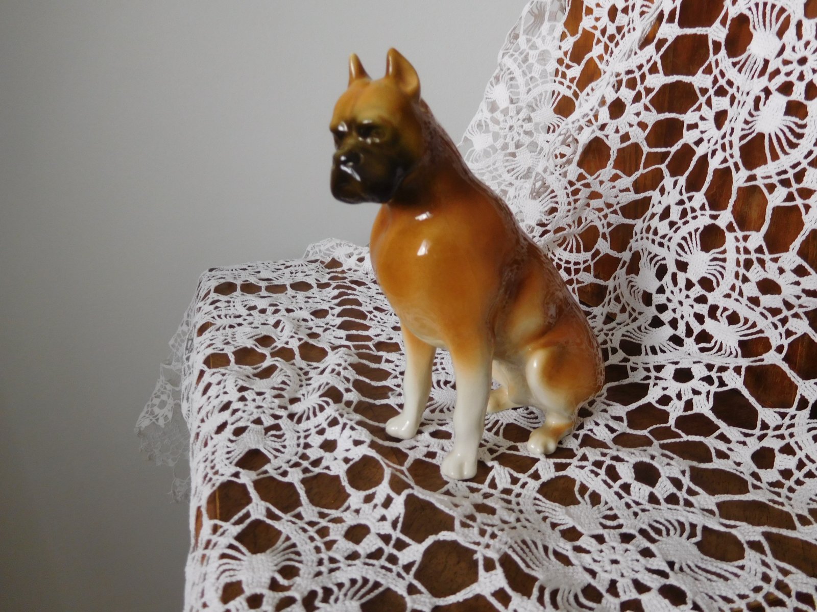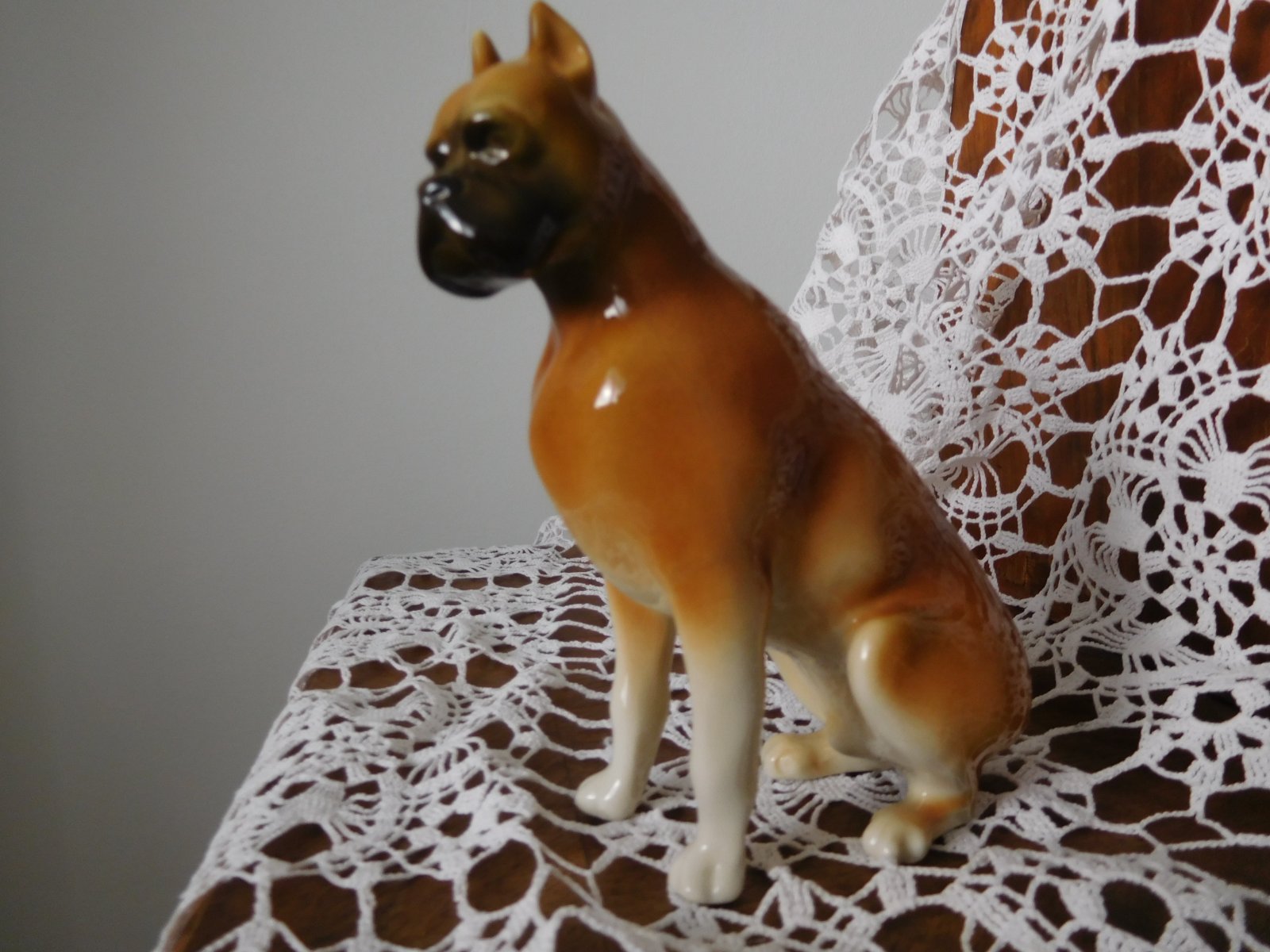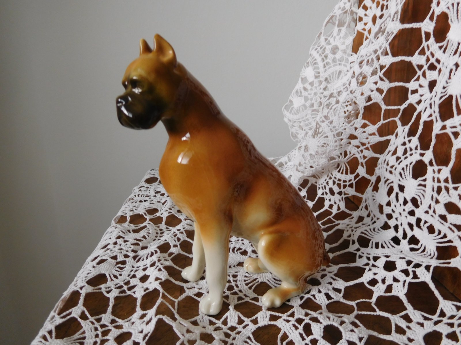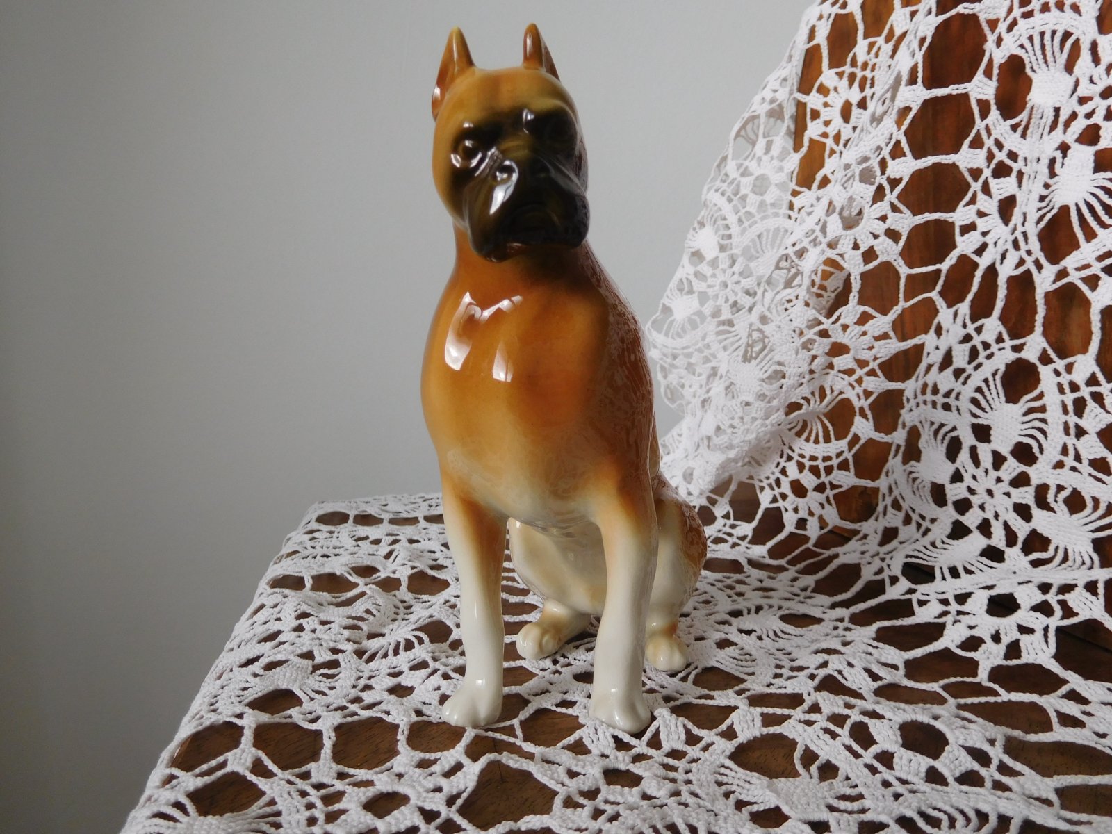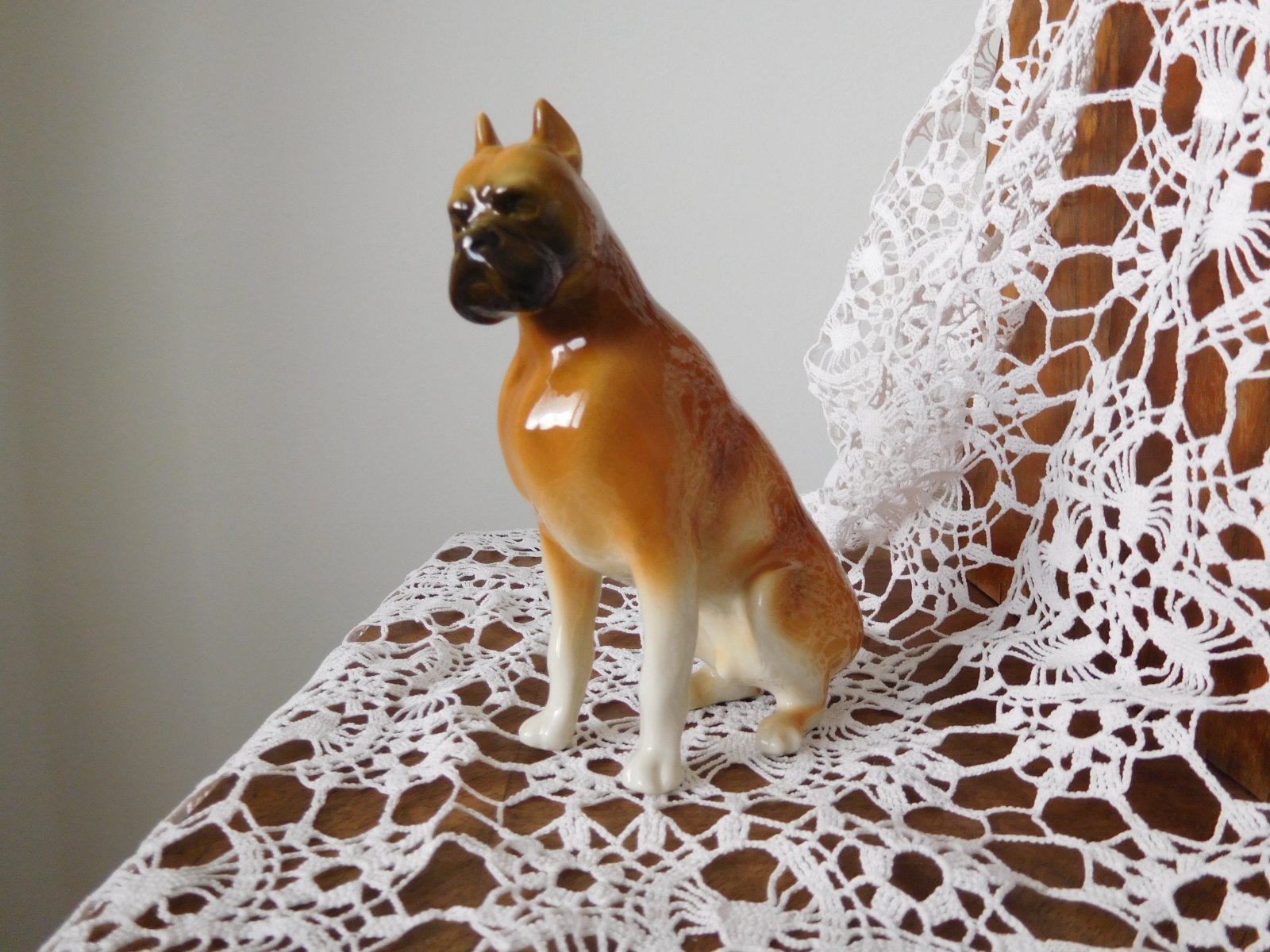 Porcelánová plastika psa boxera od manufaktury Royal Dux. Značená zo spodu plastiky značkou, ktorá sa používala od roku 1960-1978.