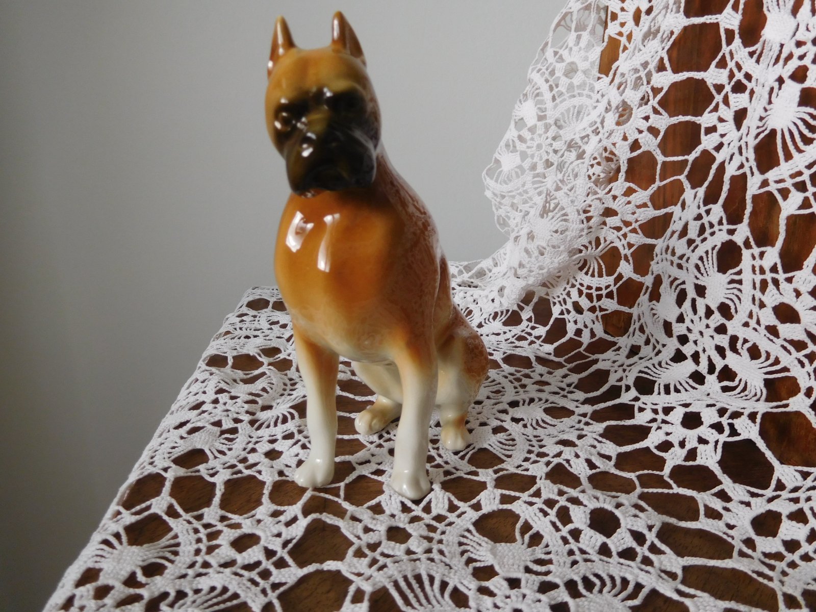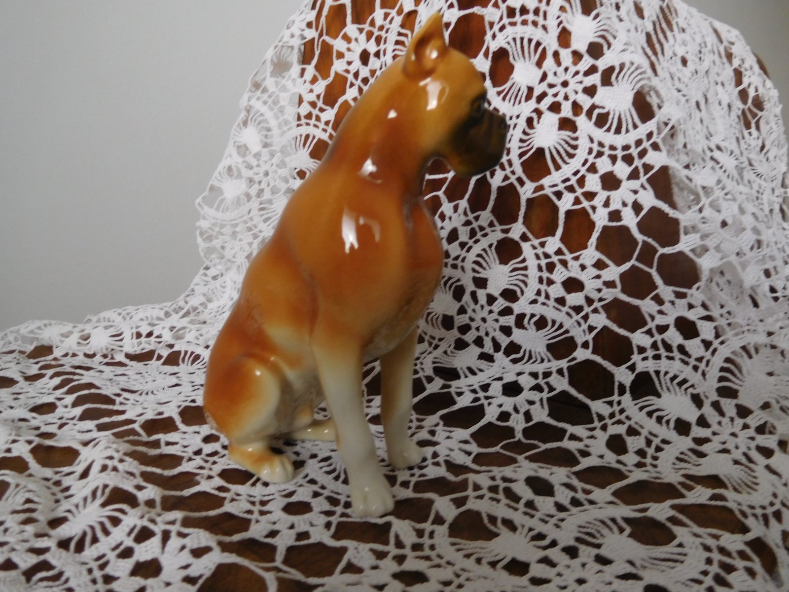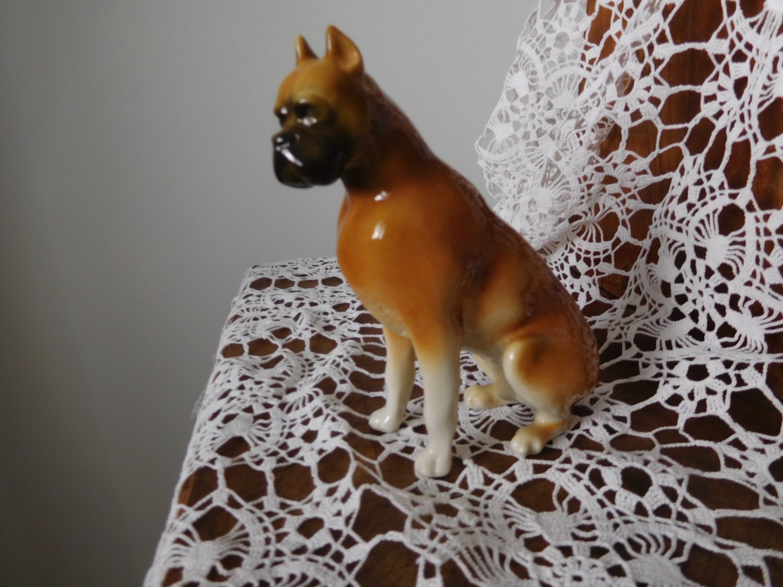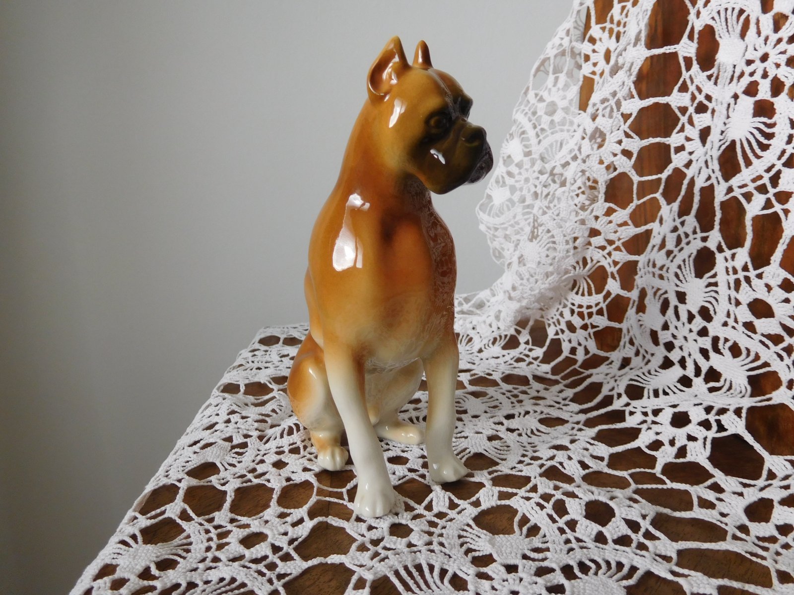 Porcelánová plastika psa boxera od manufaktury Royal Dux. Značená zo spodu plastiky značkou, ktorá sa používala od roku 1960-1978.