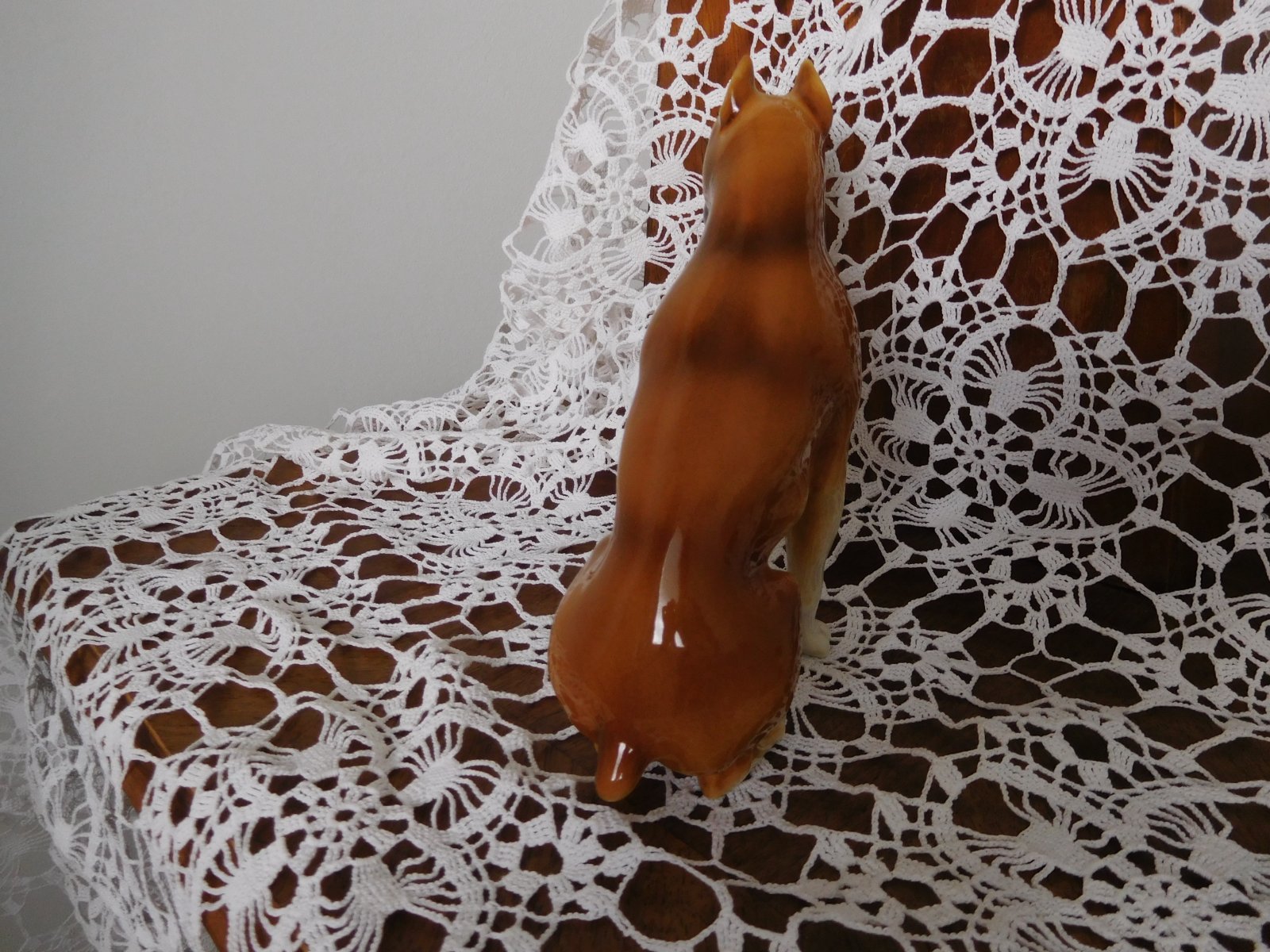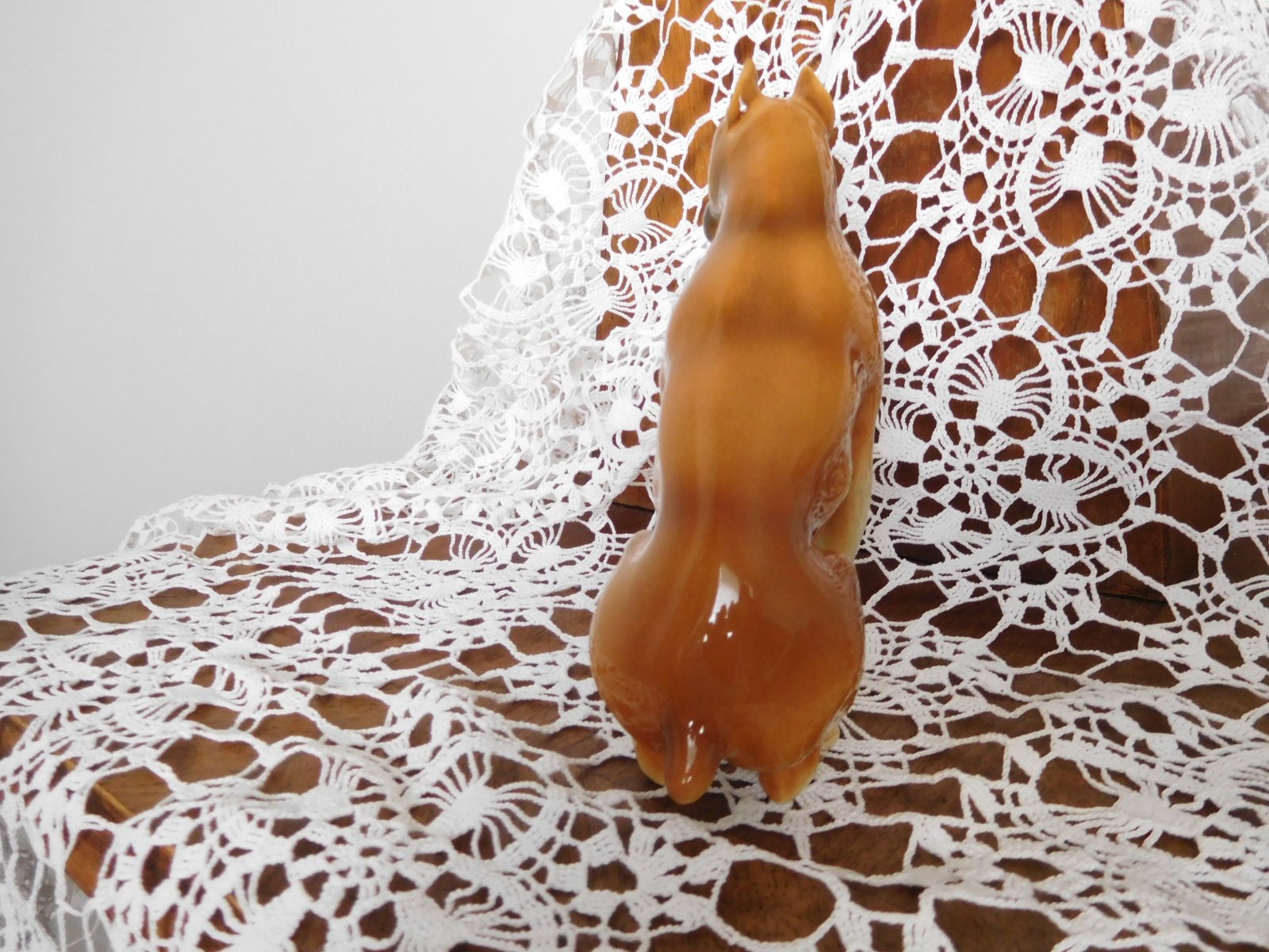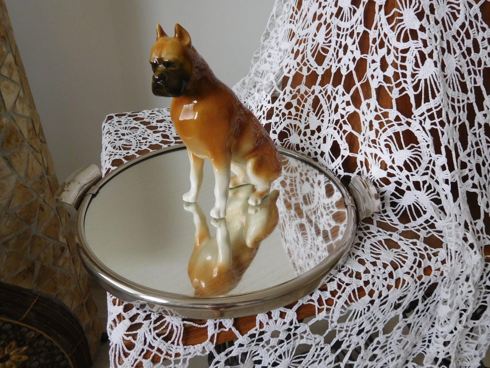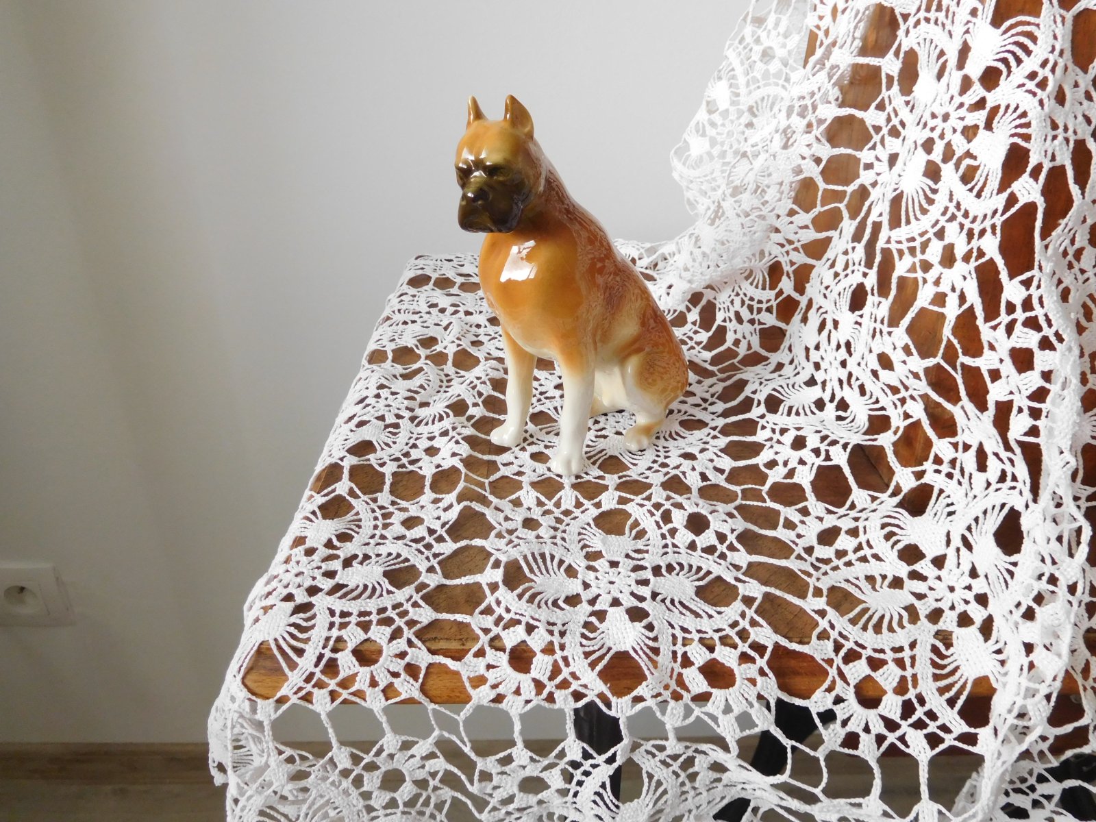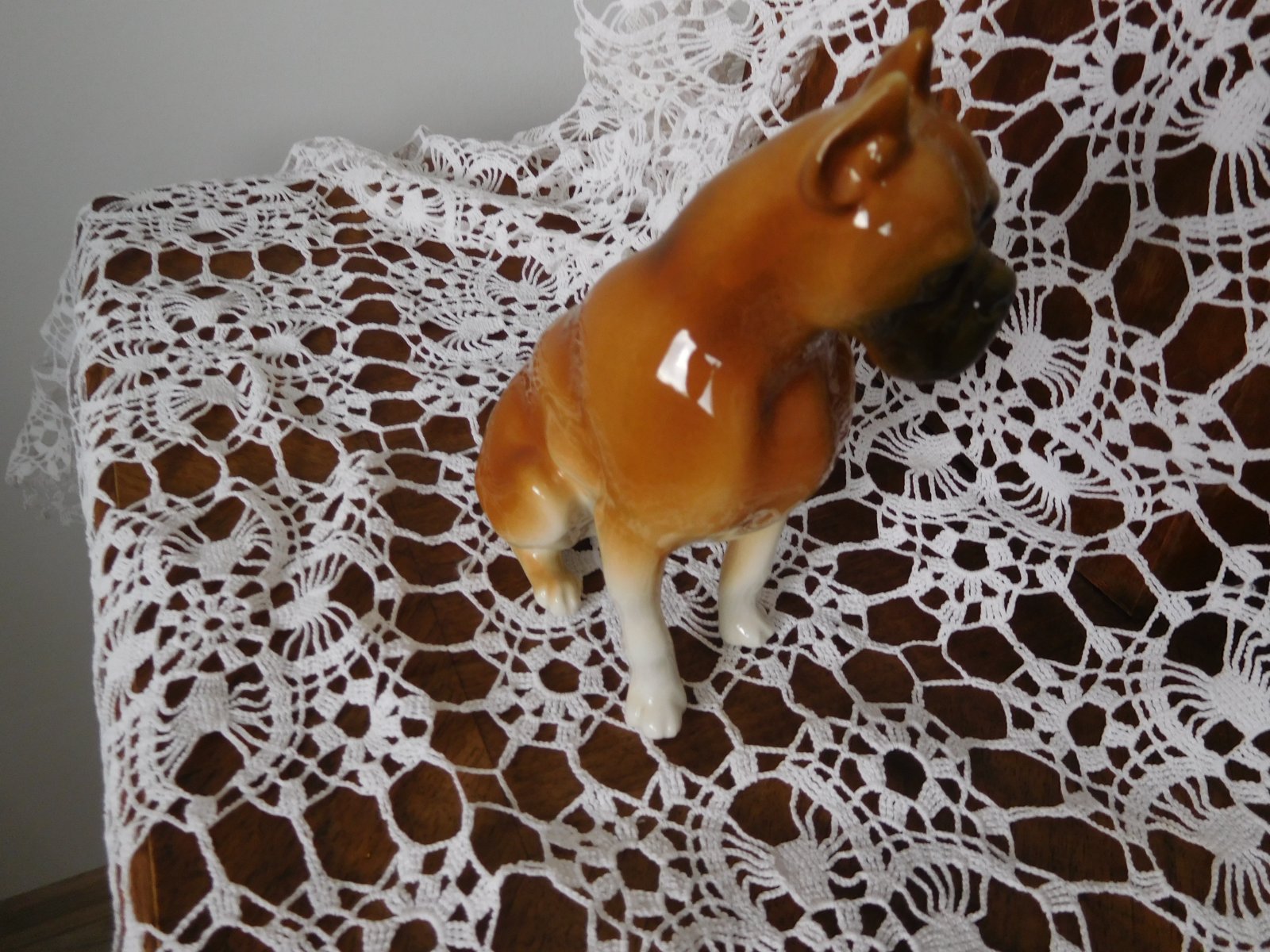 Porcelánová plastika psa boxera od manufaktury Royal Dux. Značená zo spodu plastiky značkou, ktorá sa používala od roku 1960-1978.