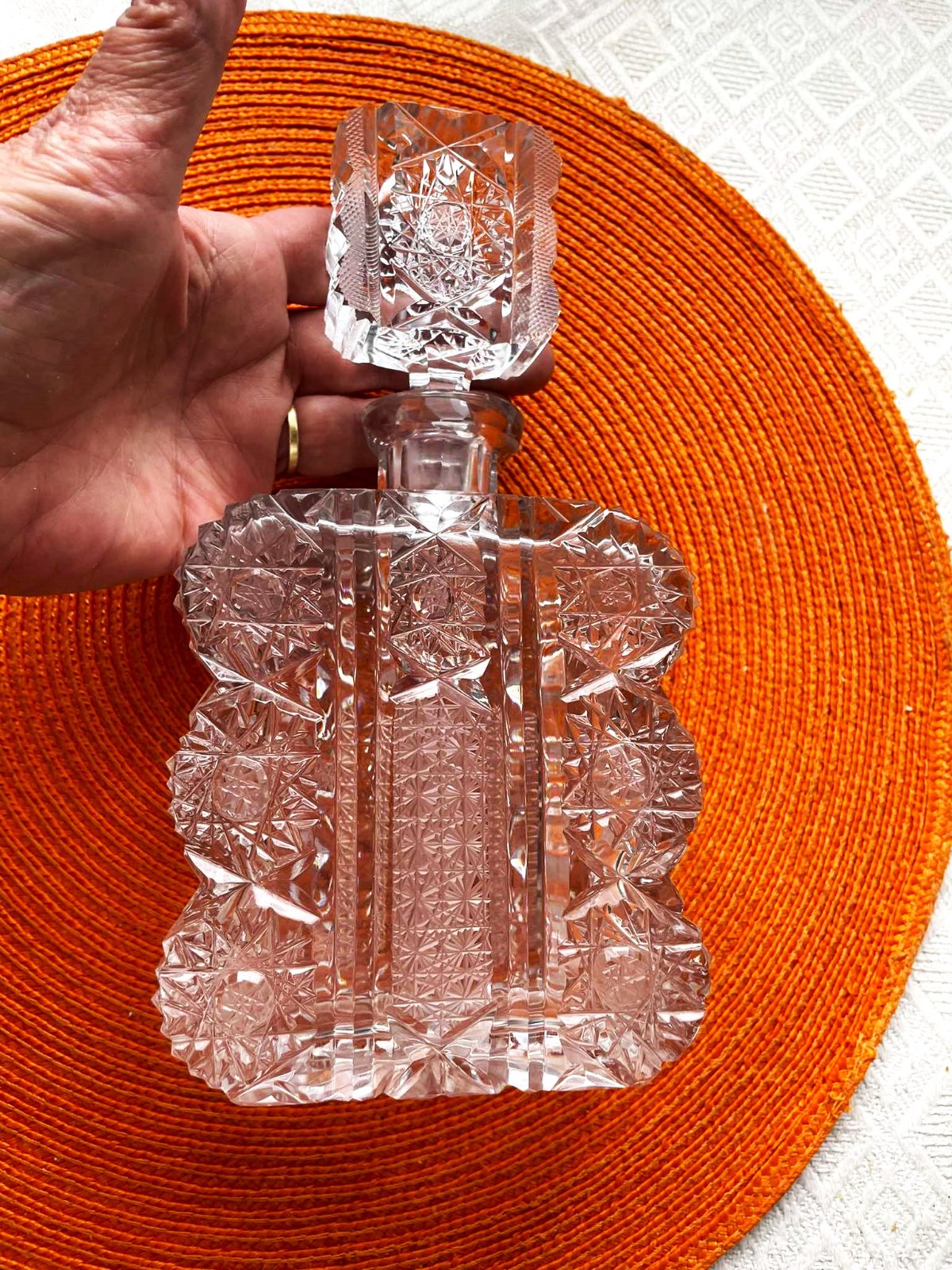 ručne brúsená kryštálová karafa a 6 štamperlíkov na nožičke - Bohemia crystal,s tradičným českým dekórom, vyrobená z bezolovnatého krištáľu,bohatý výbrus,originál Bohemia,top stav - ako nová, bola iba vystavená vo vitrínke,22 x 11 cm, štamperlíky výška = 6 cm,priemer 5 cm