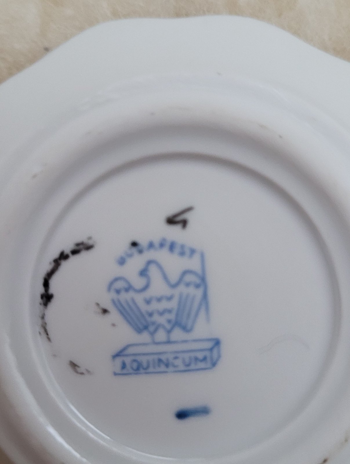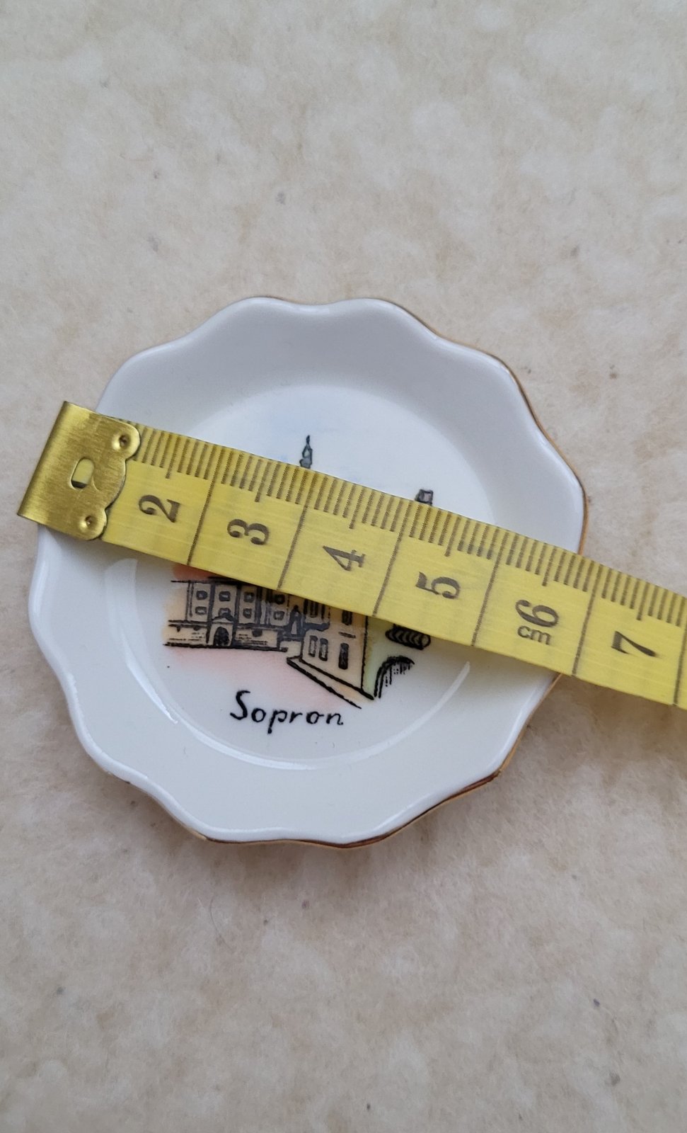 Zberateľský, porcelánový tanierik Aquicum (budapeštiansky porcelán) s motívom mesta Sopron. Má jemne zvlnený okraj s pozlátením. Pochádza z 20. tr. V perfektnom stave.